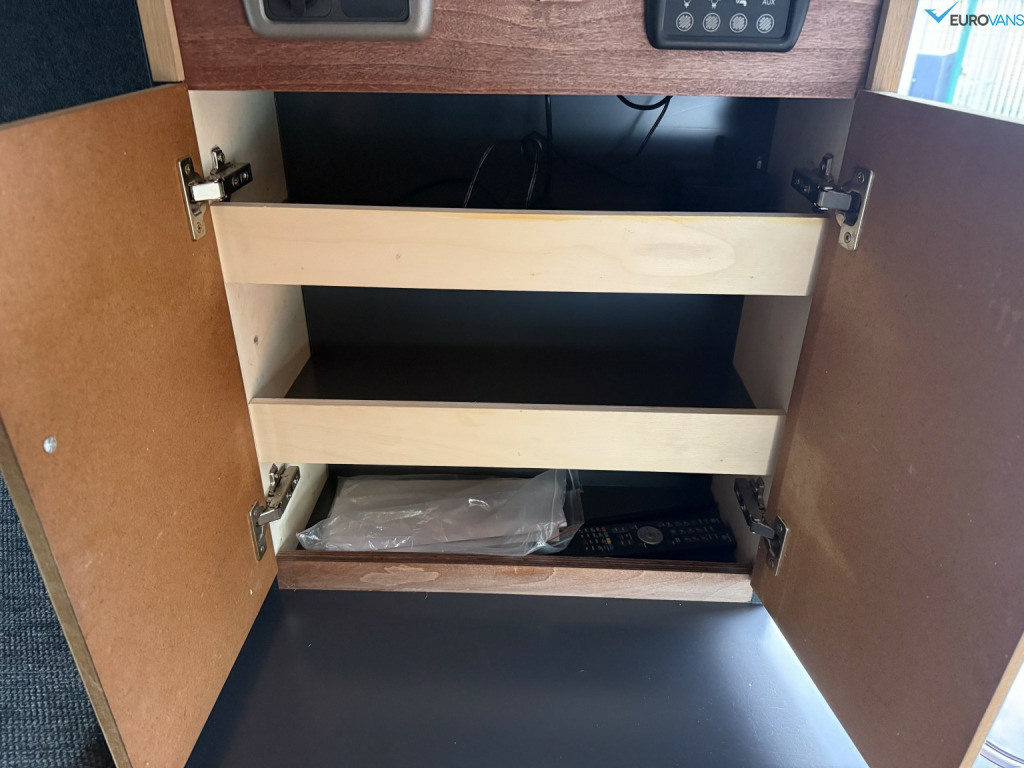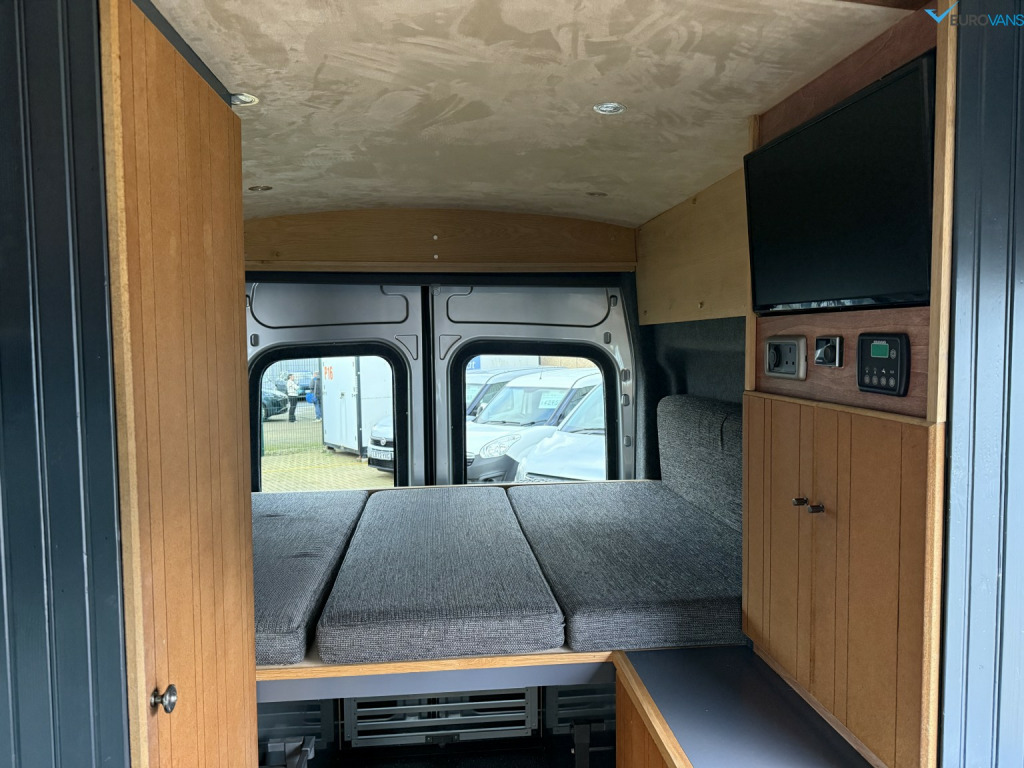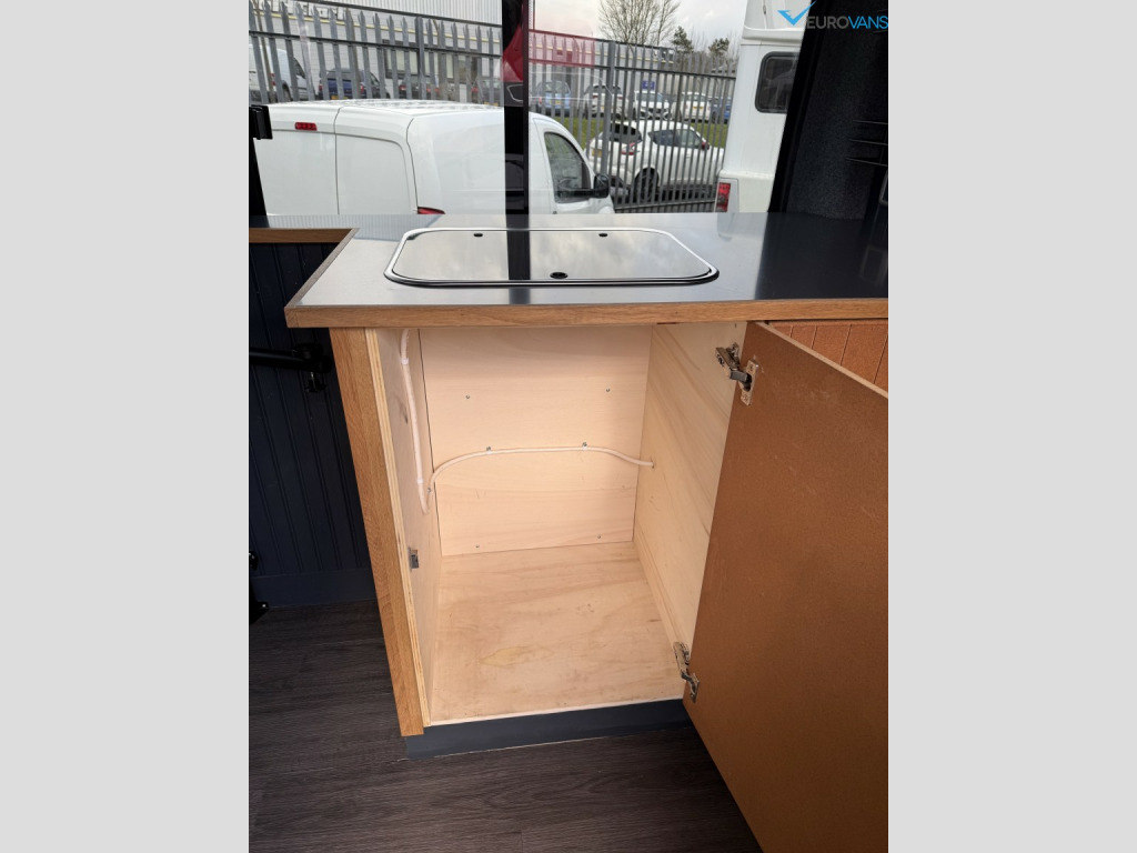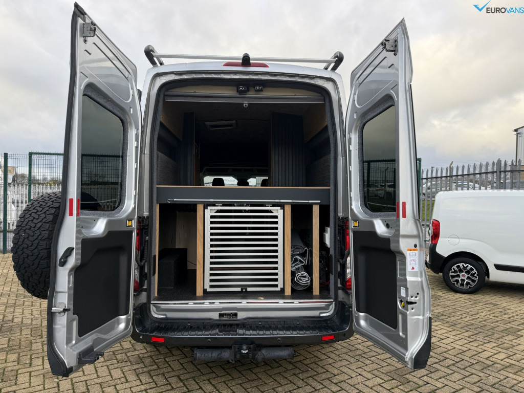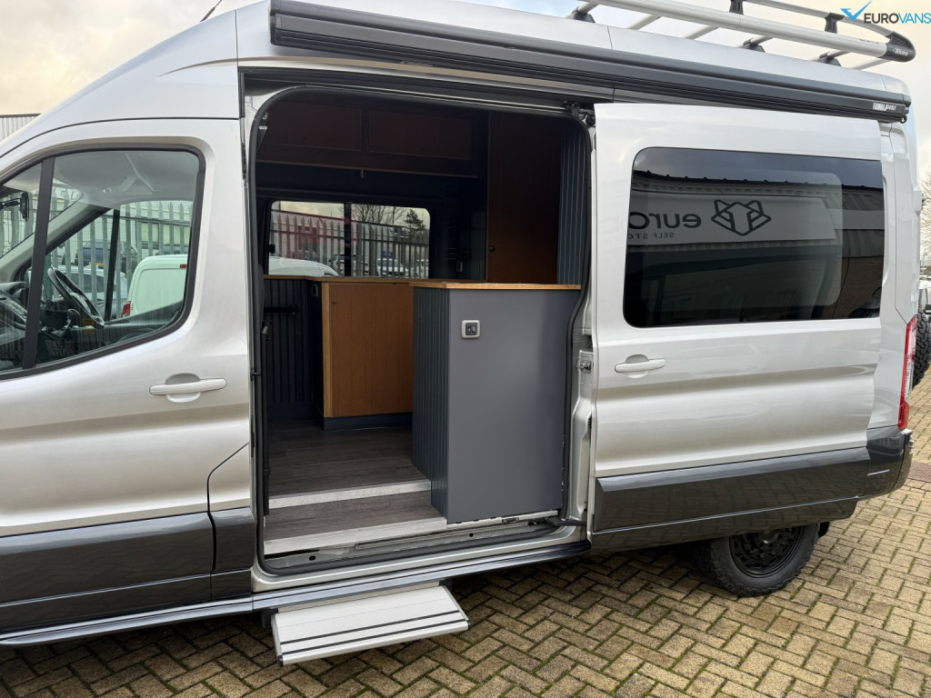 Find another one of these! Factory All Wheel Drive Transit with air conditioning, captains front seats and full Swamper kit including Rogue Alloys with BFG tyres, colour coding, towbar, roof rack, ladder, awning, electric step etc. Comprehensively kitted out internally by a craftsman with high level bed, swivel seats with individual tables, secure storage or dog cages under the bed. It has all the right bits like diesel heating, a recent large capacity LG fridge, gas hob, sink, extractor fan, wifi, proper Cello TV, solar panel, leisure battery etc etc. What a stunning looking van. Off grid, off road camping, here we come!