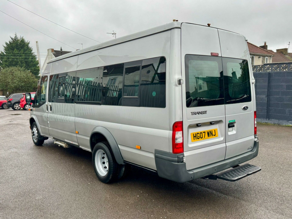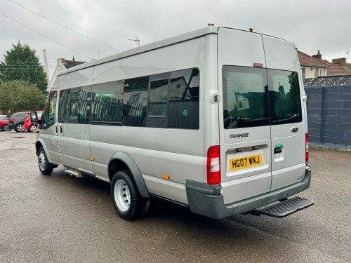 2007 FORD TRANSIT 17 SEAT MINIBUS XLWB. 2.4 LITRE TDCI 115 BHP ENGINE WITH 6 SPEED GEARBOX. ONLY ONE FORMER OWNER FROM NEW (CURRENT SCHOOL OWNER SINCE 2012). AUGUST 2026 MOT (NEW MOT AVAILABLE). REGULARLY SERVICED. 2 KEYS. AIR CONDITIONING. PARKING SENSORS. SIDE SLIDING DOOR. TWIN REAR DOORS. ELECTRIC WINDOWS AND MIRRORS. AUTOMATIC HEADLIGHTS. HEATED FRONT AND REAR WINDOWS. REAR WIPERS. REAR SLIDING WINDOWS. REAR STEP. FM/AM RADIO. CD / RADIO. AUX CONNECTIVITY. STEERING WHEEL CONTROLS. ARM RESTS. CUP HOLDERS. INTERNAL STORAGE. MULTI TRIP COMPUTER. REMOTE CENTRAL LOCKING. PLUS MUCH MORE. NO VAT. ALL VEHICLES UNDERGO A 100 POINT PDI WORKSHOP INSPECTION. NO ADMIN FEES! LOW RATE FINANCE AVAILABLE*. PART EXCHANGE WELCOME. NATIONWIDE DELIVERY AVAILABLE. ALL VIEWINGS ARE BY APPOINTMENT. AVAILABLE MOST DAYS UNTIL 8pm, IF YOU REQUIRE MORE INFORMATION OR WOULD LIKE TO ARRANGE A VIEWING OR HAVE A VIDEO OF THE MINIBUS SENT TO YOURSELF VIA WHATSAPP PLEASE CALL ON 01172795071 OR MESSAGE ON 07487322582 r bag driver, air bag side, anti-lock brakes, armrest, bumpers, central door locking, centre rear seat belt, clock, cup holder, doors - sliding (right), doors - winged, electric windows (front), exterior lighting, exterior mirrors - power operated & heated, extra storage, grab handles, head restraints, heated front screen, immobiliser, in car entertainment (radio/cd autochanger), mirrors external, mirrors internal, power socket, power-assisted steering, rain sensor, rear centre step, rear step, seat height adjustment, side steps, speakers, steel wheels, steering wheel mounted controls (audio), sun visor, tachometer, tinted glass (all round), towing equipment (general), traction control system, trip computer, upholstery cloth, vision pack, windows - front power operated, windscreen wiper