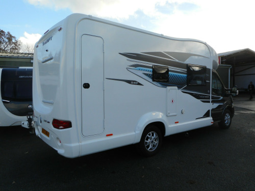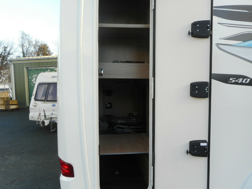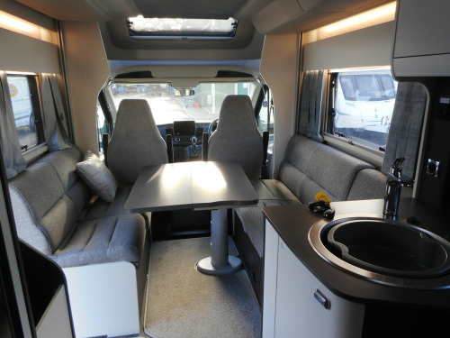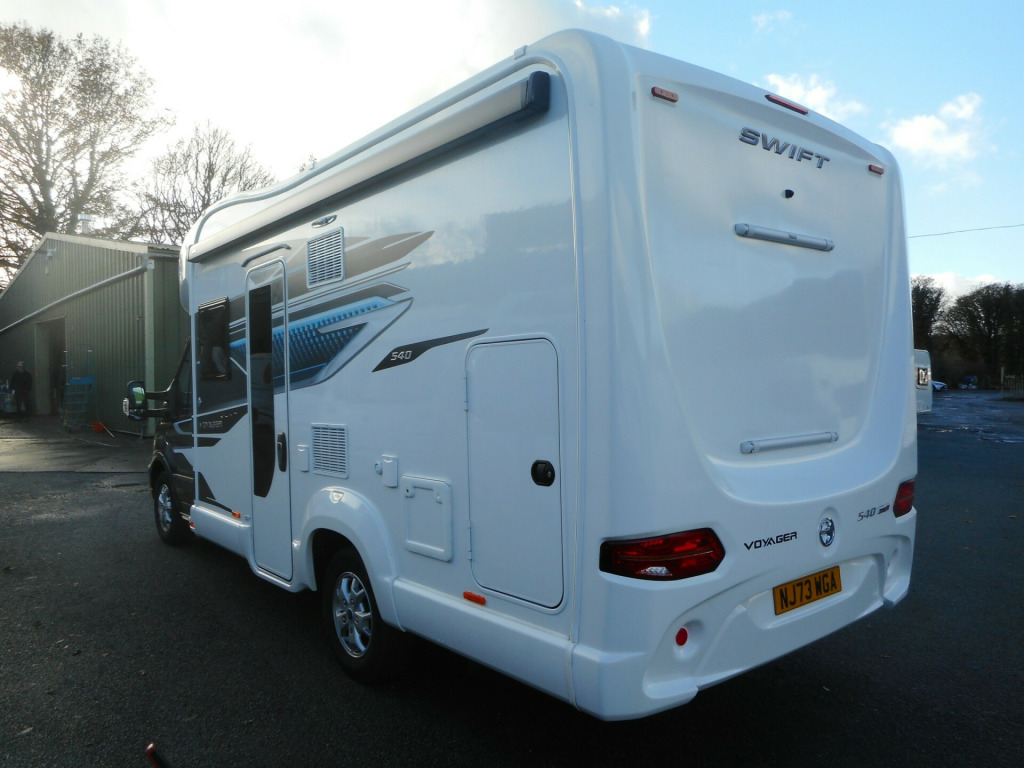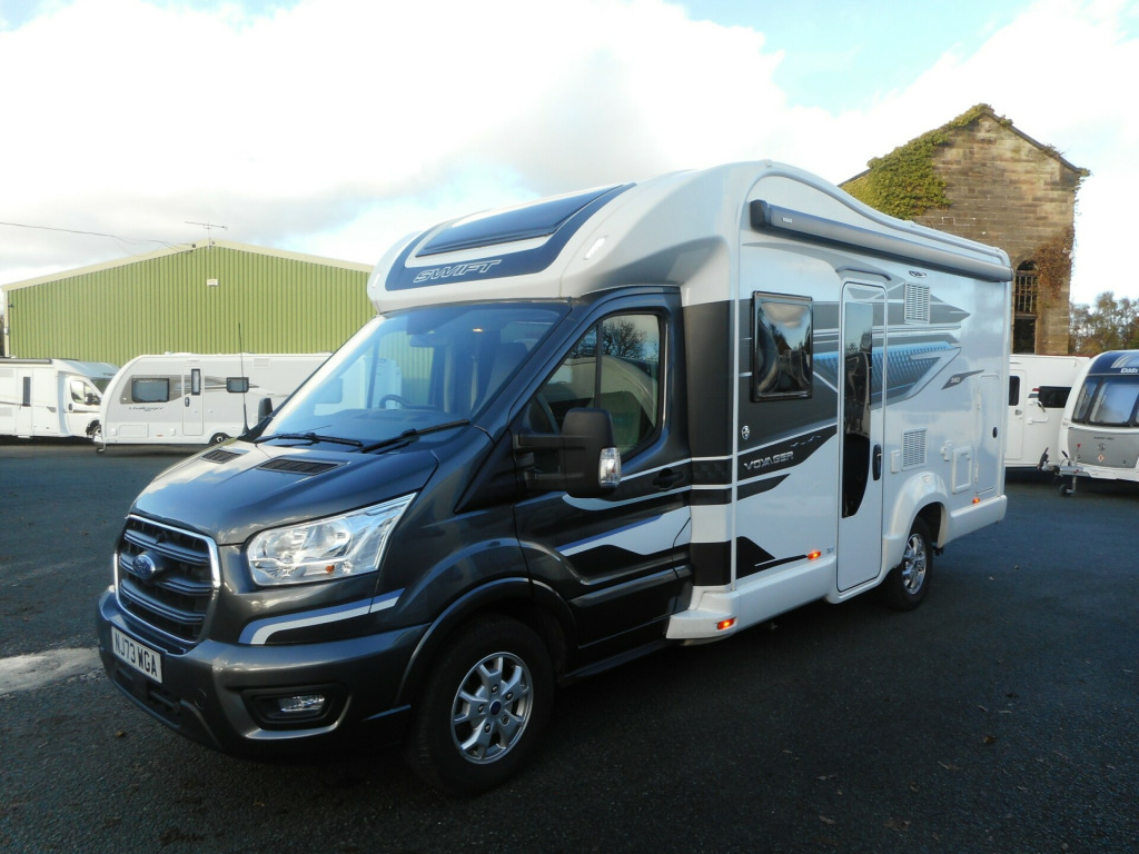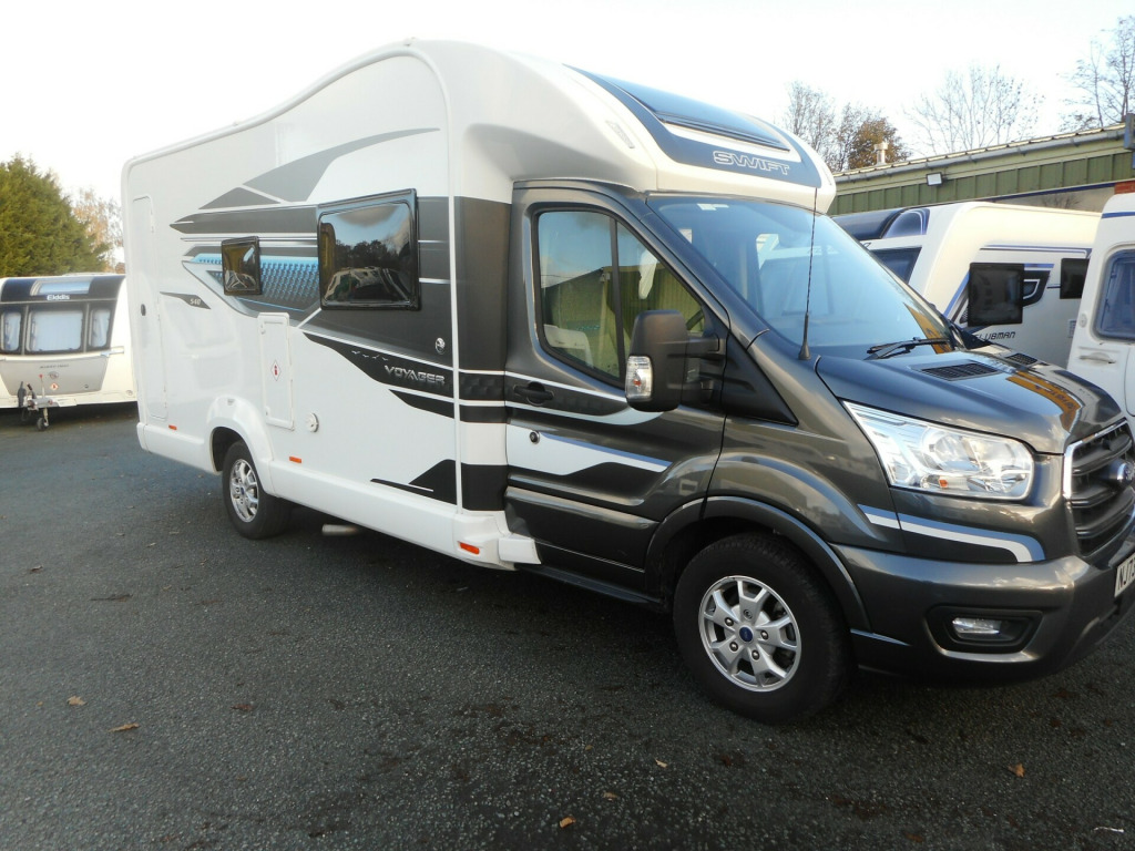 Swift Voyager 540 - this is their 4 BERTH MODEL with a front lounge that turns into a double guest bed and with an ELECTRIC BED over the front lounge. Built on a FORD Euro 6D 155bhp, 2.0 litre TDCi EcoBlue engine, and this model has been upgraded to an *AUTOMATIC* transmission and that can be driven on a Category B Driving licence. This 540 travels four people having the fold-out AGUTI TRAVEL SEATS.The cab benefits from; Zenec Xzent F-285 infotainment system with 9 touchscreen, integrated into dashboard, including DAB/FM RDS Radio with Apple CarplayTM /AndroidLinkTM, USB, Bluetooth and reversing camera image with gridlines, steering wheel controls, Cruise control, Driver and passenger airbags, Manual cab air-conditioning, driver safety features, Start/Stop. This 540 is built with Swift s SMART construction body shell and has a spacious interior with a high level of specification including a fully fitted kitchen and integrated washroom. On board is the Dual fuel Truma combi boiler for excellent heating efficiency.A flexible living space, Revolving captain's chairs plus an electric rise & fall dining table, help to make Voyager the ultimate leisure vehicle for families and people who like to entertain guests. When it s time for a bite to eat, Voyager is ready for action with its Thetford oven and grill, three burner gas hob with electric hotplate, and a tall Dometic fridge with 133 litres of storage space, including a 12 litre removable freezer compartment. The handy rear garage has lighting, heating, sockets, hanging provision and coat hooks with access doors on both sides. Another advantage is the FORD PASS App, allowing you to connect with your Voyager to unlock a wide range of smart features. Get in touch with our expert Sales Team for more information on this pre-owned Swift Voyager 540.