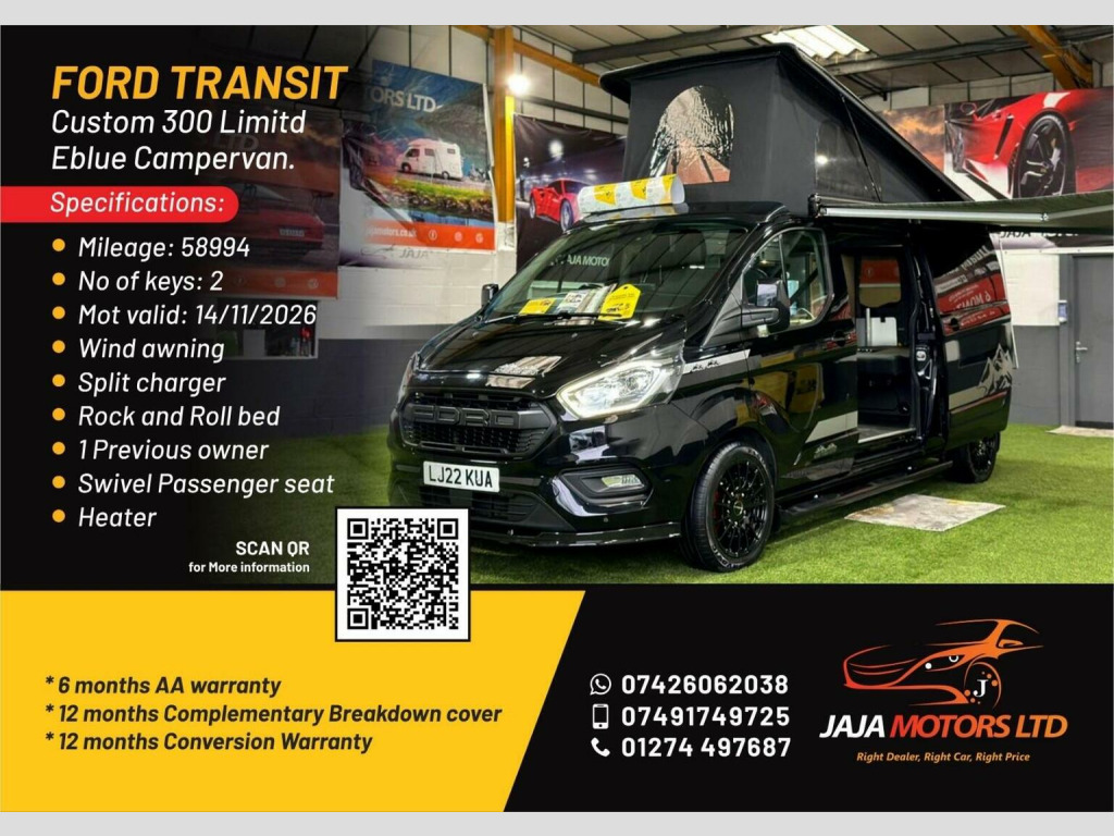 KINDLY WATCH FULL VIDEO, NO VAT WHEN ITS GONE ITS GONE HERE WE HAVE AN OTHER BRAND NEW CONVERSION & VERY STYLISH CAMPER VAN, PART EXCHANGE WELCOME, FINANCE AVAILABLE, FORD TRANSIT CUSTOM 2.0 300 ECOBLUE LIMITED CAMPERVAN 5DR DIESEL MANUAL, LWB EURO (S/S) (130PS), CONVERTED TO A VERY HIGH STANDARD, POP TO ROOF WITH BED, 4 BIRTH, 5 SEATS, VULCAN M1 CRASH TESTED RECLINER ROCK AND ROLL BED, 50L FRIDGE/FREEZER, DOMETIC TWIN BURNER GAS HOB & SINK, TV & LED LIGHTS, VICTRON ORION SPLIT CHARGER, PLUG SOCKETS, USB CHARGING POINT, LEISURE BATTERY, EXTERNAL 240v HOOK UP, GAS BOTTLE WITH LOCKER & COMES WITH SAFETY CERTIFICATE, WATER BOTTLE, SIDE BARS, REMOVABLE DINING TABLE, PRIVACY GLASS ALL AROUND & CURTAINS TO FRONT SIDE WINDOWS AND REAR, FULLY INSULATED, SOUND DEADENED, SOLAR PANEL, INVERTER, HIGH QUALITY YILKAR NIGHT DIESEL HEATER, CBE ELECTRIC TOUCH SCREEN CONTROL PANEL KIT, READING LIGHT, FIAMMA WIND AWNING, THE REAR SEATS CONVERT INTO A ROCK AND ROLL BED (WITH UNDER-STORAGE) AND THE FRONT PASSENGER SEATS SWIVEL TO FACE INWARDS PROVIDING A COSY SOCIABLE SPACE, FULL SERVICE HISTORY, MAINTAINED VERY WELL, 12 MONTHS NATIONWIDE WARRANTY WITH AA, 12 MONTHS COMPLEMENTARY BREAK DOWN COVER WITH AA, 12 MONTHS WARRANTY OF ALL APPLIANCES, COMES WITH FRESH MOT, COVERED 58994 WARRANTED MILEAGE (MOSTLY DONE ON MOTORWAY), ONLY 1 PREVIOUS OWNER, 2 KEYS, DAB, SAT NAV, RADIO, USB, BLUETOOTH, PARKING SENSORS, HEATED FRONT SEATS, PORTA POTTI, POP TOP MATTRESS, HOOK UP CABLE, BRAND NEW 18 inch AALOY WHEELS AND TYRES, JUST DONE FULL SERVICE, TEST DRIVE HIGHLY RECOMMENDED, RESERVE NOW WITH A FULLY REFUNDABLE DEPOSIT, WE ARE AN FCA REGISTERED DEALER, APPROVED DEALER FOR CAR FINANCE 247 & PEGASUS FINANCE, MORE TECHNICAL DETAILS & FEATURES KINDLY VISIT OUR WEBSITE www.jajamotors.co.uk VIEWINGS BY APPOINTMENT ONLY, BUY WITH CONFIDENCE SEE OUR CUSTOMER REVIEWS, NATIONWIDE HOME DELIVERY AVAILABLE, WE ARE OPEN 7 DAYS A WEEK CALL OR TEXT *** 01274497687 *** *** 07426062038 *** ANY TIME***THIS CAMPER-VAN IS HPI ALL CLEAR