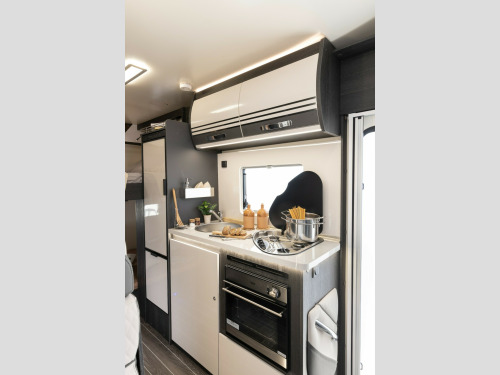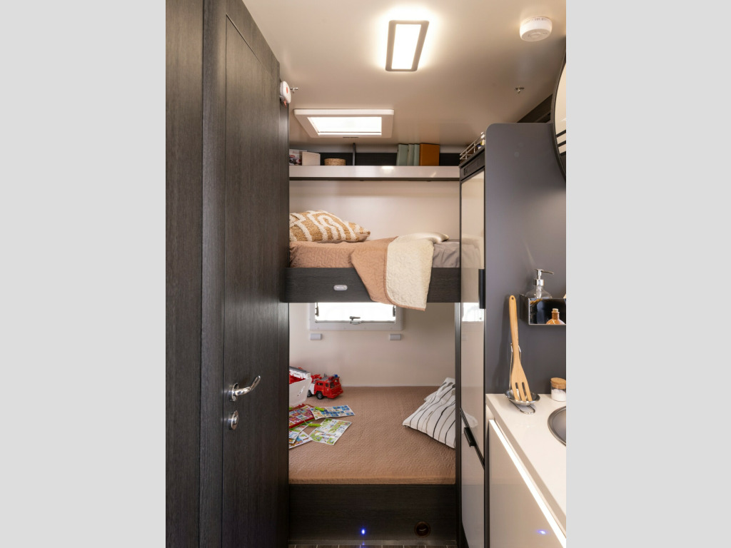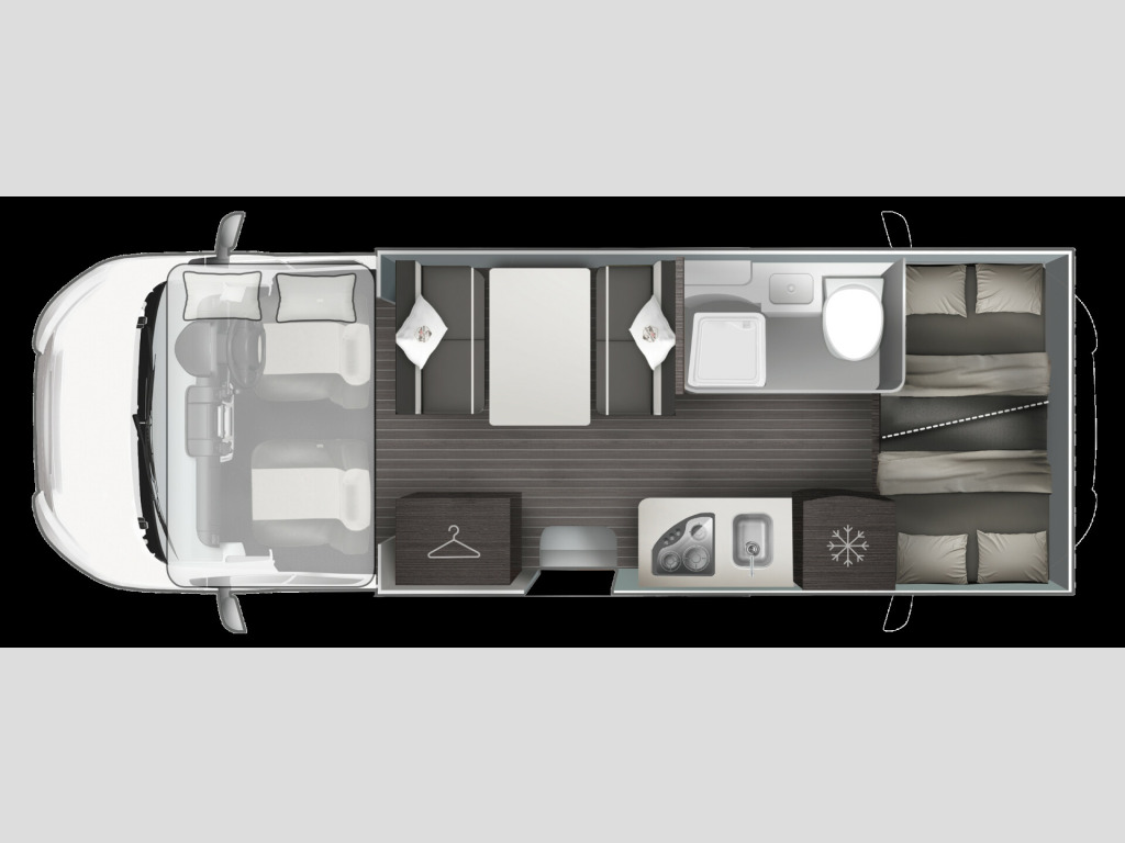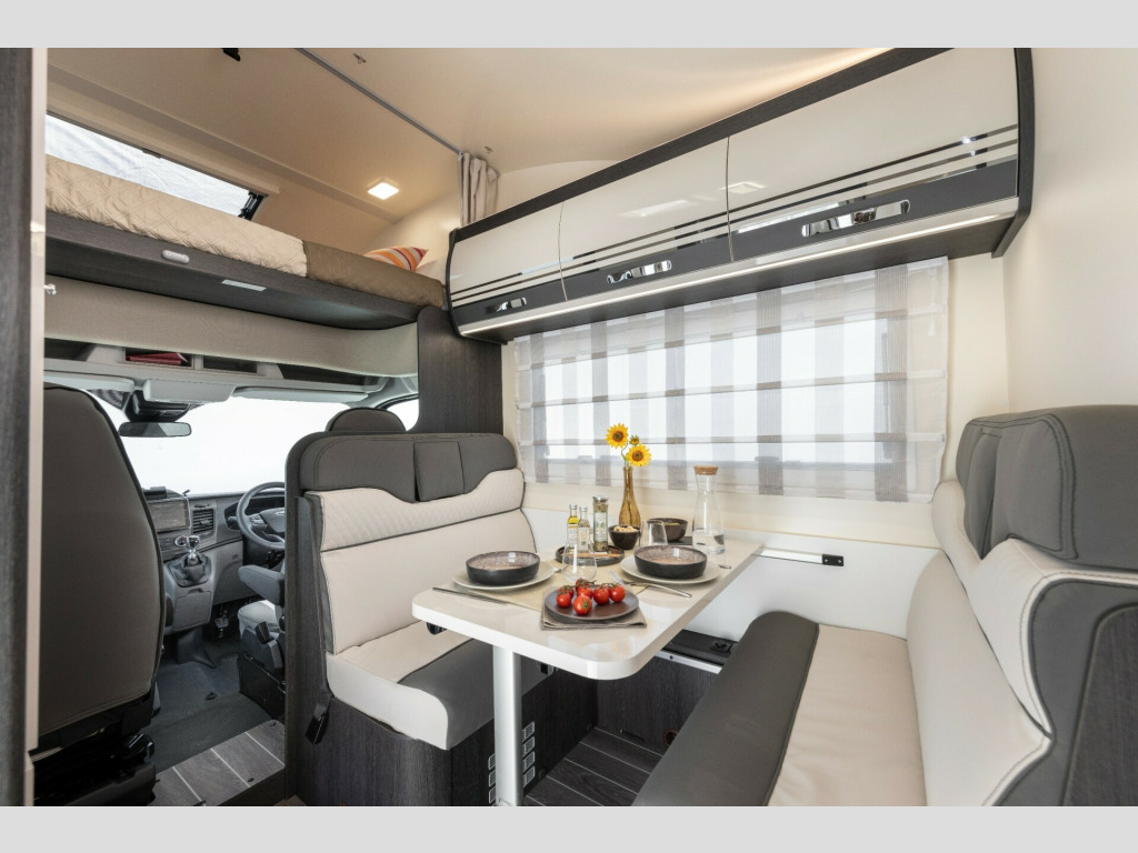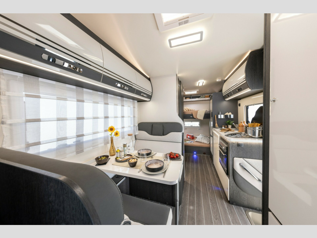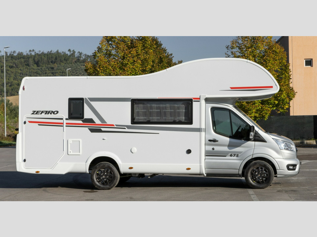 New 2026 Model Zefiro 675 Automatic with 165bhp engine is based on the new Ford Transit chassis with 8 speed automatic transmission and the latest Ford 12'' Infotainent system with Apple Car Play and Android Auto. The 675 has always been popular with families sleeping six with ease and providing a lot of storage thanks to the rear garage and bunk bed system. The dinette area converts to a double bed for evening use. The overcab bed is a very large double and at the rear, the very generous bunk beds provide sleeping for two more. The well equipped kitchen features a 3 gas burner hob, gas oven and grill and a large fridge/freezer. The bathroom opposite has a shower cubicle, cassette type toilet and wash hand basin. Heating and hot water is via a Truma dual fuel system and other features for the Zefiro 675 include: Zefiro Driver's Pack, 200w Solar panel, Thule 4 bike rack, WiFi, External Gas BBQ and Shower points, Front Parking Sensors, Reverse Camera, ISOfix Child Seat Fixings, Pleated Cab Blinds and carpets. L. 6.99, W. 2.3m, H, 3.1m, 3,500kg, 6 berth/5 seat belts, delivery mileage. 0w solar panel with mppt controller, alloy wheels, automatic transmission, cab a/c, carpets, external gas bbq point, external shower point, factory zefiro driver's pack, flyscreen for hab door, ford 12, front parking sensors, iso fix child seat fixings, pleated cab blinds, rear garage, reversing camera, thule 4 bike rack, thule awning, 16'' Alloys