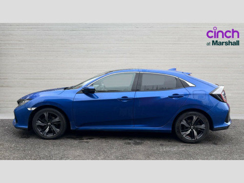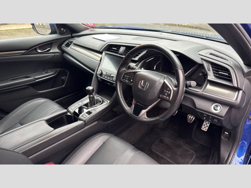 Honda Civic 1.0 VTEC Turbo 126 EX 5dr 7" touch screen, Adaptive cruise control, Apple car play/Android Auto, BLIS (Blind Spot Information System) with dual power heated blind spot mirrors, Blue dashboard illumination, Bluetooth hands free telephone connection, Colour driver's information system display, Easy fuel capless refuelling system, Electric power steering, Emergency stop signalling system, Forward collision warning, Front and rear parking sensors, Lane departure warning system, Lane keep assist, Rear parking camera, Speed limiter, Traffic sign recognition, Adaptive damping system, Vehicle stability assist, 'Shark fin' mobile antenna, 2x USB and HDMI, Auxiliary socket for external MP3 player, Connect with Garmin sat nav, touch screen, internet radio/MP3/CD, Aha app, internet, Digital Audio Broadcast (DAB) Tuner, High power Audio system with 11 Speakers, Steering wheel mounted audio controls, Auto dimming rear view mirror, Automatic coming/leaving home lighting function, Automatic headlights with dusk sensor, Automatic rain sensing wipers, Automatic retractable door mirrors, Black grille, Body colour door handles, Chrome window surround, Electric adjustable heated door mirrors, Electric front/rear windows/one touch operation, Front fog lights, Glass roof, High beam assist, LED daytime running lights, Power foldback door mirrors, Privacy glass, Rear wiper, Remote control door mirrors, Remote window closing, Alloy pedals, Ambient lighting, Boot light, Cargo hooks, Centre console storage and sliding armrest, Driver seat back pocket, Driver's electric lumbar adjustment, Driver's seat height adjustment, Dual climate control air conditioning system, Electric lumbar adjustment on passenger's seat, Front accessory power socket, Front map lights, Front/rear courtesy lights, Glovebox light, Heated front seats, Isofix system on outer rear seats, Leather gear knob, Leather steering wheel, Leather upholstery, Passenger seat back pocket, Rear armrest with cupholder, Sunvisors with illuminated vanity mirrors, Three height adjustable rear head restraints, Tilt/telescopic adjustable steering wheel, Tonneau cover, 5 three point seatbelts, ABS+EBD+Brake assist, Anti-whiplash front headrests, Collision mitigation braking system, Deflation detection system, Dual front SRS airbags, Electronic parking brake with auto hold, Front and rear curtain airbags, Front seatbelt pretensioners, Front side airbags, Hill start assist, Passenger airbag deactivate switch, Tyre pressure warning, ECU immobiliser, Honda super locks, Smart entry + Smart start, Ultrasonic alarm, Tyre repair kit