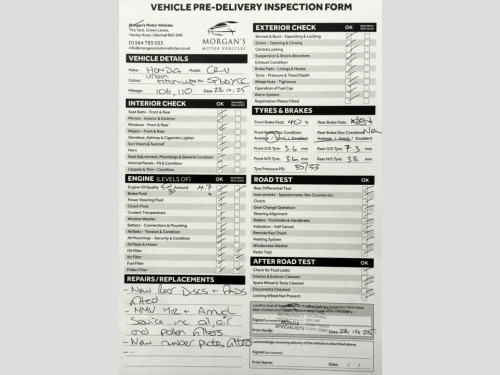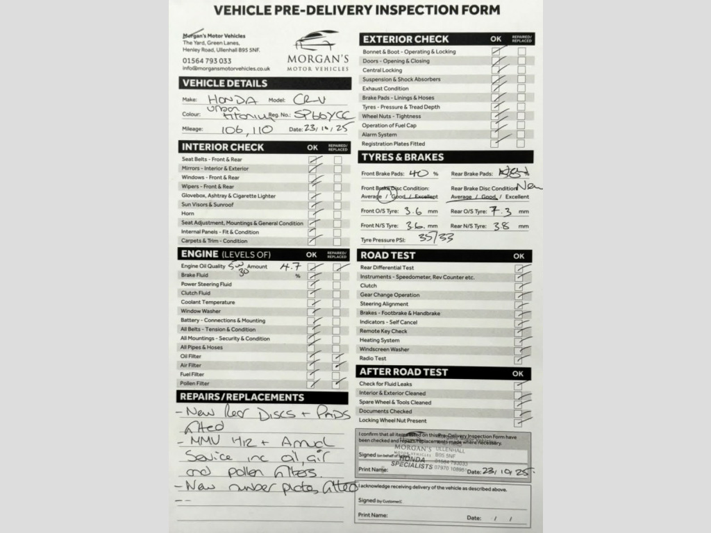 FIRSTLY A BIG THANK YOU for reading this important information. , The fact that you are reading this means you have done your research, and will know by now that Morgans Motor vehicles are regarded nationally as the first place you come to purchase your used Honda. Here we have no silly sales and performance targets, instead we like to offer a very relaxed atmosphere to come and purchase your next vehicle. We believe that having a nice cup of coffee (decent Nespresso coffee I might add) without time restriction is something we offer all our customers. This is a premium level service that you will not receive at most car dealerships and this is something we are proud to offer. , , The Car: This well presented Honda CR-V has just 106,110 miles and just TWO owners from new. She has been extremely well maintained and offers excellent value for money. She comes complete with two original keys and a full service history with 5 service stamps in her portfolio and the 6th service to be completed by ourselves. , Here at Morgans Motor Vehicles we like to offer our AA Dealer promise package (where applicable) which includes 12 Months AA Roadside assistance, a new set of registration plates, a 69 point health inspection, an MMV annual service and new MOT. During this robust process in our 69 point check, we give you a consumable forecast on the perishables such as tyres and brake pads and discs which can be seen on our photos. , Our MMV service consists of checking all lights and levels, as well as adding fully synthetic low ash Valvoline 5W30 Motor oil, a new oil filter air filter and pollen filter (pollen if applicable) to this lovely vehicle. This package is something that very few independents offer, and we believe adds exceptional value and most importantly peace of mind for you our customers . We can confirm that tyres are of good quality across both axles with the brake pads are in good condition with 40% remaining to the front and brand new rear brake discs and pads supplied and fitted by ourselves. To complete our handover we will help the new owner by going through all relevant documents such as the V5 Registration certificate transfer and taxation, and in addition set up 6 months warranty for your convenience. To summarise a fantastic family vehicle with low running costs and insurance, makes the CR-V an excellent purchase. , Please take the time to watch our video and view our high quality definition photos for details we provide that other professionals do not. Here at Morgans Motor Vehicles we pride our ourselves on the customer journey and experience. If you have not bought a vehicle from us before please take the time to read our dealer reviews on Google and Autotrader to get a really good understanding of how we work and how we prepare our vehicles. Our retail prices are examined daily to ensure all our vehicles are accurate to the market and represent best value for our customers. We have worked incredibly hard to get a great reputation based on our customer service and transparency.