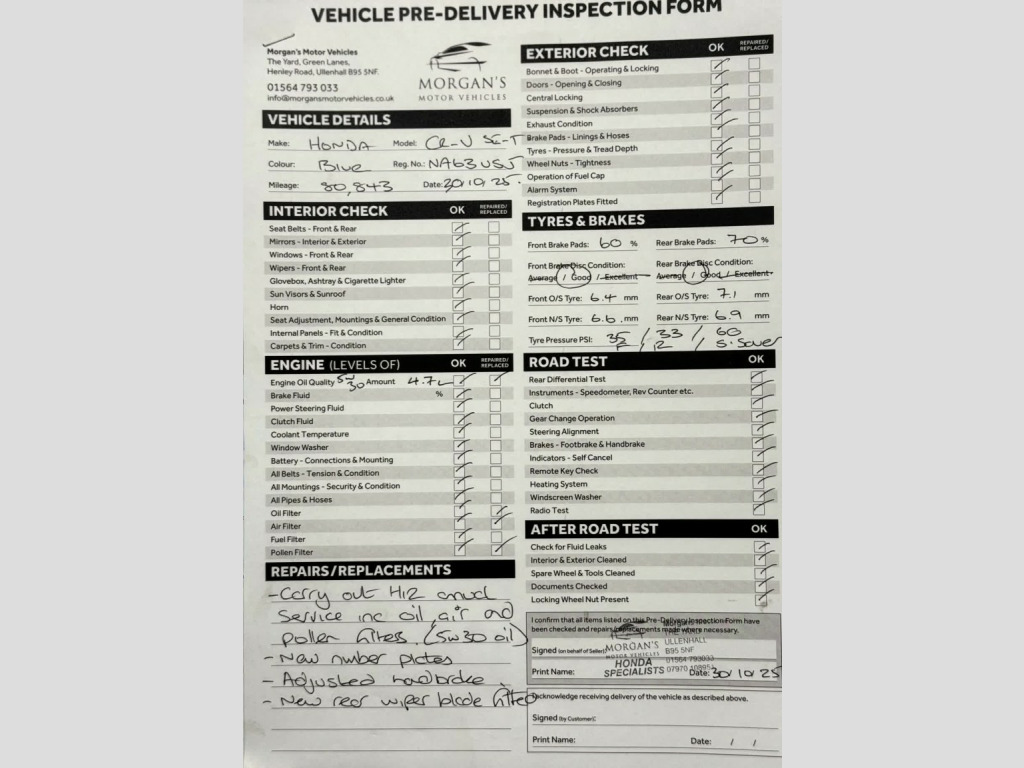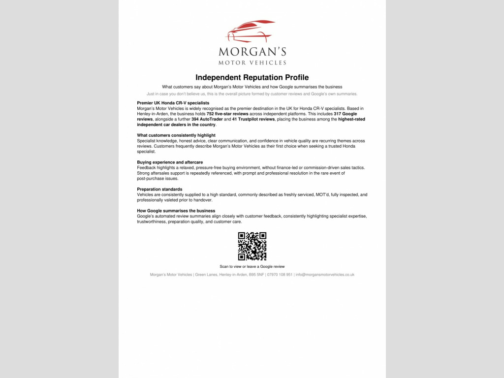 FIRSTLY A BIG THANK YOU FOR READING THIS AND READING OUR REVIEWS!, , FOR A FANTASTIC AND UNIQUE CUSTOMER EXPERIENCE PLEASE PLEASE POP US AN EMAIL OR GIVE US A CALL. , The fact that you are reading this means you have done your research, and will know by now that Morgans Motor vehicles are regarded nationally as the first place you come to purchase your used Honda. Here we have no silly sales and performance targets, instead we like to offer a very relaxed atmosphere to come and purchase your next vehicle. We believe that having a nice cup of coffee (decent Nespresso coffee I might add) without time restriction is something we offer all our customers. This is a premium level service that you will not receive at most car dealerships and this is something we are proud to offer. , , The Car: This well presented Honda CR-V has just 80,834 miles and ONYL TWO owners from new. She has been extremely well maintained and offers excellent value for money. She comes complete with two original keys and a full service history with 4 Honda franchised service stamps in her portfolio and the 5th service to be completed by ourselves. , Here at Morgans Motor Vehicles we like to offer our AA Dealer promise package (where applicable) which includes 12 Months AA Roadside assistance, a new set of registration plates, a 69 point health inspection, an MMV annual service and new MOT. During this robust process in our 69 point check, we give you a consumable forecast on the perishables such as tyres and brake pads and discs which can be seen on our photos. , Our MMV service consists of checking all lights and levels, as well as adding fully synthetic low ash Valvoline 5W30 Motor oil, a new oil filter air filter and pollen filter (pollen if applicable) to this lovely vehicle. This package is something that very few independents offer, and we believe adds exceptional value and most importantly peace of mind for you our customers . We can confirm that tyres are of good quality across both axles with the brake pads and brake discs in healthy condition. To complete our handover we will help the new owner by going through all relevant documents such as the V5 Registration certificate transfer and taxation, and in addition set up 6 months warranty for your convenience. To summarise a fantastic family vehicle with low running costs and insurance, makes the CR-V SE-T an excellent purchase. , Please take the time to watch our video and view our high quality definition photos for details we provide that other professionals do not. Here at Morgans Motor Vehicles we pride our ourselves on the customer journey and experience. If you have not bought a vehicle from us before please take the time to read our dealer reviews on Google and Autotrader to get a really good understanding of how we work and how we prepare our vehicles. Our retail prices are examined daily to ensure all our vehicles are accurate to the market and represent best value for our customers. We have worked incredibly hard to get a great reputation based on our customer service and transparency.
