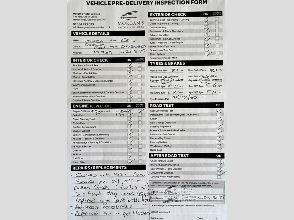 FIRSTLY A BIG THANK YOU for reading this important information. , The fact that you are reading this means you have done your research, and will know by now that Morgans Motor vehicles are regarded nationally as the first place you come to purchase your used Honda. Here we have no silly sales and performance targets, instead we like to offer a very relaxed atmosphere to come and purchase your next vehicle. We believe that having a nice cup of coffee (decent Nespresso coffee I might add) without time restriction is something we offer all our customers. This is a premium level service that you will not receive at most car dealerships and this is something we are proud to offer. , , The Car: This particular Honda CR-V has just 90,769 miles and ONLY ONE OWNER from new. She has been extremely well maintained and offers excellent value for money. She comes complete with two original keys and a full service history with 7 Honda FRANCHISED service stamps in her portfolio and the 8th service to be completed by ourselves. , Here at Morgans Motor Vehicles we like to offer our AA Dealer promise package (where applicable) which includes 12 Months AA Roadside assistance, a new set of registration plates, a 69 point health inspection, an interim service and new MOT. During this robust process in our 69 point check, we give you a consumable forecast on the perishables such as tyres and brake pads and discs which can be seen on our photos. , Our MMV service consists of checking all lights and levels, as well as adding fully synthetic low ash Valvoline 5W30 Motor oil, a new oil filter air filter and pollen filter (pollen if applicable) to this lovely vehicle. This package is something that very few independents offer, and we believe adds exceptional value and most importantly peace of mind for you our customers . We can confirm that tyres are of good quality across both axles with 6.8mm on the front and 5.6mm on the rear. The brake pads are in good condition with 80% remaining to the front and 80% remaining to the rear with the brake discs in healthy condition. To complete our handover we will help the new owner by going through all relevant documents such as the V5 Registration certificate transfer and taxation, and in addition set up 6 months warranty for your convenience. To summarise a fantastic family vehicle with low running costs and insurance, makes the CR-V an excellent purchase. , Please take the time to watch our video and view our high quality definition photos for details we provide that other professionals do not. Here at Morgans Motor Vehicles we pride our ourselves on the customer journey and experience. If you have not bought a vehicle from us before please take the time to read our dealer reviews on Google and Autotrader to get a really good understanding of how we work and how we prepare our vehicles. Our retail prices are examined daily to ensure all our vehicles are accurate to the market and represent best value for our customers. We have worked incredibly hard to get a great reputation based on our customer service and transparency.