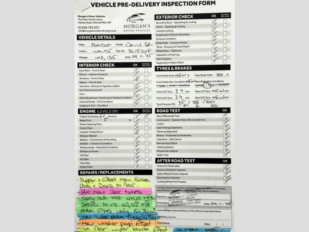FIRSTLY A BIG THANK YOU FOR READING THIS AND READING OUR REVIEWS!, , FOR A FANTASTIC AND UNIQUE CUSTOMER EXPERIENCE PLEASE PLEASE POP US AN EMAIL OR GIVE US A CALL. , The fact that you are reading this means you have done your research, and will know by now that Morgans Motor vehicles are regarded nationally as the first place you come to purchase your used Honda. Here we have no silly sales and performance targets, instead we like to offer a very relaxed atmosphere to come and purchase your next vehicle. We believe that having a nice cup of coffee (decent Nespresso coffee I might add) without time restriction is something we offer all our customers. This is a premium level service that you will not receive at most car dealerships and this is something we are proud to offer. , , The Car: This well presented Honda CR-V has just 102,135 miles and three owners from new. She has been extremely well maintained and offers excellent value for money. She comes complete with impressive service history with 9 service stamps in her portfolio and the 10th service to be completed by ourselves. , Here at Morgans Motor Vehicles we like to offer our AA Dealer promise package (where applicable) which includes 12 Months AA Roadside assistance, a new set of registration plates, a 69 point health inspection, an MMV annual service and new MOT. During this robust process in our 69 point check, we give you a consumable forecast on the perishables such as tyres and brake pads and discs which can be seen on our photos. , Our MMV service consists of checking all lights and levels, as well as adding fully synthetic low ash Valvoline 5W30 Motor oil, a new oil filter air filter and pollen filter (pollen if applicable) to this lovely vehicle. This package is something that very few independents offer, and we believe adds exceptional value and most importantly peace of mind for you our customers . We can confirm that tyres are of good quality across both axles with 3.9mm on the front and two NEW fitted to the rear. We have also fitted new front pads and discs to the front and there is 70% remaining to the rear with the brake discs in healthy condition. To complete our handover we will help the new owner by going through all relevant documents such as the V5 Registration certificate transfer and taxation, and in addition set up 6 months warranty for your convenience. To summarise a fantastic family vehicle with low running costs and insurance, makes the CR-V an excellent purchase. , Please take the time to watch our video and view our high quality definition photos for details we provide that other professionals do not. Here at Morgans Motor Vehicles we pride our ourselves on the customer journey and experience. If you have not bought a vehicle from us before please take the time to read our dealer reviews on Google and Autotrader to get a really good understanding of how we work and how we prepare our vehicles. Our retail prices are examined daily to ensure all our vehicles are accurate to the market and represent best value for our customers. We have worked incredibly hard to get a great reputation based on our customer service and transparency.