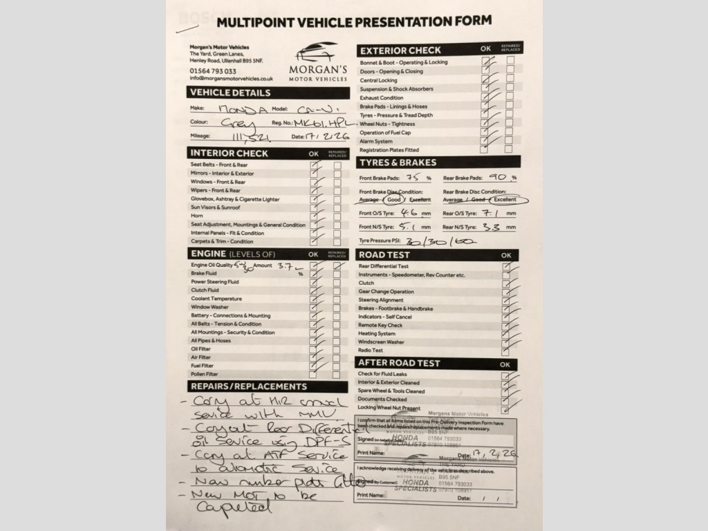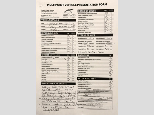 THE CAR, , This well-presented Honda CR-V has covered just 111,502 miles with ONLY TWO owners from new and has clearly been well maintained. It is supplied with its original service history booklet and the next service to be completed by ourselves prior to handover. , Every vehicle at Morgans Motor Vehicles undergoes our MMV preparation process, including a pre-MOT check of lights and levels, fresh fully synthetic Valvoline 5W30 engine oil, new oil filter, air filter, fuel filter (diesel models) and pollen filter (where applicable). , Our uploaded inspection report confirms quality tyres across both axles and strong brakes with discs in healthy condition. , At collection, we personally guide you through the V5 transfer and taxation process to ensure a smooth and straightforward handover. The vehicle is supplied with our 6-month MMV warranty (unlimited mileage) covering engine, gearbox, starter motor and alternator, with upgrade options available if desired. , We operate strictly on an appointment-only basis and believe vehicles should be viewed and inspected in person prior to purchase. , If you value careful preparation, transparency and specialist Honda knowledge, this CR-V will not disappoint. , Please call Morgan your Honda specialist. , At Morgans Motor Vehicles, we do things properly. , • A relaxed, appointment only environment with no pressure, no pushy targets, • Specialist Honda knowledge with carefully selected cars, prepared to a high standard, • A premium, personal experience allowing proper time and proper attention. What you can expect from us:, , • No rushed appointments, • Transparent history and clear communication, • AA Dealer Promise (where applicable):, • Annual service, • Full inspection report, • New MOT if less than 7 months remaining, 12 months AA roadside assistance