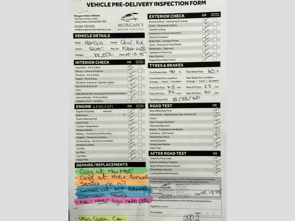 ✔ 12 months AA roadside assistance, Your next Honda deserves care and attention – and so do you. Call or email us today for a stress-free experience. , , THE CAR: This well presented Honda CR-V has just 88,352 miles and three owners from new. She has been extremely well maintained and offers excellent value for money. She comes complete with 2 keys and her original service history booklet 5 service stamps in her portfolio and the 6th service to be completed by ourselves. , Our MMV service consists of a pre MOT checking all lights and levels, as well as adding fully synthetic Valvoline 5W30 Motor oil, a new oil filter air filter and pollen filter (pollen if applicable) to this lovely vehicle. , , Our uploaded photo Inspection form confirms :, , Tyres are of good quality across both axles with 7.2mm on the front and 6/8mm on the rear. , Brake pads are in good condition with 80% remaining to the front and 60% remaining to the rear with the brake discs in healthy condition. , , To complete our handover we will help the new owner by going through all relevant documents such as the V5 Registration certificate transfer and taxation, and discuss our 6 month MMV warranty for your convenience. , PLEASE CALL MORGAN YOUR FRIENDLY HONDA EXPERT