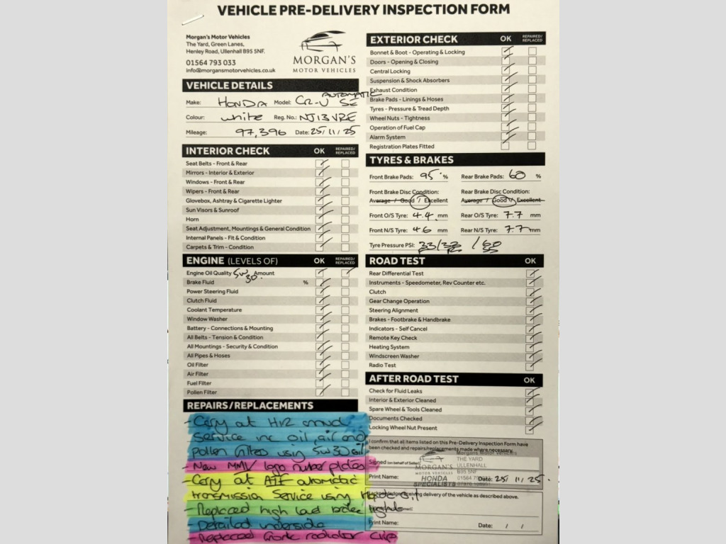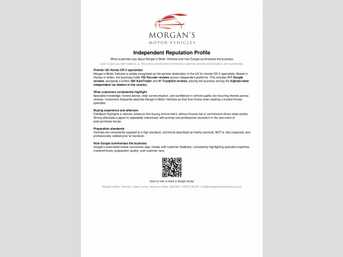 FIRSTLY A BIG THANK YOU FOR READING THIS AND READING OUR REVIEWS!, , FOR A FANTASTIC AND UNIQUE CUSTOMER EXPERIENCE PLEASE PLEASE POP US AN EMAIL OR GIVE US A CALL. , The fact that you are reading this means you have done your research, and will know by now that Morgans Motor vehicles are regarded nationally as the first place you come to purchase your used Honda. Here we have no silly sales and performance targets, instead we like to offer a very relaxed atmosphere to come and purchase your next vehicle. We believe that having a nice cup of coffee (decent Nespresso coffee I might add) without time restriction is something we offer all our customers. This is a premium level service that you will not receive at most car dealerships and this is something we are proud to offer. , , The Car: This well presented Honda CR-V has just 97,396 miles and three owners from new. She has been extremely well maintained and offers excellent value for money. She comes complete with two original keys and a full service history with 10 service stamps in her portfolio and the 11th service to be completed by ourselves. , Here at Morgans Motor Vehicles we like to offer our AA Dealer promise package (where applicable) which includes 12 Months AA Roadside assistance, a new set of registration plates, a 69 point health inspection, an MMV annual service and new MOT. During this robust process in our 69 point check, we give you a consumable forecast on the perishables such as tyres and brake pads and discs which can be seen on our photos. , Our MMV service consists of checking all lights and levels, as well as adding fully synthetic low ash Valvoline 5W30 Motor oil, a new oil filter air filter and pollen filter (pollen if applicable) to this lovely vehicle. This package is something that very few independents offer, and we believe adds exceptional value and most importantly peace of mind for you our customers . We can confirm that tyres are of good quality across both axles with 4.4 mm on the front and 7.7 mm on the rear. The brake pads are in good condition with 95% remaining to the front and 60% remaining to the rear with the brake discs in healthy condition. To complete our handover we will help the new owner by going through all relevant documents such as the V5 Registration certificate transfer and taxation, and in addition set up 6 months warranty for your convenience. To summarise a fantastic family vehicle with low running costs and insurance, makes the CR-V an excellent purchase. , Please take the time to watch our video and view our high quality definition photos for details we provide that other professionals do not. Here at Morgans Motor Vehicles we pride our ourselves on the customer journey and experience. If you have not bought a vehicle from us before please take the time to read our dealer reviews on Google and Autotrader to get a really good understanding of how we work and how we prepare our vehicles. Our retail prices are examined daily to ensure all our vehicles are accurate to the market and represent best value for our customers. We have worked incredibly hard to get a great reputation based on our customer service and transparency.
