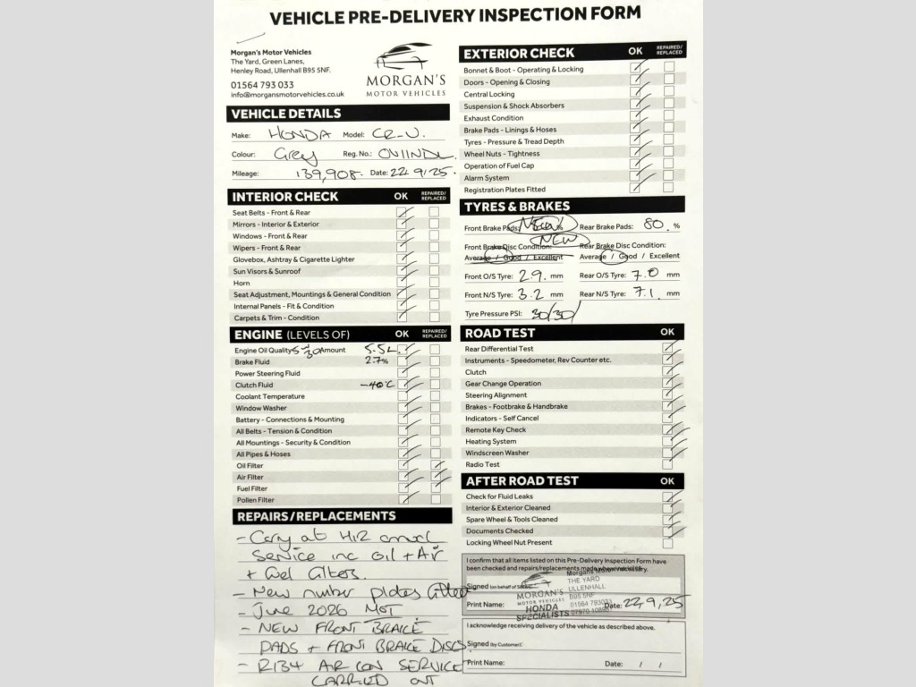 FIRSTLY A BIG THANK YOU for reading this important information. , The fact that you are reading this means you have done your research, and will know by now that Morgans Motor vehicles are regarded nationally as the first place you come to purchase your used Honda. Here we have no silly sales and performance targets, instead we like to offer a very relaxed atmosphere to come and purchase your next vehicle. We believe that having a nice cup of coffee (decent Nespresso coffee I might add) without time restriction is something we offer all our customers. This is a premium level service that you will not receive at most car dealerships and this is something we are proud to offer. , , The Car: This well presented Honda CR-V has just 139,908 miles and three owners from new. She has been extremely well maintained and offers excellent value for money. She comes complete with two original keys and a full service history with 12 service stamps in her portfolio and the 13th service to be completed by ourselves. , Here at Morgans Motor Vehicles we like to offer our AA Dealer promise package (where applicable) which includes 12 Months AA Roadside assistance, a new set of registration plates, a 69 point health inspection, an interim service and JUNE 2026 MOT. During this robust process in our 69 point check, we give you a consumable forecast on the perishables such as tyres and brake pads and discs which can be seen on our photos. , Our MMV service consists of checking all lights and levels, as well as adding fully synthetic low ash Valvoline 5W30 Motor oil, a new oil filter air filter and pollen filter (pollen if applicable) to this lovely vehicle. This package is something that very few independents offer, and we believe adds exceptional value and most importantly peace of mind for you our customers . We can confirm that tyres are of good quality across both axles with 3 mm on the front and 7.0 mm on the rear. The brake pads are in good condition with new pads front and 80 % remaining to the rear with the brake discs in healthy condition. To complete our handover we will help the new owner by going through all relevant documents such as the V5 Registration certificate transfer and taxation, and in addition set up 6 months warranty for your convenience. To summarise a fantastic family vehicle with low running costs and insurance, makes the CR-V an excellent purchase. , Please take the time to watch our video and view our high quality definition photos for details we provide that other professionals do not. Here at Morgans Motor Vehicles we pride our ourselves on the customer journey and experience. If you have not bought a vehicle from us before please take the time to read our dealer reviews on Google and Autotrader to get a really good understanding of how we work and how we prepare our vehicles. Our retail prices are examined daily to ensure all our vehicles are accurate to the market and represent best value for our customers. We have worked incredibly hard to get a great reputation based on our customer service and transparency.