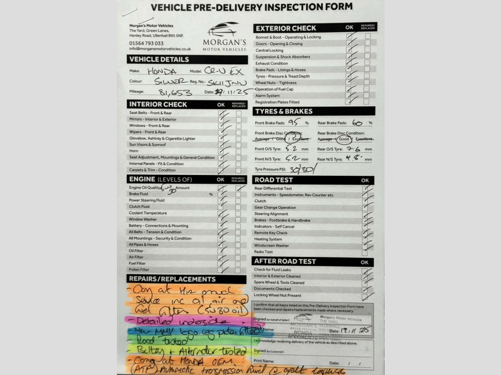 FIRSTLY A BIG THANK YOU FOR READING THIS AND READING OUR REVIEWS!, , FOR A FANTASTIC AND UNIQUE CUSTOMER EXPERIENCE PLEASE PLEASE POP US AN EMAIL OR GIVE US A CALL. , The fact that you are reading this means you have done your research, and will know by now that Morgans Motor vehicles are regarded nationally as the first place you come to purchase your used Honda. Here we have no silly sales and performance targets, instead we like to offer a very relaxed atmosphere to come and purchase your next vehicle. We believe that having a nice cup of coffee (decent Nespresso coffee I might add) without time restriction is something we offer all our customers. This is a premium level service that you will not receive at most car dealerships and this is something we are proud to offer. , , The Car: This well presented Honda CR-V has just 81,649 miles from new. She has been extremely well maintained and offers excellent value for money. She comes complete with two original keys and service history booklet with 6 service stamps in her portfolio and the 7th service to be completed by ourselves. , Here at Morgans Motor Vehicles we like to offer our AA Dealer promise package (where applicable) which includes 12 Months AA Roadside assistance, a new set of registration plates, a 69 point health inspection, an MMV annual service and new MOT. During this robust process in our 69 point check, we give you a consumable forecast on the perishables such as tyres and brake pads and discs which can be seen on our photos. , Our MMV service consists of checking all lights and levels, as well as adding fully synthetic low ash Valvoline 5W30 Motor oil, a new oil filter air filter and pollen filter (pollen if applicable) to this lovely vehicle. This package is something that very few independents offer, and we believe adds exceptional value and most importantly peace of mind for you our customers . We can confirm that tyres are of good quality across both axles with the brake pads and brake discs in healthy condition. To complete our handover we will help the new owner by going through all relevant documents such as the V5 Registration certificate transfer and taxation, and in addition set up 6 months warranty for your convenience. To summarise a fantastic family vehicle with low running costs and insurance, makes the CR-V an excellent purchase. , Please take the time to watch our video and view our high quality definition photos for details we provide that other professionals do not. Here at Morgans Motor Vehicles we pride our ourselves on the customer journey and experience. If you have not bought a vehicle from us before please take the time to read our dealer reviews on Google and Autotrader to get a really good understanding of how we work and how we prepare our vehicles. Our retail prices are examined daily to ensure all our vehicles are accurate to the market and represent best value for our customers. We have worked incredibly hard to get a great reputation based on our customer service and transparency.