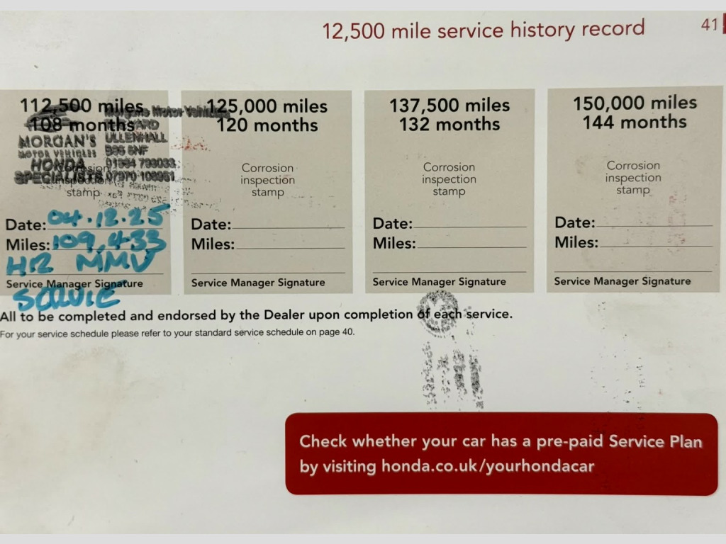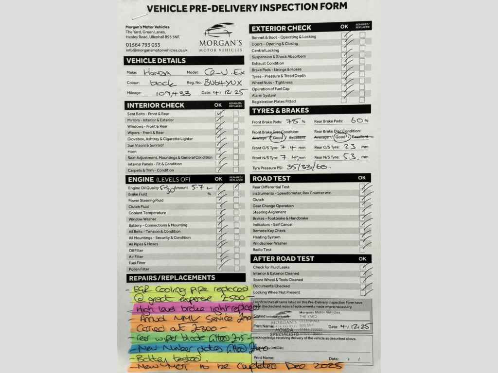 ✔ 12 months AA roadside assistance, Your next Honda deserves care and attention – and so do you. Call or email us today for a stress-free experience. , , THE CAR: This well presented Honda CR-V has just 109,436 miles and ONLY TWO owners from new. She has been extremely well maintained and offers excellent value for money. Our MMV service consists of a pre MOT checking all lights and levels, as well as adding fully synthetic Valvoline 5W30 Motor oil, a new oil filter air filter and fuel filter to this lovely vehicle. , , Our uploaded photo Inspection form confirms :, , Tyres are of good quality across both axles. , Brake pads are in good condition with the brake discs in healthy condition. , , To complete our handover we will help the new owner by going through all relevant documents such as the V5 Registration certificate transfer and taxation, and discuss our 6 month MMV warranty for your convenience. , PLEASE CALL MORGAN YOUR FRIENDLY HONDA EXPERT