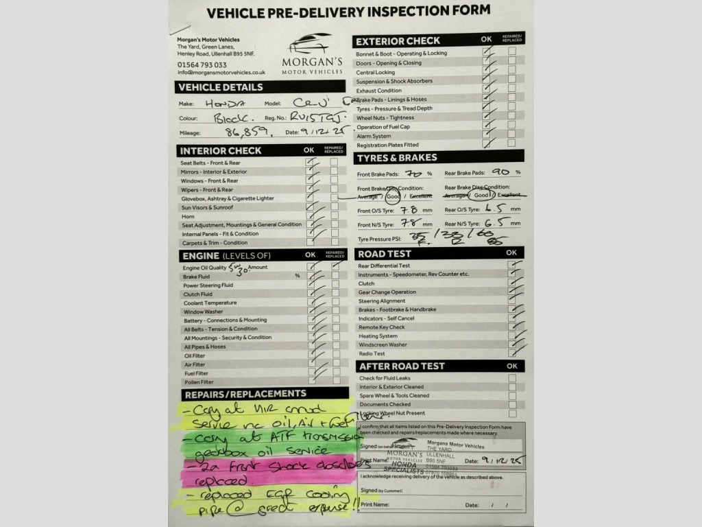 , ✔ 12 months AA roadside assistance, Your next Honda deserves care and attention – and so do you. Call or email us today for a stress-free experience. , , THE CAR: This well presented Honda CR-V has just 86,859 miles from new. She has been extremely well maintained and offers excellent value for money. She comes complete her original service history booklet 9 service stamps in her portfolio and the 10th service to be completed by ourselves. , Our MMV service consists of a pre MOT checking all lights and levels, as well as adding fully synthetic Valvoline 5W30 Motor oil, a new oil filter air filter and pollen filter (pollen if applicable) to this lovely vehicle. , , Our uploaded photo Inspection form confirms :, , Tyres are of good quality across both axles with 7.8 mm on the front and 6.5mm on the rear. , Brake pads are in good condition with 70% remaining to the front and 90% remaining to the rear with the brake discs in healthy condition. , , To complete our handover we will help the new owner by going through all relevant documents such as the V5 Registration certificate transfer and taxation, and discuss our 6 month MMV warranty for your convenience. , PLEASE CALL MORGAN YOUR FRIENDLY HONDA EXPERT