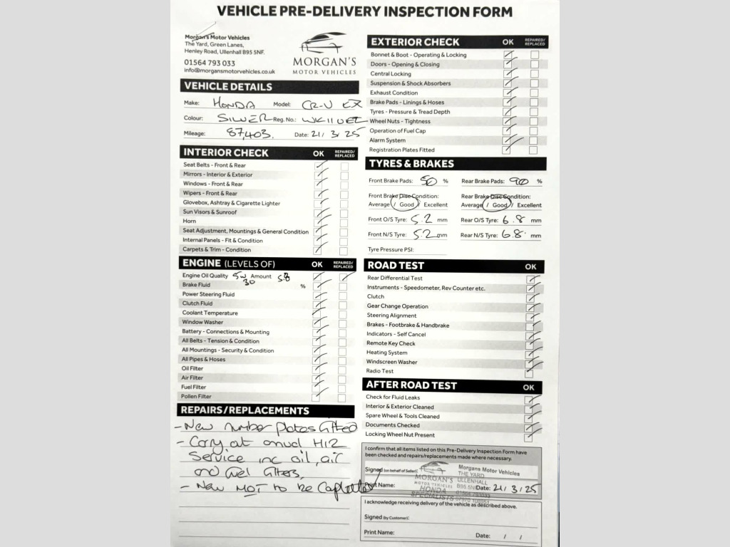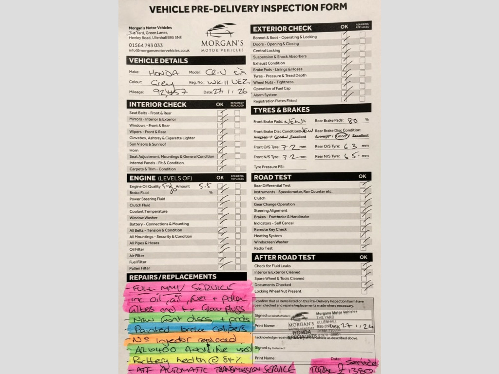 , ✔ 12 months AA roadside assistance, Your next Honda deserves care and attention – and so do you. Call or email us today for a stress-free experience. , , THE CAR: This well presented Honda CR-V has just 92,457 miles owners from new. She has been extremely well maintained and offers excellent value for money. She comes complete her original service history booklet 13 service stamps in her portfolio and the 14th service to be completed by ourselves. , Our MMV service consists of a pre MOT checking all lights and levels, as well as adding fully synthetic Valvoline 5W30 Motor oil, a new oil filter air filter and pollen filter and fuel filter along with 4 brand new Bosch glow plugs to this lovely vehicle. We have also carried our the all important ATF transmission fluid service costing a grand total of £1380 has been seen on the major service to this vehicle!, , , Our uploaded photo Inspection form confirms :, , Tyres are of good quality across both axles with 7.2mm on the front and 6.3mm on the rear. , Brake pads and discs to the front been replaced by ourselves as parts of the service and there is 80% to the rear with the brake discs in healthy condition. , , To complete our handover we will help the new owner by going through all relevant documents such as the V5 Registration certificate transfer and taxation, and discuss our 6 month MMV warranty for your convenience. , PLEASE CALL MORGAN YOUR FRIENDLY HONDA EXPERT