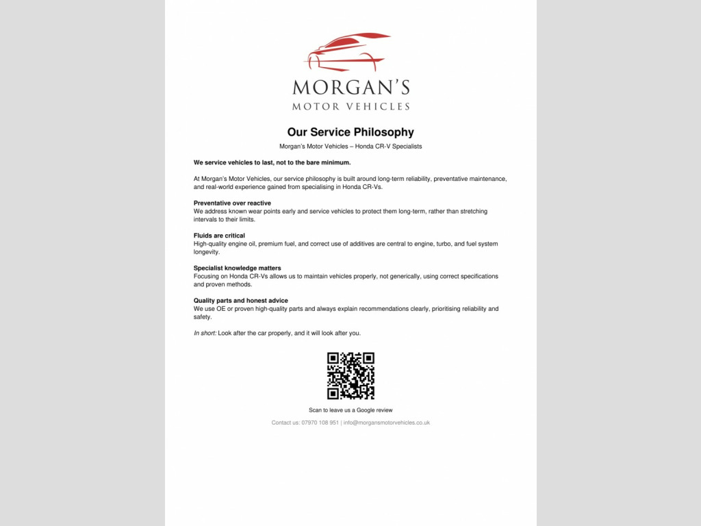 Thank you for checking us out and reading our reviews!, At Morgans Motor Vehicles, we do things differently:, Relaxed, friendly atmosphere – no pushy sales targets. Expert Honda knowledge – every car prepared to the highest standard. Premium experience – enjoy a proper Nespresso coffee while we help you find the right car. , Were proud to offer:, No time limits on appointments, Transparent service history, AA Dealer Promise (where applicable):