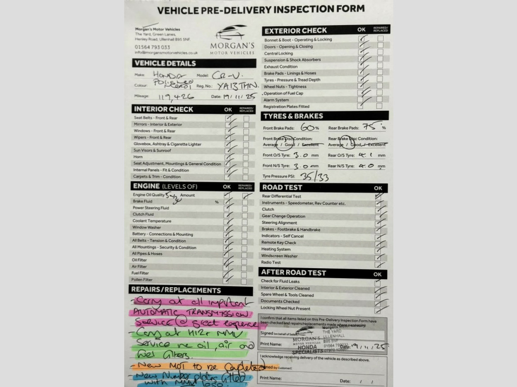 FIRSTLY A BIG THANK YOU FOR READING THIS AND READING OUR REVIEWS!, , FOR A FANTASTIC AND UNIQUE CUSTOMER EXPERIENCE PLEASE PLEASE POP US AN EMAIL OR GIVE US A CALL. , The fact that you are reading this means you have done your research, and will know by now that Morgans Motor vehicles are regarded nationally as the first place you come to purchase your used Honda. Here we have no silly sales and performance targets, instead we like to offer a very relaxed atmosphere to come and purchase your next vehicle. We believe that having a nice cup of coffee (decent Nespresso coffee I might add) without time restriction is something we offer all our customers. This is a premium level service that you will not receive at most car dealerships and this is something we are proud to offer. , , The Car: This well presented Honda CR-V has just 119,426 miles and three owners from new. She has been extremely well maintained and offers excellent value for money. She comes complete with two original keys and a full service history with 10 Honda service stamps in her portfolio and the 11th service to be completed by ourselves. , Here at Morgans Motor Vehicles we like to offer our AA Dealer promise package (where applicable) which includes 12 Months AA Roadside assistance, a new set of registration plates, a 69 point health inspection, an MMV annual service and new MOT. During this robust process in our 69 point check, we give you a consumable forecast on the perishables such as tyres and brake pads and discs which can be seen on our photos. , Our MMV service consists of checking all lights and levels, as well as adding fully synthetic low ash Valvoline 5W30 Motor oil, a new oil filter air filter and pollen filter (pollen if applicable) to this lovely vehicle. This package is something that very few independents offer, and we believe adds exceptional value and most importantly peace of mind for you our customers . We can confirm that tyres are of good quality across both axles with 3mm on the front and 4mm on the rear. The brake pads are in good condition with 60.% remaining to the front and 75% remaining to the rear with the brake discs in healthy condition. To complete our handover we will help the new owner by going through all relevant documents such as the V5 Registration certificate transfer and taxation, and in addition set up 6 months warranty for your convenience. To summarise a fantastic family vehicle with low running costs and insurance, makes the CR-V automatic an excellent purchase. , Please take the time to watch our video and view our high quality definition photos for details we provide that other professionals do not. Here at Morgans Motor Vehicles we pride our ourselves on the customer journey and experience. If you have not bought a vehicle from us before please take the time to read our dealer reviews on Google and Autotrader to get a really good understanding of how we work and how we prepare our vehicles. Our retail prices are examined daily to ensure all our vehicles are accurate to the market and represent best value for our customers. We have worked incredibly hard to get a great reputation based on our customer service and transparency.