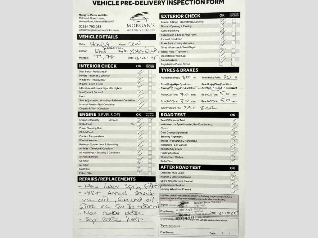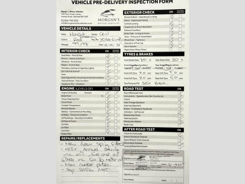 FIRSTLY A BIG THANK YOU FOR READING THIS AND READING OUR REVIEWS!, , FOR A FANTASTIC AND UNIQUE CUSTOMER EXPERIENCE PLEASE PLEASE POP US AN EMAIL OR GIVE US A CALL. , The fact that you are reading this means you have done your research, and will know by now that Morgans Motor vehicles are regarded nationally as the first place you come to purchase your used Honda. Here we have no silly sales and performance targets, instead we like to offer a very relaxed atmosphere to come and purchase your next vehicle. We believe that having a nice cup of coffee (decent Nespresso coffee I might add) without time restriction is something we offer all our customers. This is a premium level service that you will not receive at most car dealerships and this is something we are proud to offer. , , The Car: This well presented Honda CR-V has just 99,200 miles and TWO owners from new. She has been extremely well maintained and offers excellent value for money. She comes complete with two original keys and a full service history with 5 service stamps in her portfolio and the 6th service to be completed by ourselves. , Here at Morgans Motor Vehicles we like to offer our AA Dealer promise package (where applicable) which includes 12 Months AA Roadside assistance, a new set of registration plates, a 69 point health inspection, an MMV annual service and September 2026 MOT. During this robust process in our 69 point check, we give you a consumable forecast on the perishables such as tyres and brake pads and discs which can be seen on our photos. , Our MMV service consists of checking all lights and levels, as well as adding fully synthetic low ash Valvoline 5W30 Motor oil, a new oil filter air filter and pollen filter (pollen if applicable) to this lovely vehicle. This package is something that very few independents offer, and we believe adds exceptional value and most importantly peace of mind for you our customers . We can confirm that tyres are of good quality across both axles with the brake pads and brake discs in healthy condition. To complete our handover we will help the new owner by going through all relevant documents such as the V5 Registration certificate transfer and taxation, and in addition set up 6 months warranty for your convenience. To summarise a fantastic family vehicle with low running costs and insurance, makes the CR-V an excellent purchase. , Please take the time to watch our video and view our high quality definition photos for details we provide that other professionals do not. Here at Morgans Motor Vehicles we pride our ourselves on the customer journey and experience. If you have not bought a vehicle from us before please take the time to read our dealer reviews on Google and Autotrader to get a really good understanding of how we work and how we prepare our vehicles. Our retail prices are examined daily to ensure all our vehicles are accurate to the market and represent best value for our customers. We have worked incredibly hard to get a great reputation based on our customer service and transparency.