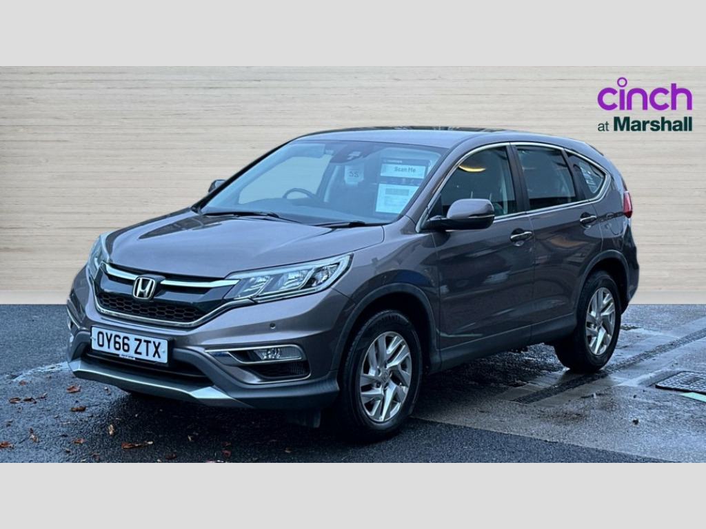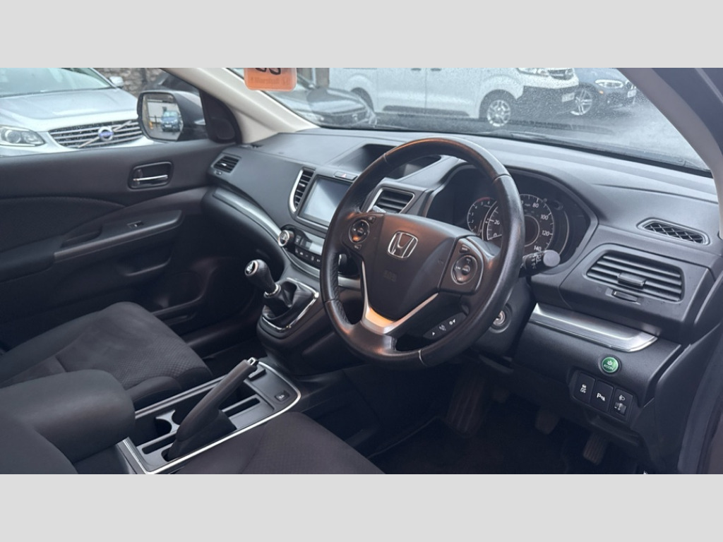 Honda CR-V 1.6 i-DTEC 160 SE 5dr Bluetooth hands free telephone connection, Connect with 7" touchscreen, Digital Radio, Mp3, Aha app integration, internet browsing, Cruise control, Electric power steering, Front and rear parking sensors, Intelligent multi info display, Rear view camera, Service interval indicator, Speed limiter, Vehicle stability assist, 6 speakers, Steering wheel mounted controls, USB/iPod connection, Aspheric door mirrors, Auto dimming rear view mirror, Automatic headlights with dusk sensor, Body colour bumpers, Body colour door handles, Chrome rear garnish, Daytime running lights, Door mirrors tilt when reversing, Electric front windows/one touch facility, Electric rear windows + one touch facility, Electrically adjustable and heated door mirrors, Electrically retractable door mirrors, Front fog lights, Rain sensor, Rear wiper, Shark fin roof aerial, Trailer stability assist, Welcome home function, 60/40 split folding rear seat, Accessory sockets, Ambient interior lighting, Boot light, Cargo hooks, Chrome interior door handles, Cloth upholstery, Courtesy lights, Driver's electric adjustable lumbar support, Driver/passenger sunvisors with illuminated vanity mirrors, Dual zone automatic climate control, Front centre armrest, Front map lights, Front seatback pockets, Height adjustable driver's seat, Illuminated glovebox, Illuminated ignition switch, Isofix child seat preparation, Leather steering wheel and gear knob, Rear air vents, Rear centre armrest, Rear headrests, Rear seat conversation mirror, Sunglasses holder, Tilt/telescopic adjustable steering wheel, Tonneau cover, 5 x 3 point seatbelts, ABS/EBD, Anti-whiplash front headrests, Brake assist function, City safety braking system, Deflation detection system, Dual front SRS airbags, Front and rear curtain airbags, Front side airbags, Hill start assist, Passenger airbag deactivate switch, Seatbelt warning, Honda super locks, Immobiliser, Remote central locking with 2 remote folding keys, Security alarm, Brushed alloy inlays, Temporary spare wheel
