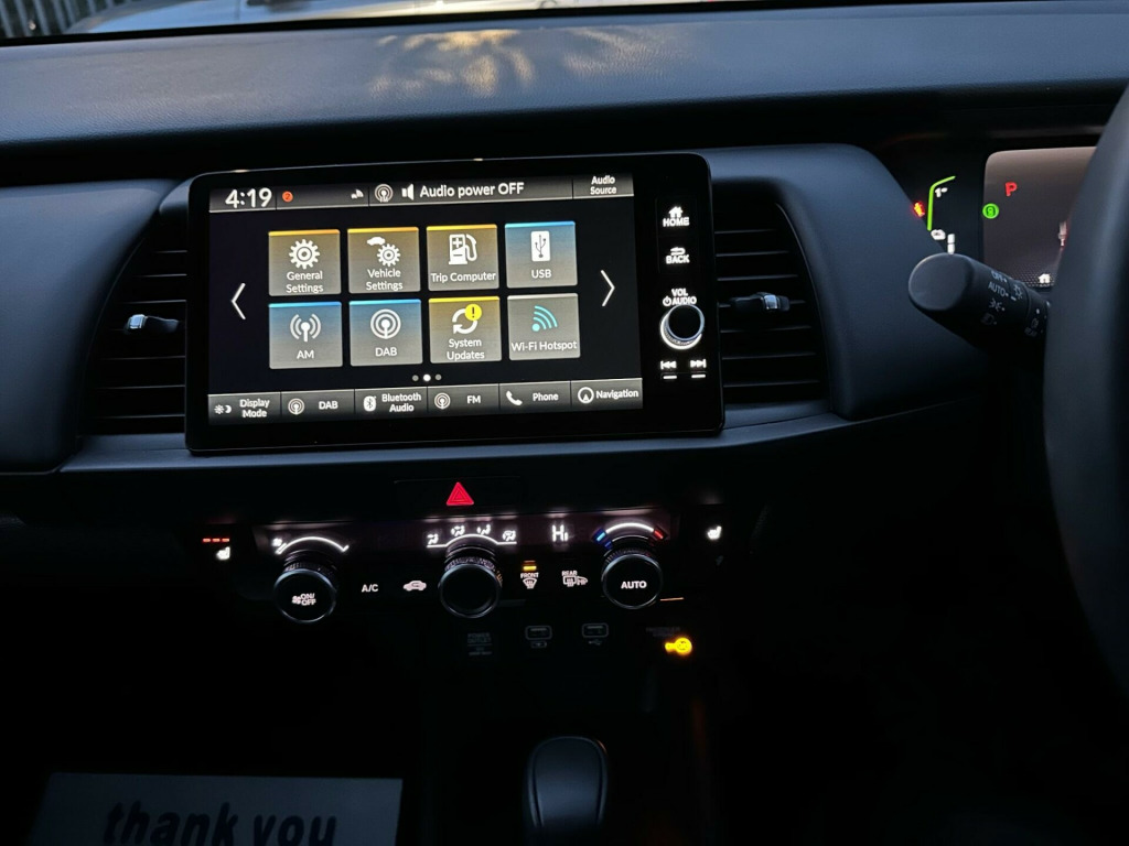 ON V CAR CAT S! in alloy wheels, 2x usb front, 2x usb rear - charge only, abs - anti lock braking system, accessory socket - front, adaptive cruise control, adjustable speed limiter, agile handle assist, airbag - driver srs - single stage inflation, airbag - drivers knee, airbag - front centre, airbag - front driver and passenger, airbag - front side, airbag - passenger srs with cut off switch, airbag - rear side, airbag - side curtain - front and rear, auto headlight adjuster - manual, auto wipers, automatic headlights, ba - brake assist, blind spot information including cross traffic monitor, bluetooth hands free telephone - hft, body colour exterior door handles, cargo net hook, climate control air conditioning, collision mitigation braking system - cmbs, courtesy light - front, daytime running lights - led, deflation warning system - dws, digital audio broadcast - dab+, door mirrors - body coloured, door mirrors - electrically adjustable and folding - heated - aspheric, driver seat manual height adjustment, driver and front passenger seat armrest, drivers seat back pocket, econ mode, ecall - europe, electric power steering with variable gear ratio, electric windows - front and rear, electronic parking brake with automatic brake hold, emergency stop signal, exclusive styling, exhaust - single, forward collision warning - fcw, front map light, front seats - heated, front and rear seat belts with emergency locking retractor - elr, headlight extension colour - black, headlights - auto on-off timer - coming-leaving home function, high beam support system - hss, hill start assist - hsa, honda connect with garmin navigation, hybrid emblem, isofix fix points - i-size, immobiliser system, intelligent speed limiter, key fob operation includes mirrors and windows, led headlights, led rear lights, lane departure warning - ldw, lane keep assist system, leather shift knob, low speed following, mid - multi info display, magic seats, parking sensors - front x4 and rear x4, passenger seat back pocket, privacy glass, rear view camera, remote central locking with 2 keys, road departure mitigation, seats - 60:40 split folding 2nd row, security alarm system, shark fin antenna, smart entry and start, speakers x4, sport grille - black, steering wheel - heated, steering wheel - leather, steering wheel - remote audio controls, steering wheel - tilt and telescopic adjustment, sunvisor vanity mirrors, sunvisor vanity mirrors illumination, super locking, tilt sensor, tonneau cover, traffic jam assistant, traffic sign recognition system, trunk light, tyre repair kit, vsa - vehicle stability assist, whiplash lessening front headrests, wireless apple carplay