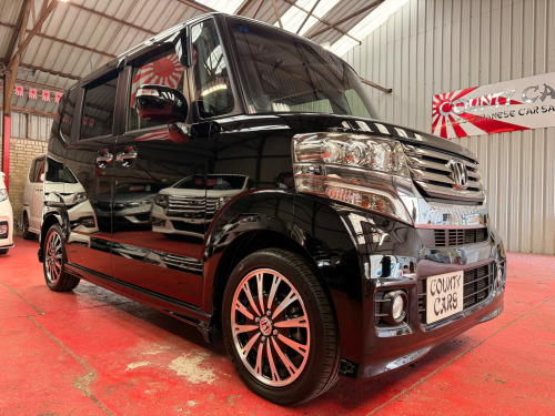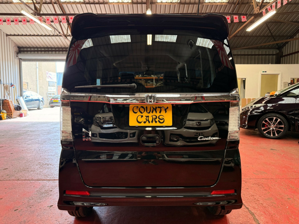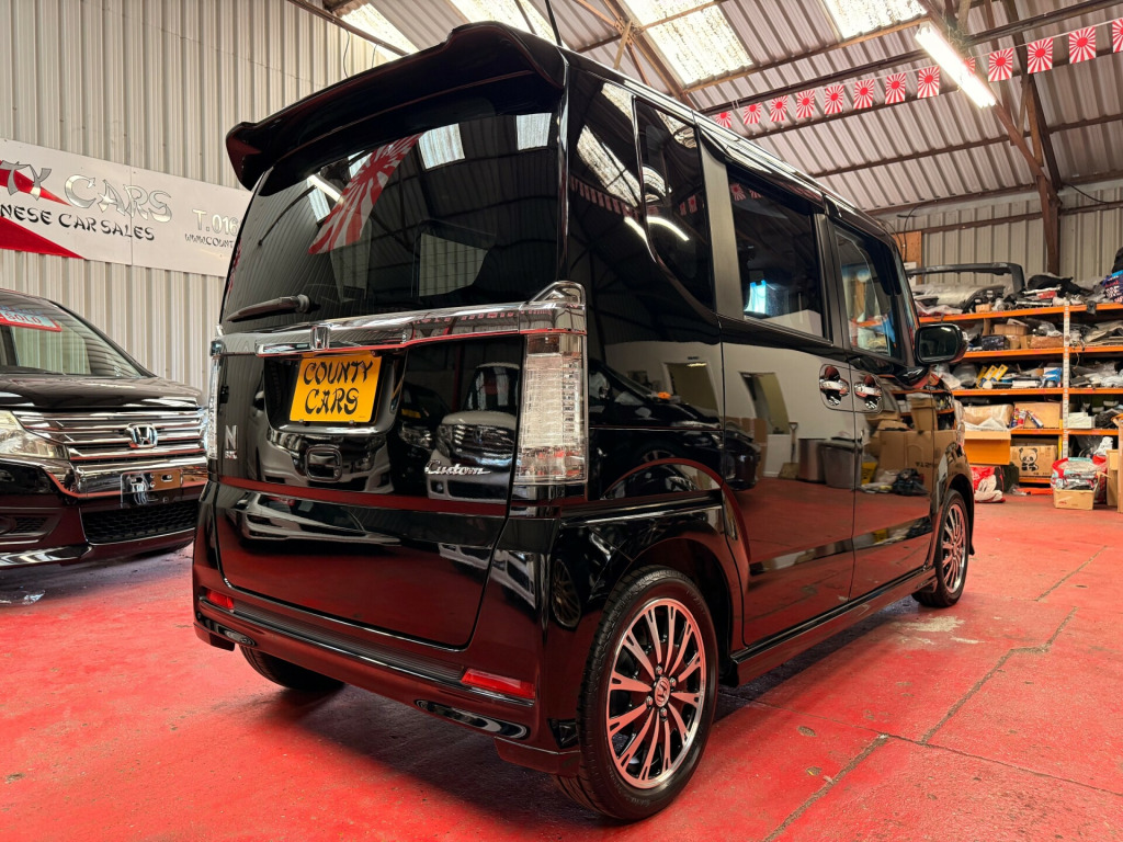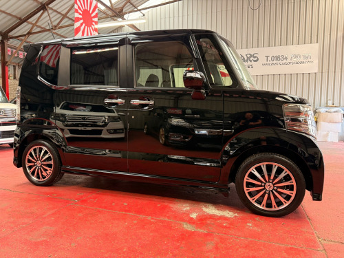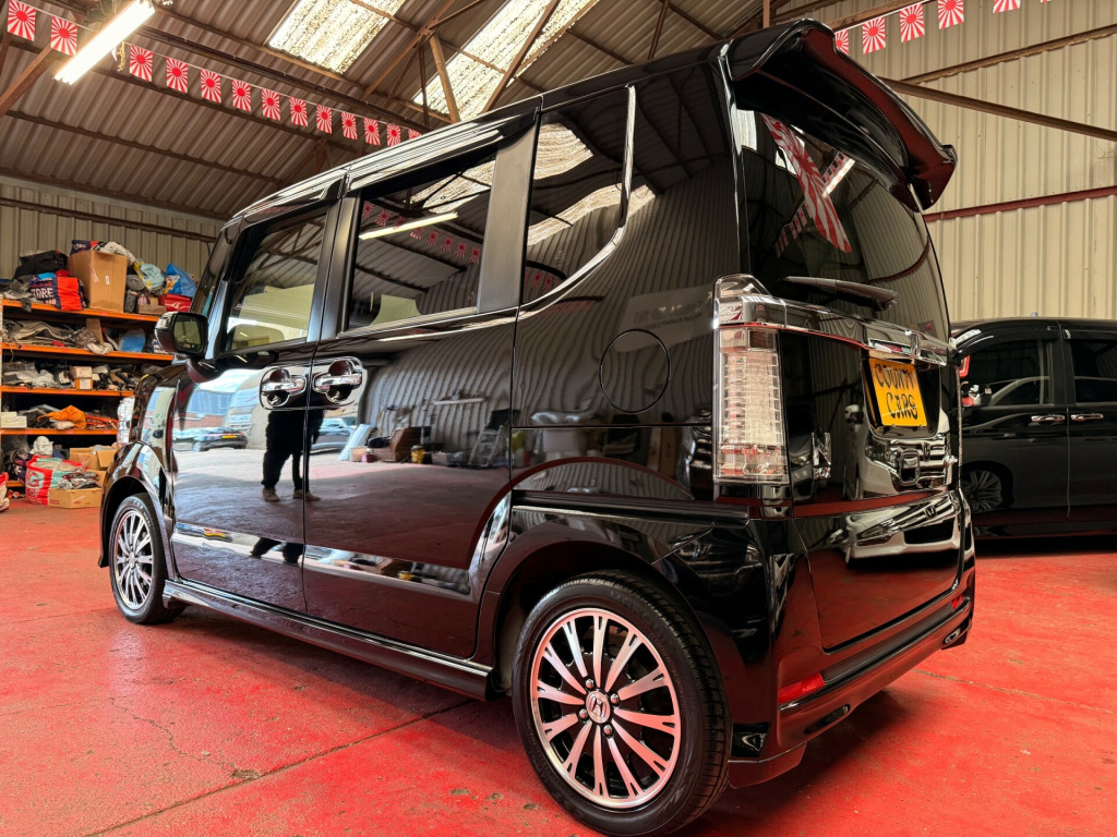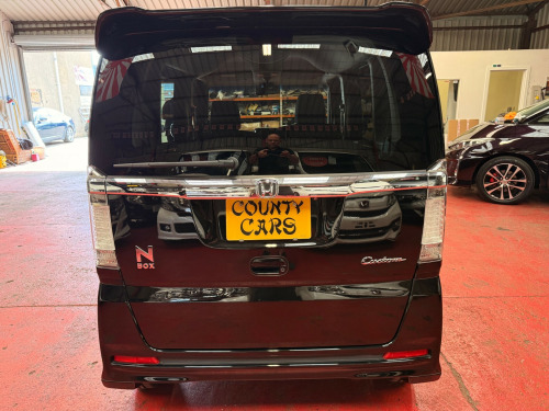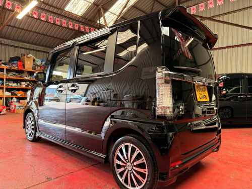 Honda N-Box Custom G Package 660cc Turbo 2015-15-Reg, 5 Door, Finished in Stunning Black paintwork, kei car from Japan, Twin Electric Soft Closing Sliding Doors, Stunning 15'' Diamond cut with gloss black centre Factory Alloy wheels, Full privacy glass, Rear spoiler, front spots, 4 Seater 4 unblemished seats, Cruise Control, Colour Camera, uk Android Apple CarPlay Stereo System, UK Speedo Conversion, Gloss black Dash, Centre armrest, Front cup holders, Eco Mode for better mpg, Heated Front Seats, The rear seats can be moved backwards and forwards, The seats all lay flat for a double Bed, Best selling car in Japan for 3yrs in a row. So much fun so much space, Only covered a Genuine 51,000 Miles with all the original Japanese paperwork and Auction sheet. Car VX Checked Nationwide Delivery Service Available r conditioning, bluetooth connection, climate control, colour satnav, comms pack, door mirrors electrically foldable, dual climate zones, satellite navigation, usb/ipod interface, xenon headlamps, cruise control, parking camera, power steering, traction control, abs, air bag, child locks, isofix child seat anchor points, passenger airbag, twin air bags, alarm, anti-theft system, central locking, immobiliser, keyless entry, privacy glass, remote central locking, electric front windows, electric mirrors, electric sliding doors, electric windows, rear electric windows, 3rd party sound system, steering wheel audio controls, stereo, front armrest, front head restraints, heated front seat, heated seats, height adjustable drivers seat, folding rear seats, rear armrest, rear headrests, 2 zone climate control, push button start, alloy wheels, auto lighting, body coloured bumpers, colour coded body, front fog lights, led 3rd brake light, led foglights, led headlights, led indicator lights, led rear lights, rear spoiler, rear wash/wipe, tyre repair kit