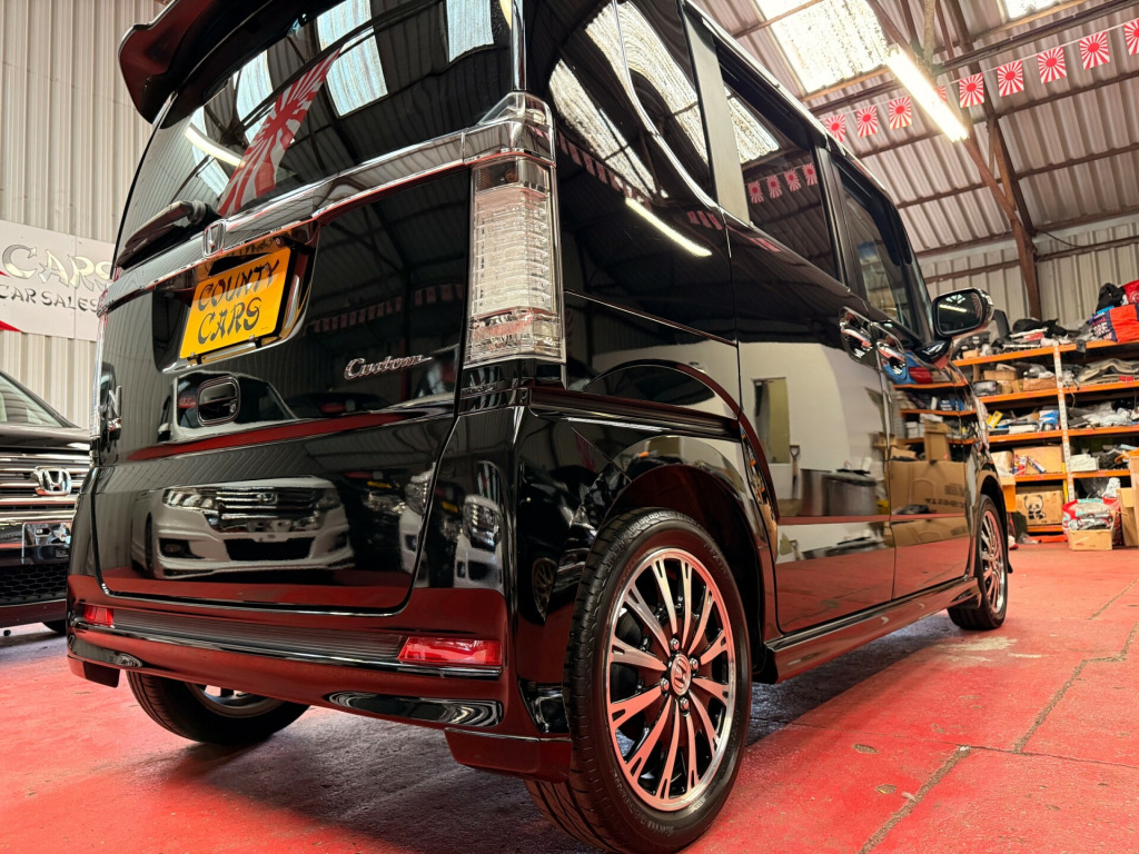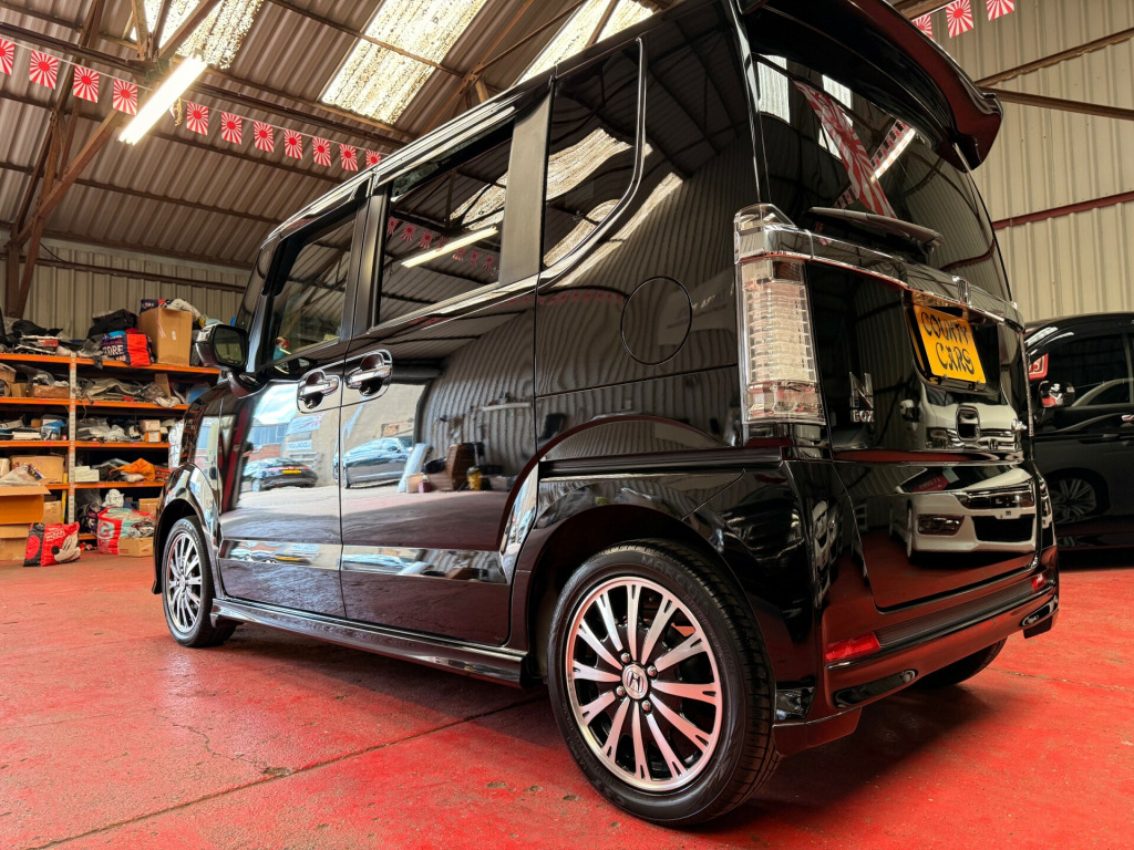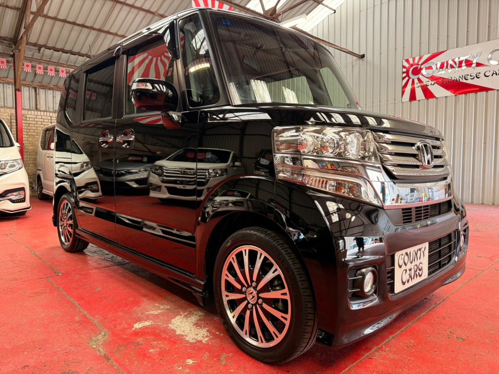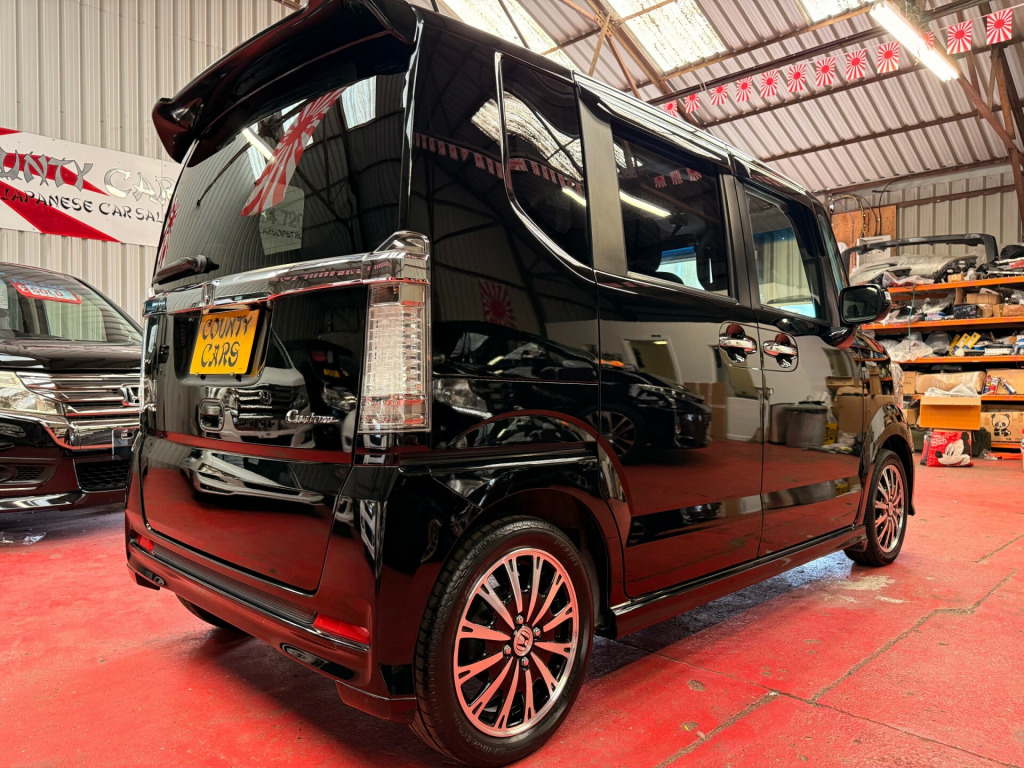 Honda N-Box Custom G Package 660cc Turbo 2015-15-Reg, 5 Door, Finished in Stunning Black paintwork, kei car from Japan, Twin Electric Soft Closing Sliding Doors, Stunning 15'' Diamond cut with gloss black centre Factory Alloy wheels, Full privacy glass, Rear spoiler, front spots, 4 Seater 4 unblemished seats, Cruise Control, Colour Camera, uk Android Apple CarPlay Stereo System, UK Speedo Conversion, Gloss black Dash, Centre armrest, Front cup holders, Eco Mode for better mpg, Heated Front Seats, The rear seats can be moved backwards and forwards, The seats all lay flat for a double Bed, Best selling car in Japan for 3yrs in a row. So much fun so much space, Only covered a Genuine 51,000 Miles with all the original Japanese paperwork and Auction sheet. Car VX Checked Nationwide Delivery Service Available r conditioning, bluetooth connection, climate control, colour satnav, comms pack, door mirrors electrically foldable, dual climate zones, satellite navigation, usb/ipod interface, xenon headlamps, cruise control, parking camera, power steering, traction control, abs, air bag, child locks, isofix child seat anchor points, passenger airbag, twin air bags, alarm, anti-theft system, central locking, immobiliser, keyless entry, privacy glass, remote central locking, electric front windows, electric mirrors, electric sliding doors, electric windows, rear electric windows, 3rd party sound system, steering wheel audio controls, stereo, front armrest, front head restraints, heated front seat, heated seats, height adjustable drivers seat, folding rear seats, rear armrest, rear headrests, 2 zone climate control, push button start, alloy wheels, auto lighting, body coloured bumpers, colour coded body, front fog lights, led 3rd brake light, led foglights, led headlights, led indicator lights, led rear lights, rear spoiler, rear wash/wipe, tyre repair kit