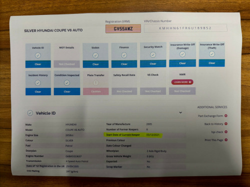 This 2005 Hyundai Coupe 2.7 V6 Coupe 3dr Automatic Coupe is currently available for £1,500 in Fareham Hampshire with Petrol engine and Automatic gearbox. For more information or to arrange a viewing, click here to send us an email using form below.