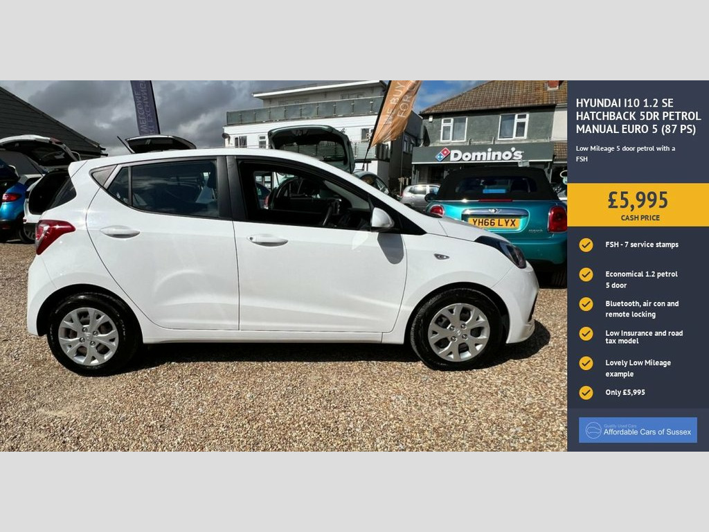 This 2014 Hyundai i10 1.2 SE Hatchback 5dr Petrol Manual Euro 5 (87 ps) Hatchback is currently available for £5,995 in Peacehaven East Sussex with Petrol engine and Manual gearbox. For more information or to arrange a viewing, click here to send us an email using form below.