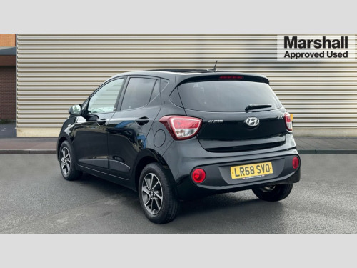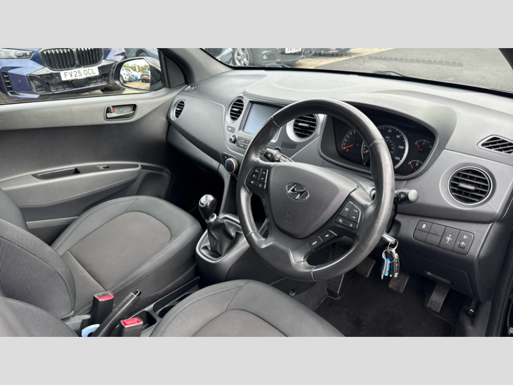 Hyundai I10 1.0 Go SE 5dr 7" Touch screen navigation, Apple car play/Android Auto, Bluetooth system, Cruise control + speed limiter, PAS, Trip computer, Vehicle Stability Control (VSC), 4 speakers, DAB Digital radio, RDS radio with MP3 player, Steering wheel mounted controls, USB/aux input socket, Black bodyside mouldings, Black finish on B pillars, Body colour door handles, Body coloured bumpers, Daytime running lights, Electric front windows, Electric rear windows, Electrically adjustable and heated door mirrors, Front intermittent wash wipers, Gloss black door mirrors, Privacy glass, Rear spoiler, Rear wiper, 12v power outlet - front, 60/40 split folding flat to floor rear seats, Air conditioning, Black headlining, Cloth upholstery, Courtesy lights, Driver + passenger vanity mirrors, Driver's seat height adjustment, Driver/passenger sunvisors with ticket holders, Front and rear bottle holders, Front door pockets, Front/rear adjustable head restraints, Height adjustable steering column, Isofix child seat preparation, Leather gearknob, Leather steering wheel, Luggage compartment lighting, Rear door pockets, 3x3 point rear seatbelts, ABS/EBD, Brake assist function, Childproof rear door locks, Curtain airbags, Driver/Front Passenger airbags, Electronic stability control, Front and rear seatbelt reminder, Front seatbelt pretensioners, Front side airbags, Passenger airbag deactivate switch, Traction control, Tyre pressure monitoring system, Immobiliser, Perimeter alarm, Remote central locking, Speed sensitive auto door locking, 14" alloy wheels, Space saver spare wheel