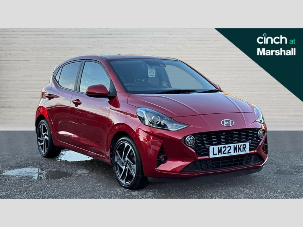 Hyundai I10 1.2 MPi Premium 5dr Auto 8" Touchscreen centre console display audio with smart device integration and DAB, Apple car play/Android Auto, Bluetooth connectivity with voice recognition, Cruise control + speed limiter, Driver attention alert system, eCall emergency call system, ISG - Idle stop and go, Lane departure warning system with lane keep assist - LKAS, PAS, Rear view camera, Roadside assistance, Trip computer, 2 front/2 rear speakers, Steering wheel audio, phone and cruise controls, USB socket, 1 speed non intermittent rear windscreen wiper, Bi-function projection headlights, Black finish on B pillars, Body colour door handles, Body coloured bumpers, Body coloured door mirrors, Electric front windows, Electric rear windows, Electrically adjustable and heated door mirrors, Front fog lights, Front grille in glossy black, Front intermittent wipers, Halogen headlights, Heated rear window, High beam assist, Indicator light on door mirrors, LED daytime running lights, Privacy glass - Rear windows and tailgate, Rear roof spoiler with integrated LED brake light, Rear side wing doors, 12v power outlet - front, 3 seat bench in 2nd row, 60/40 split folding flat to floor rear seats, Auto light control, Bottle holders in front/rear doors + front centre console, Cabin and luggage compartment interior lighting, Climate control, Driver + passenger vanity mirrors, Driver's seat height adjustment, Driver/passenger sunvisors with ticket holders, Front door pockets, Front Head Restraints - Vertical and Horizontal Adjustment, Glove compartment, Heated front seats, Heated steering wheel, Height adjustable steering column, Isofix child seat preparation, Leather wrapped steering wheel and gear knob, Metal paint effect interior door handles, Rear door pockets, Single front passenger seat, Vertical adjustment rear head restraints, 3x3 point rear seatbelts, Airbags - front, front side and curtain airbags, Anti-lock brake system (ABS), Autonomous emergency braking (AEB) with forward collision warning system, Brake assist function, Childproof rear door locks, Electronic stability control, Front and rear disc brakes, Front and rear seatbelt reminder, Front seatbelt pretensioners, Hill start assist control (HAC), Passenger airbag deactivate switch, Traction control, Tyre pressure monitoring system, Immobiliser, Perimeter alarm, Remote central locking, Second remote key, Speed sensitive auto door locking, 16" alloy wheels, Tyre repair kit