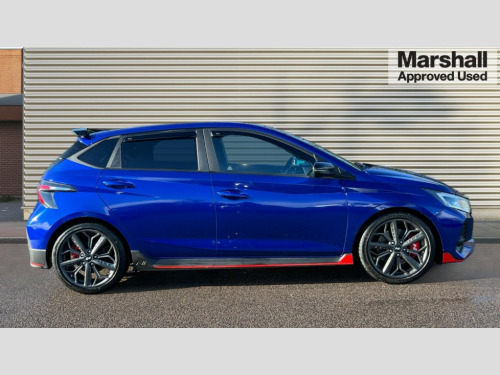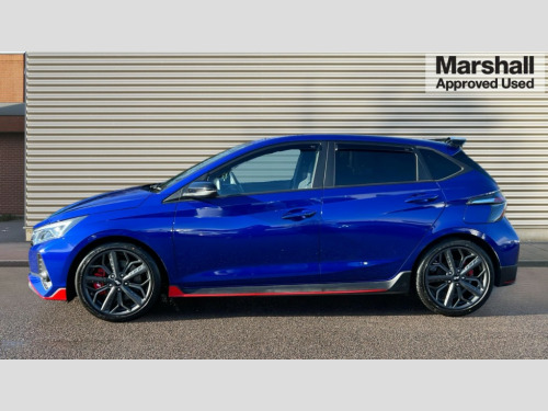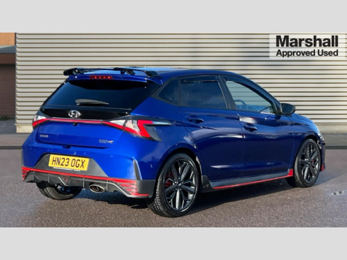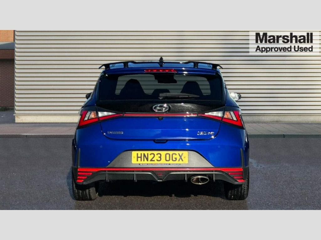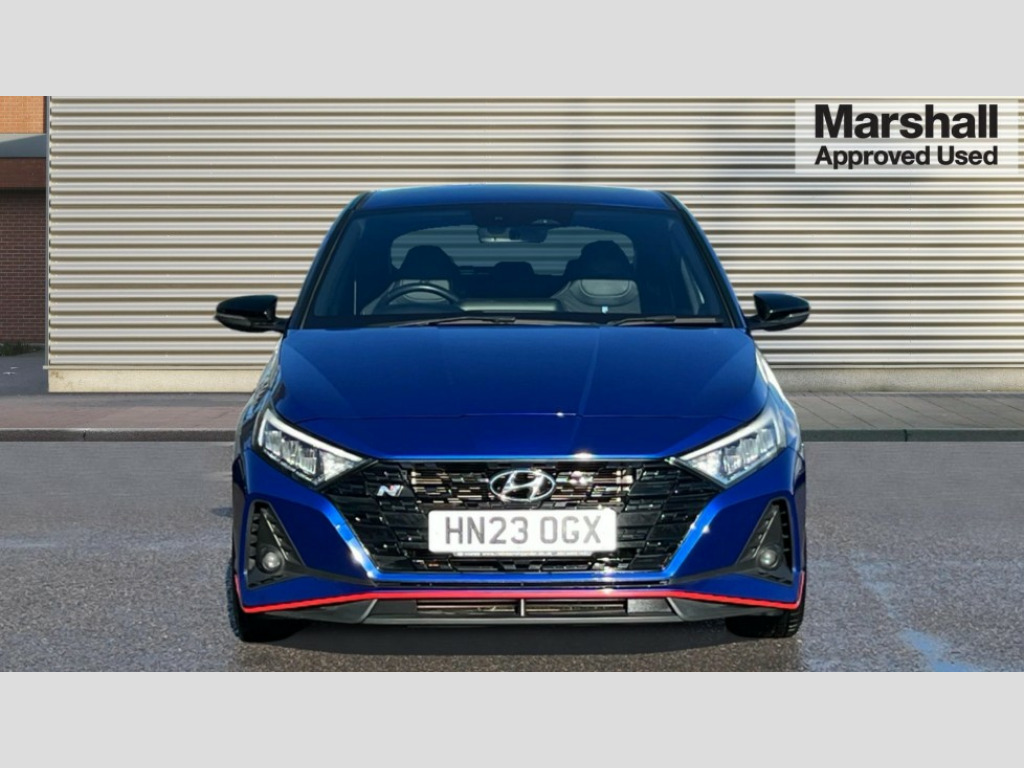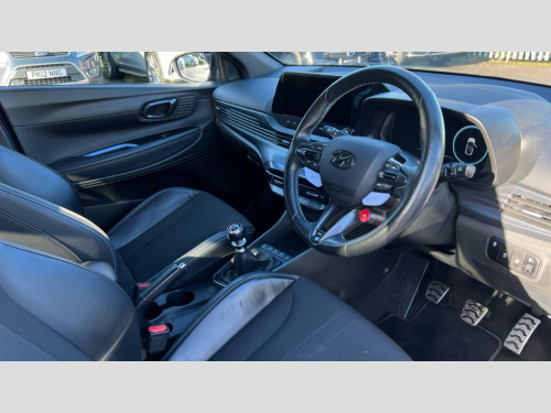 Hyundai I20 1.6T GDi N 5dr 10.25" digital supervision cluster, 10.25" touchscreen centre console display satellite navigation including traffic messaging channel, map care and live services, Apple car play/Android Auto, Bluetooth connectivity with voice recognition, Cruise control + speed limiter, Drive mode selector, Driver alert system, eCall emergency call system, Electric power steering, Emergency stop signalling system, Forward collision assist with pedestrian monitoring and cycle detection, Haptic steering, Intelligent speed limit warning, ISG - automatic start/stop, Lane departure warning system, Lane keep assist, N corner carving differential - mechanical limited slip differential, N custom mode, N grin control system, N Rev matching system, Rear parking sensor, Rear view camera with dynamic limitation singnalling, Trip computer, Wireless charging pad, Launch control, Vehicle Stability Control (VSC), Auxiliary input socket, DAB Digital radio, Steering wheel mounted audio/telephone controls, USB connection, Adjustable intermittent front windscreen wipers with aero wiper blade, Auto dimming rear view mirror, Automatic defog system for front windscreen, Automatic headlights with dusk sensor, Automatic windscreen wipers with rain sensor, Black radiator grille with integrated N logo, Black window surrounds, Body colour exterior door handles, Drivers one touch up/down with anti-trap, Electric adjustable heated door mirrors, Electric folding door mirrors, Electric front windows, Electric rear windows, Front fog lights, Gloss black door mirrors with integrated indicators, High beam assist, LED rear combination lights, MFR - LED headlights, Privacy glass - Rear windows and tailgate, Rear apron with integrated diffuser and red accents, Rear fog lights with N exclusive triangular lamp, Rear roof spoiler with integrated LED brake light, Rear side wing doors, Rear Windscreen Wiper - Intermittent Function, Shark fin antenna, Side skirts with red accents, Signature LED daytime running lights integrated into headlamp, Static cornering light, Tinted windows, 12v power outlet - front, 3 seat bench in 2nd row, 60/40 split folding rear seat, Adjustable head restraints, Aluminium sports pedals, Black roof liner, Blue interior mood lighting, Climate control, Driver/passenger sunvisors and illuminated vanity mirrors, Front armrest with storage box, Front map reading lights, Heated front seats, Heated steering wheel, Height adjustable driver's seat, Height/reach adjustable steering column, Isofix rear child seat preparation, Leather wrapped gear knob with N logo, Leather wrapped steering wheel with N logo, Luggage board, Luggage compartment lighting, Map pocket in rear seats, N sport seats in fabric/leather upholstery with performance blue stich detail, Parcel shelf, Satin chrome interior door handles, Single front passenger seat, Sound generator with variable silencer control, 3x3 point rear seatbelts, Anti-lock brake system (ABS), Autonomous emergency braking, Childproof rear door locks, Curtain airbags, Driver/Front Passenger airbags, ESP, Fasten seatbelt reminder, Front seatbelt pretensioners, Front side airbags, Height adjustable front seatbelts, Hill start assist control (HAC), Impact sensing auto door unlocking, Manual handbrake, N performance braking system with red calipers and N logo, Passenger airbag deactivate switch, Tyre pressure monitoring system, Deadlocks, Immobiliser, Locking wheel nuts, Perimeter alarm, Rear occupant alert, Remote central locking, Smart key with keyless entry and engine start/stop button, Speed sensitive auto door locking, Black N exclusive interior trim, 18" Matt grey light alloy wheels, Pirelli P-Zero tyres, Tyre repair kit