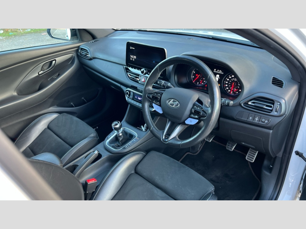 Hyundai I30 2.0T GDi N Performance 5dr 10.25" touchscreen centre console display satellite navigation including traffic messaging channel, map care and live services, Android Auto, Apple car play, Audio control with voice recognition, Blind spot Collision Warning (BCW), Bluetooth connectivity with voice recognition, Cruise control + speed limiter, Drive mode buttons, Driver attention alert system, Driver's supervision instrument cluster with 4.2" LCD display, e-Call (Emergency button system), Emergency stop signalling system, Front and rear parking sensors, Intelligent speed limit warning, Lane departure warning system with lane keep assist - LKAS, Lane follow assist, N exclusive sport cluster, N mode button, Parking system with rear camera and guidance system, Performance information display, Rack motor driven power steering, Rev matching system, Shift timing indicator, Trip computer, Windscreen washer fluid sensor and warning indicator, Wireless phone charging pad, Electric active sound design, Electronic limited slip differential, Electronically controlled suspension, Intelligent Stop and Go, Launch control, 2 front and 2 rear speakers with 2 tweeters, DAB Digital radio, Steering wheel audio, phone and cruise controls, USB ports in centre console, 1 speed non intermittent rear windscreen wiper, Active variable exhaust system, Adjustable intermittent front windscreen wipers with aero wiper blade, Automatic defog system for front windscreen, Automatic dimming rear view mirror, Automatic headlight with follow me home function, Automatic windscreen wipers with rain sensor, Black finish window surrounds, Black glossy door mirrors with integrated indicators, Body coloured door handles, Door mirror puddle lights, Dusk sensor, Electric adjustable heated door mirrors, Electric folding door mirrors, Electric windows - front and rear with anti-trap mechanism and one touch control (driver window), LED daytime running lights integrated into headlamp, LED Headlights, N exclusive front and rear bumpers, N exclusive radiator grille, N exclusive rear diffuser, Rear brake light in signature N triangular design, Rear LED lights, Rear roof spoiler with integrated LED brake light, Rear stiffness bar, Rear windows and tailgate privacy glass, Shark fin antenna, Smart high beam headlights, Smoked tail lights, Static cornering light, Tinted glass with windscreen shade band, Twin muffler rear exhaust, 12V power outlets in front console and luggage compartment, 60/40 split folding rear seat, Active head restraints, Aluminium pedals, Artificial leather door centre trim, Black interior door handles, Black roof liner, Centre console storage, Chrome effect interior door handles, Driver seat electric lumbar adjustment, Driver seat memory function, Driver's seat electric height adjustment, Driver's seat manual extendable seat cushion, Driver/passenger sunvisors and illuminated vanity mirrors, Dual zone climate control air conditioning, Electric adjust driver's seat, Faux suede and leather seat trim, Front and rear door pockets, Front armrest with storage box, Front cupholders, Front head restraints with vertical and horizontal adjustment, Front passenger's seat electric adjustments, Front passenger's seat electric height adjustment, Front passenger's seat electric lumbar support, Front passenger's seat manual extendable seat cushion, Front, rear and luggage compartment interior lights, Glove compartment, Heated front seats, Heated function steering wheel, Interior front map reading light and sunglasses holder, ISOFIX child seat anchorage points attached on outer rear seats, Leather wrapped steering wheel and gear knob, Luggage board, N branded aluminium door sill trims, Reach + rake adjustable steering column, Rear armrest with cupholder, Rear head restraints, 3x3 point rear seatbelts, Airbags - front, front side and curtain airbags, Anti-lock braking system (ABS), Autonomous emergency braking (AEB) with forward collision warning system, Childproof rear door locks, Curtain airbag roll over sensor, Electronic stability control, Front passenger airbag deactivation switch, Front seatbelt reminder, Height adjustable seatbelts, Hill start assist control (HAC), Manual parking brake, Red brake calipers with N logo, Reinforced brakes, Seatbelt reminder for rear passenger seats, Torque vectoring brake, Tyre pressure monitoring system (TPMS), Deadlocks, Immobiliser, Locking wheel nuts, Remote control central locking, Smart key with keyless entry and engine start/stop button, Speed sensitive automatic door locking, Thatcham category 1 alarm, 19" Forged alloy wheels, 19" Pirelli P zero performance tyres, Tyre repair kit
