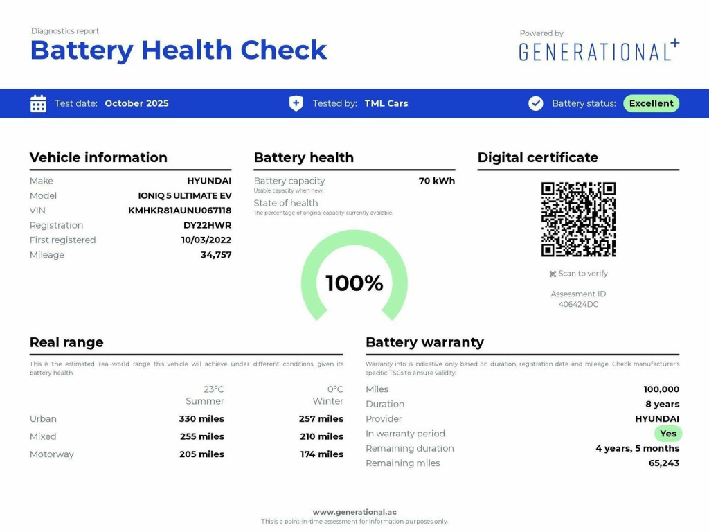 My names Tom and Im the owner of TML Cars, Im pleased to offer to market this used 2022 Hyundai IONIQ 5 Ultimate is a superb example, having had only one owner from new and boasting a clear vehicle history check. As an electric vehicle, it offers a substantial battery total capacity of 73 kWh, providing a maximum range of 280 miles when new. This Ultimate trim level comes equipped with the Eco Pack and Tech Pack, enhancing its efficiency and advanced features. Youll also benefit from Smart Key with keyless entry and engine start stop, Smart Cruise Control with Stop and Go, and Dual LED Headlamps for excellent visibility. The IONIQ 5 Ultimate truly stands out with its impressive performance and practicality. Its acceleration is a notable highlight, achieving 0-62mph in just 7.4 seconds, demonstrating its responsive power. For convenience, charging at home on a 7kW charger takes approximately 10 hours and 53 minutes for a full charge, while rapid public charging can take you from empty to 80% in a swift 17 minutes. Furthermore, this model offers generous boot space, making it a versatile choice for everyday use and longer journeys.