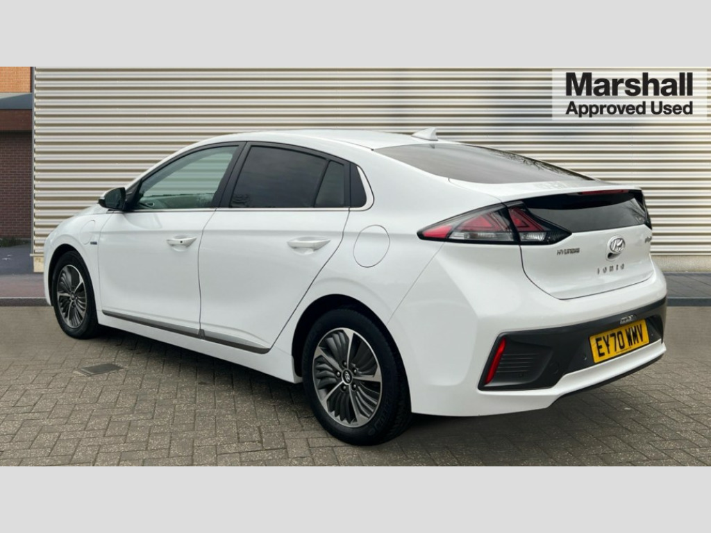 Hyundai Ioniq 1.6 GDi Plug-in Hybrid Premium SE 5dr DCT 10.25" touchscreen satellite navigation includes traffic messaging channel, mapcare, live services and bluelink, Adaptive cruise control with Stop and Go, Apple car play/Android Auto, Blind spot detection system, Bluetooth system, Driver attention alert system, E-call, Eco driving assistant system (ECO DAS), Electric power steering with variable drive modes, Front and rear parking sensors, Gear lever drive mode selector, Lane departure warning system with lane keep assist - LKAS, Lane follow assist, Parking system with rear camera and guidance system, Rear cross traffic alert, Rear view monitor, Roadside assistance, Supervision cluster with 7" high resolution TFT LCD, Voice recognition, Windscreen washer fluid sensor and warning indicator, Wireless phone charging pad, 3.3 kW On Board Charger, 7 pin charging cable, Emergency 3 pin connector charging cable (ICCB), DAB Digital radio, Infinity sound system includes 1 centre, 2 tweeters, 2 front, 2 rear and 1 ext amp, Radio data system, Steering wheel audio, phone and cruise controls, USB and aux connection in front, Active air flap radiator grille, Auto dimming rear view mirror, Automatic defog system for front windscreen, Automatic headlights with dusk sensor, Automatic windscreen wipers with rain sensor, Body colour bumpers, Body colour door handles with chrome inserts, Body colour door mirrors, Bodyside mouldings, Chrome door scuff with ioniq logo, Chrome finish window surround, Chrome radiator grille, Door mirror puddle lights, Electric adjustable door mirrors, Electric front windows - anti trap + one touch, Electric heated door mirrors, Heated rear windscreen, High beam assist, LED daytime running lights, LED Headlights, LED indicators in door mirrors, LED rear fog light, Positioning Lights - LED, Power folding door mirrors, Privacy glass, Rear electric windows, Rear LED lights, Rear roof spoiler with integrated LED brake light, Solar glass with windscreen shade band, Two tone rear bumper, 12V power outlets, 60/40 split folding rear seat, Centre console storage, Centre interior light, Chrome interior door handles, Driver's electric adjustable lumbar support, Driver's seat memory, Driver/passenger sunvisors with illuminated vanity mirrors, Dual zone climate control, Electric height adjustable driver seat, Front centre armrest with storage compartment, Front cupholder, Front head restraints with vertical and horizontal adjustment, Front seat and rear pockets, Heated front seats, Heated outer rear seats, Heated steering wheel, Illuminated luggage compartment, Interior mood lighting, Leather upholstery, Leather wrapped steering wheel, Luggage net, Manual height adjustable front passenger seat, Map and reading lights, Paddle shifter, Rear centre console with air vents, Sunglasses holder, USB - driver arm rest (charging only), Ventilated front seats, Vertical adjustment rear head restraints, 3x3 point rear seatbelts, Airbags - front, front side, curtain and drivers knee airbags, Anti-lock brake system (ABS), Autonomous emergency braking, Electric parking brake, Electronic stability control, Front passenger airbag deactivation switch, Hill start assist control (HAC), Regenerative braking system, Traction control, Tyre pressure monitoring system with individual tyre pressure display, Deadlocks, Immobiliser, Keyless smart entry with push button start, Remote central locking, 16" alloy wheels, Tyre repair kit