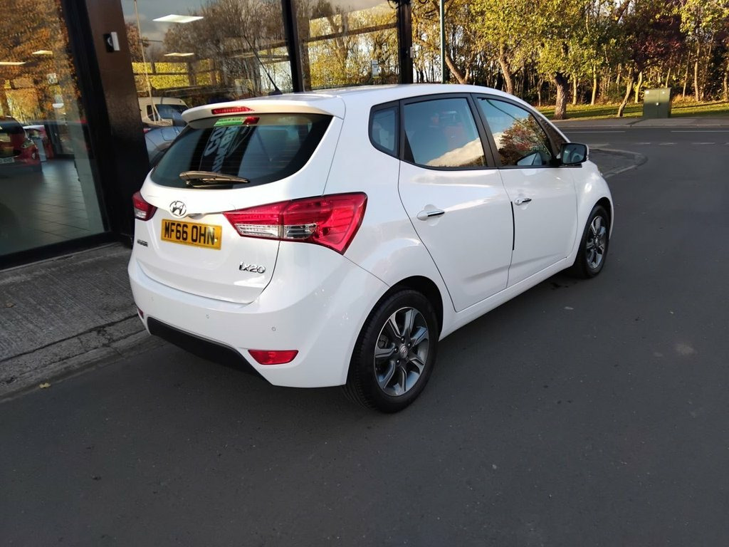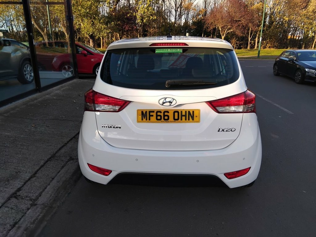 AVAILABLE AT OUR MARSKE SITE, THE SHOWROOM, 105 REDCAR ROAD, MARSKE TS11 6HU BIRKBROW MOTOR COMPANY AT MARSKE IS DELIGHTED TO OFFER THIS BEAUTIFULLY PRESENTED 2016/66 PLATE HYUNDAI IX20 1.4 BLUE DRIVE SE 5 DOOR SMALL MPV IN POLAR WHITE WITH ONLY 9,362 MILES COVERED FROM NEW, THIS CAR HAS COVERED THE EQUIVALENT OF A NINE MONTH OLD CAR. ONE OF ONLY A FEW WITH THIS MILEAGE IN THE WHOLE COUNTRY, A REAL ONE OFF, SPEC INCLUDES 16" DIAMOND CUT ALLOY WHEELS, FRONT FOG LIGHTS, DAYTIME RUNNING LIGHTS, AUTOMATIC HEADLIGHTS, FRONT AND REAR ELECTRIC WINDOWS, ELECTRIC POWER FOLDING DOOR MIRRORS, REMOTE CENTRAL LOCKING, AIR CONDITIONING, CD/MP3 RADIO WITH BLUETOOTH, USB AND AUX INPUTS, REVERSE PARKING SENSORS, TINTED GLASS, LOW INSURANCE GROUP, EXCELLENT ECONOMY WITH 50.4 MPG, HIGHER SEATING POSITION FOR EASY ACCESS, SPACIOUS BOOT, IDEAL FAMILY HATCHBACK, FINANCE ARRANGED 12V Power Outlet - Front Console, 12V Power Outlet - Luggage Compartment, Bluetooth Connectivity with Voice Recogn, Speakers x6, Stereo RDS Radio-CD Player with MP3 Comp, USB and AUX Connections, 16in Alloy Wheels - Diamond Cut, Body Colour Bumpers, Daytime Running Lights, Door Mirrors - Electric Adjustment and H, Door Mirrors with Integrated Indicators , Electric Windows - Front and Rear with A, Exterior Door Handles - Body Coloured wi, Locking Wheel Nuts, Radiator Grille - Chrome Bar and Surroun, Rear Spoiler with Integrated Brake Light, Space Saver Emergency Spare Wheel, Tinted Glass, Adjustable Intermittent Front Windscreen, Air Conditioning, Armrest - Rear Centre, Dash Trim - High Gloss