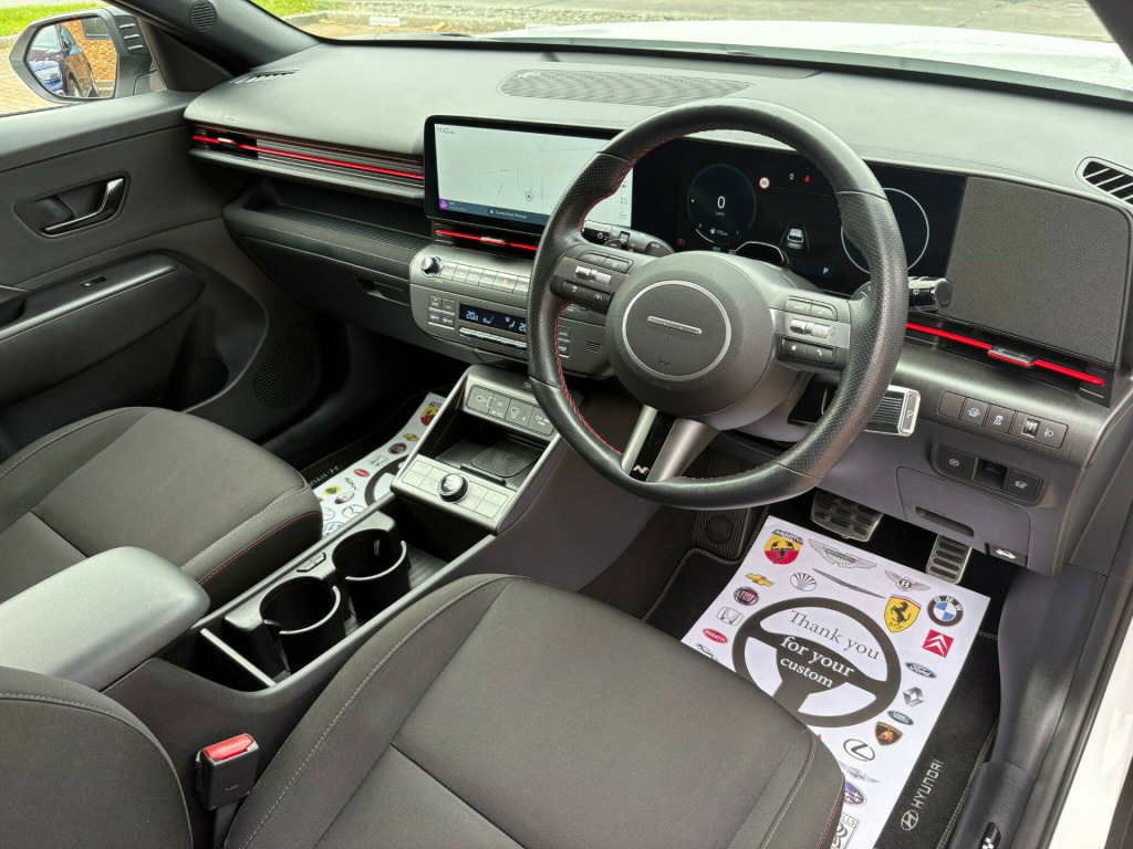 HYBRID *** 60+ MPG *** 5 YEAR FACTORY WARRANTY las white, n line cloth - black with red detail, 12v power outlet - front, 18in alloy wheels, abs - anti-lock brake system, adjustable head restraints, air conditioning - climate control - dual zone, airbags - front - front side - curtain and centre front airbag, alarm and immobiliser, aluminium pedals, ambient lighting - interior, automatic dimming rear view mirror, automatic headlights with dusk sensor, automatic windscreen wipers with rain sensor, bluelink connected car services - 3 years, bluetooth connectivity with voice recognition, central locking - remote control, cruise control - smart cruise control - scc with stop and go function, daw - driver attention warning, dbc - downhill brake control, daytime running lights - led, door mirrors - electric adjustment and heated with power fold, door mirrors - gloss black, drivers seat height adjustment - manual, drivers seat lumbar support, drivers supervision instrument cluster with 12.3in lcd display, electric windows - front with anti-trap mechanism and one-touch control, electric windows - rear, electronic stability control - esc, exterior door handles - body coloured, fca 1.5 - forward collision avoidance assist - car - pedestrian - cycle - junction turning, feature on demand - enabled, front passengers seat height adjustment - manual, front seat - back pockets, front seats - heated, hac - hill-start assist control, head restraints - vertical adjustment - rear, headlights - full mfr led, heated steering wheel, highway drive assist, immobiliser, indicator lights - door mirror - led, intelligent speed limit assist - isla, interior door handles - metal paint effect, interior light - centre led, interior light - front led, interior light - luggage compartment led, lane follow assist - lfa, lane keep assist - lka, leading vehicle departure alert - lvda, leather wrapped steering wheel, luggage shelf, motor driven power steering - mdps, n line exterior design pack, navigation infotainment - 12.3in touchscreen with bluelink - live services - mapcare, parking brake - electric, parking sensors - front and rear, parking system - rear camera and guidance system, privacy glass - rear windows and tailgate, radio - digital dab, rear lights upper and lower - led, rear occupant alert, rear seats - heated, rear seats - split folding 40-20-40, rear spoiler with integrated led brake light, roof rails, shift by wire - sbw, smart key - keyless entry with start-stop button, smartphone integration - apple carplay and android auto, solar glass - front door glass and windscreen, speakers - front - rear and tweeters, steering column - height and reach adjustable, steering wheel - audio - phone - cruise controls, sun visors with driver and passenger illuminated vanity mirrors, tailgate - power operated - height adjustable, temporary mobility kit, tinted glass - front and rear windows, trailer wiring package, tyre pressure monitoring system - tpms, usb c - front x2, usb c - rear x2, wheel arch inserts - body coloured, windscreen auto defog function, wireless phone charging pad, ecall
