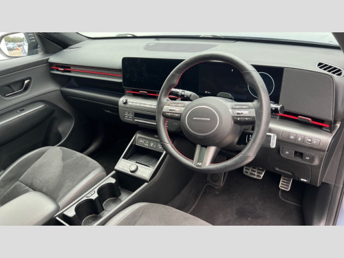 Hyundai Kona 1.6 GDi Hybrid N Line S 5dr DCT 12.3" touchscreen centre console display satellite navigation with bluelink, live services and mapcare, Blind spot collision avoidance assist, Blind spot view monitor, Bluetooth connectivity with voice recognition, Digital clock, Driver status monitor (DSM), Driver supervision instrument cluster with 12.3" LCD display, eCall emergency call system, Feature on demand - Enabled, Forward collision avoidance assist (FCA 1.5) - Car,pededstrian,cycle and junction turning, Front parking sensor, HDA - Highway Drive Assist Level 1.5, Height adjustable power tailgate, Intelligent speed limit assist, Lane follow assist, Lane keep assist, Leading vehicle departure alert (LVDA), Parking Collision Avoidance Assist-Reverse (PCA-R), Parking distance warning - side, Parking system with rear camera and guidance system, PAS, Rear cross traffic collision avoidance (RCCA), Rear parking sensor, Roadside assistance, Safe exit warning (SEW), Smart cruise control with stop and go functionality, Surround view monitor, Windscreen washer fluid sensor and warning indicator, Wireless phone charging pad, Wireless Smartphone Integration includes Apple CarPlay and Android auto, 2 front USB C and 2 rear USB C charging points, Bose Premium Audio system with 7 premium speakers + subwoofer, DAB Digital radio, Steering wheel audio,phone and cruise controls, Auto dimming rear view mirror, Automatic headlights with dusk sensor, Automatic windscreen wipers with rain sensor, Body colour bumpers, Body colour exterior door handles, Body coloured wheel arch inserts, Door mirror LED indicator lights, Electric front windows with anti-trap mechanism and one touch control, Electric rear windows, Electrically adjustable and heated door mirrors, Gloss black door mirrors, Horizon centre LED DRL, LED projector headlights, LED upper and lower rear lights, Power folding door mirrors, Privacy glass - Rear windows and tailgate, Rear roof spoiler with integrated LED brake light, Rear side wing doors, Rear wiper, Roof rails, Solar glass with front door glass and windscreen, Tinted glass in front and rear doors, Windscreen auto defog function, 12V power outlet in front console, 2 zone climate control, 3 seat bench in 2nd row, 40/20/40 split folding rear seat, Adjustable head restraints, Aluminium pedals, Ambient lighting, Driver and passenger front seat pockets, Driver's seat electric adjustments, Driver's seat lumbar support, Driver/passenger sunvisors and illuminated vanity mirrors, Floor mats, Front passenger's seat electric adjustments, Heated front seats, Heated rear seats, Heated steering wheel, Height/reach adjustable steering column, Isofix rear child seat fastenings, Leather wrapped steering wheel, LED centre interior light, LED front interior light, Luggage compartment LED lighting, Luggage net, Luggage shelf, Metal paint effect interior door handles, N Line Alcantara/leather upholstery, Parcel shelf, Rear centre armrest, Rear centre console with air vents, Shift by wire SBW, Single front passenger seat, Ventilated front seats, Vertical adjustment rear head restraints, N Line exterior design pack - Kona, Trailer wiring package - Kona, Airbag - front,front side,curtain and centre front airbag, Anti-lock brake system (ABS), Childproof rear door locks, Downhill brake control, EBD + Brake Assist, Electric parking brake, Electronic stability control, Fasten seatbelt reminder, Fixed 3 point for second row centre passenger seatbelt, Front seatbelt pretensioners, Height adjustable front seatbelts, Hill start assist control (HAC), Passenger airbag deactivate switch, Rear seat alert, Traction control, Tyre pressure monitoring system, Alarm/immobiliser, Deadlocks, Folding key, Locking wheel nuts, Remote central locking, Smart key with keyless entry and engine start/stop button, Five year annual vehicle health checks, Temporary mobility kit (TMK)