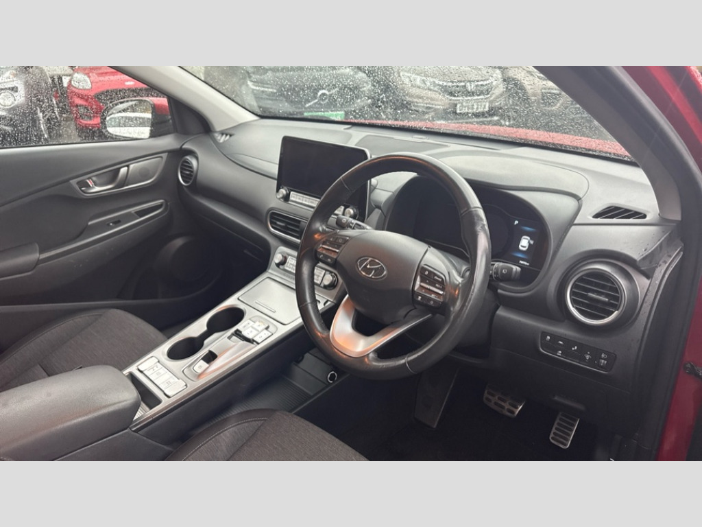 Hyundai Kona 150kW Premium 64kWh 5dr Auto 10.25" touchscreen satellite navigation includes traffic messaging channel, mapcare, live services and bluelink, Battery status check, Blind spot monitoring, Bluetooth connectivity with voice recognition, Cruise control - smart adaptive speed control with stop and go function, Digital clock, Drive mode selector, Driver attention alert system, Driver's supervision instrument cluster with 7" TFT display, eCall emergency call system, Forward collision warning, Front parking sensor, Intelligent speed limit warning, Lane follow assist, Lane keep assist, Parking system with rear camera and guidance system, PAS, Rear cross traffic alert, Rear parking sensor, Smartphone integration with Apple CarPlay and Android auto, Smartphone wireless charging plate, Windscreen washer fluid sensor and warning indicator, 7 pin charging cable, Battery heater, Vehicle Stability Control (VSC), DAB Digital radio, Krell premium audio system with 8 speakers and subwoofer, RDS radio with MP3 player, Steering wheel mounted audio/phone controls, USB/aux input socket, Auto dimming rear view mirror, Automatic headlights with dusk sensor, Automatic windscreen wipers with rain sensor, Black grille with chrome surround, Body colour bumpers, Body colour door mirrors and handles, Door mirror integrated indicators, Electric front/rear windows with drivers one touch/anti-trap, Electrically adjustable and heated door mirrors, Front fog lights, Halogen headlights, LED daytime running lights, LED rear lights, Painted anthracite body garnish, Positioning Lights - LED, Power folding door mirrors, Privacy glass - Rear windows and tailgate, Rear roof spoiler with integrated LED brake light, Roof rails, Silver skid plates, Solar glass with windscreen shade band, 60/40 split folding rear seat, Adjustable head restraints, Automatic climate control with defog system for front windscreen, CCS Combo rapid charge port (50kW), Centre interior light, Chrome interior door handles, Cloth upholstery, Door scuff plate, Driver and passenger front seat pockets, Driver's electric adjustable lumbar support, Driver's seat height adjustment, Driver's seat manual adjustment, Driver/passenger sunvisors and illuminated vanity mirrors, Front cup holders, Front interior light, Front passenger seat manual adjustments, Height/reach adjustable steering column, Isofix rear child seat fastenings, Leather wrapped steering wheel, Luggage compartment lighting, Luggage compartment undertray, Luggage hooks, Luggage net, Parcel shelf, Rear centre console with air vents, Sunglasses holder, USB charger in centre console, 3x3 point rear seatbelts, Airbags - front, front side and curtain airbags, Anti-lock brake system (ABS), Autonomous Emergency Braking with pedestrian recognition, Childproof rear door locks, Downhill brake control, EBD + Brake Assist, Electric parking brake, Electronic stability control, Fasten seatbelt reminder, Front seatbelt pretensioners, Height adjustable front seatbelts, Hill start assist control (HAC), Passenger airbag deactivate switch, Regenerative brake shift paddles, Traction control, Tyre pressure monitoring system with individual tyre pressure display, Alarm/immobiliser, Deadlocks, Folding key, Locking wheel nuts, Remote central locking, Smart key with keyless entry and engine start/stop button, 17" Alloy wheels, Tyre repair kit