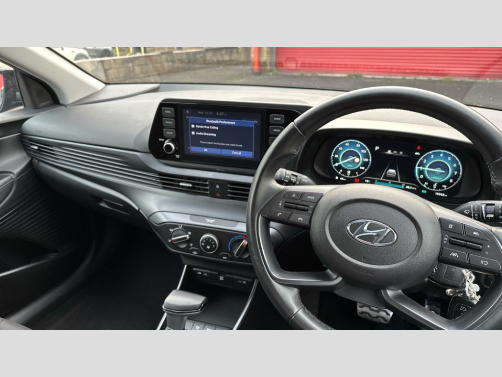 Hyundai Bayon 1.0 TGDi 48V MHEV SE Connect 5dr DCT 10.25" digital supervision cluster, 8" Touchscreen display audio + smart device integration, Bluetooth connectivity with voice recognition, Cruise control with speed limiter, Drive mode selector, Driver attention alert system, eCall emergency call system, Electric power steering, Emergency stop signalling system, Forward collision assist with pedestrian monitoring and cycle detection, Lane departure warning system with lane keep assist - LKAS, Phone connection with apple carPlay and android auto, Rear parking sensors, Rear view camera, Trip computer, 2 front and 2 rear speakers with 2 tweeters, DAB radio, Steering wheel mounted audio/phone controls, USB and aux connection in front, Adjustable intermittent front windscreen wipers with aero wiper blade, Automatic headlights with dusk sensor, Black finish window surrounds, Body colour bumpers, Body colour door handles, Body colour door mirrors with integrated indicators, Bulb type rear combination lights, Electric adjustment and heated door mirrors, Electric front/rear windows with drivers one touch/anti-trap, Gloss black radiator grille, Halogen headlamps, High beam assist, LED daytime running lights, Rain sensor, Rear roof spoiler with integrated LED brake light, Rear side wing doors, Rear wash/wipe with intermittent wipe setting, Roof rails, Shark fin antenna, Static Cornering lights, Tinted windshield, 12V power outlet in front console, 3 rear seats, 60/40 split folding rear seat, Adjustable head restraints, Blue interior mood lighting, Cabin and luggage compartment interior lighting, Cloth seat trim, Driver's seat manual height adjustment, Height/reach adjustable steering column, Illuminated driver/passenger vanity mirror, Interior front map reading light, Leather wrapped gear shift knob, Leather wrapped steering wheel, Luggage board, Manual air conditioning, Satin chrome interior door handles, Single front passenger seat, 3 point front seatbelts with pre-tensioners, 3 point rear seatbelts, Airbags - front, front side and curtain airbags, Anti-lock braking system (ABS), Autonomous emergency braking, Childproof rear door locks, Electronic Stability Programme (ESP), Front and rear seatbelt reminder, Front passenger airbag deactivation switch, Hill start assist control (HAC), Impact sensing auto door unlocking, Isofix child seat anchorage points - rear, Tyre pressure monitoring system, Vehicle stability management, Deadlocks, Immobiliser, Locking wheel nuts, Perimeter alarm, Remote control central locking, Speed sensitive automatic door locking, Black mono interior trim, 16" alloy wheels, Michelin Tyre brand, Tyre repair kit