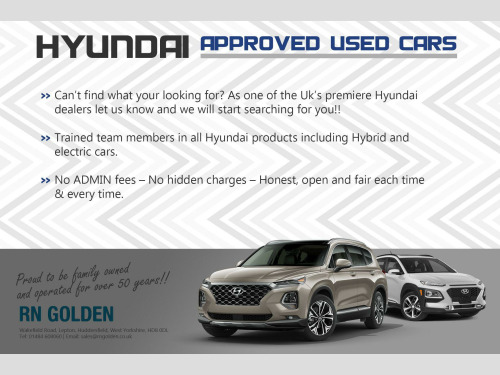 MAIN DEALER WITHOUT THE FEES• Immediate Collection Available•RN Golden, one of the UK’s longest-established Hyundai dealerships, with over 50 years of experience, is proud to offer you a seamless, hassle-free car-buying experience. Our extensive history means we know exactly what it takes to help you find your next car — and with us, you can be sure you’re getting the best deal without hidden fees.You can buy with peace of mind when purchasing a Used Car from one of our retailers, whether you purchase a Hyundai Promise vehicle or a standard Hyundai Approved Used Car, both come with the balance of the manufacturer warranty for cars less than 5 years old or retailer supplied warranty options for cars more than 5 years old. All Hyundai Approved Used cars are prepared by our trained technicians – and Electric Experts for our EVs. HYUNDAI PROMISE:Hyundai Promise cars come with a minimum of 24 months Hyundai warranty, that can be upgraded to a 5-years Hyundai warranty (at additional cost, contact your retailer for further information). To be classified as a Hyundai Promise car, the Hyundai car must have less than 60,000 miles on the clock or be no older than 36 months old. Our standard Approved Used cars also come with a warranty – Balance of manufacturer warranty for cars less than 5 years old, or retailer supplied warranty options for cars more than 5 years old. This is applicable to Hyundai cars with less than 80,000 miles and no older than 8 years old (petrol/diesel), or 7 years old if electric, plug-in hybrid or hybrid. If you are unsure whether the car you are interested in is classified as a Hyundai Promise vehicle, please just ask WHY CHOOSE HYUNDAI APPROVED USED CARS?12-Month Roadside Assistance — Thorough Multi-Point Safety & Condition Check — Independent Vehicle History & Mileage Check — 30-Day / 1,000 Miles Exchange Guarantee — At RN Golden, you’re buying with confidence from a trusted, family-run dealership that has built its reputation on customer satisfaction. — just quality cars, exceptional service, a, and real peace of mind.