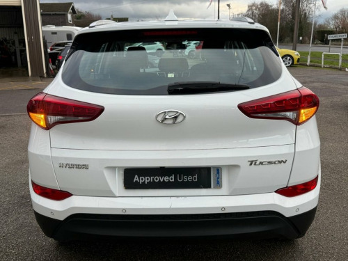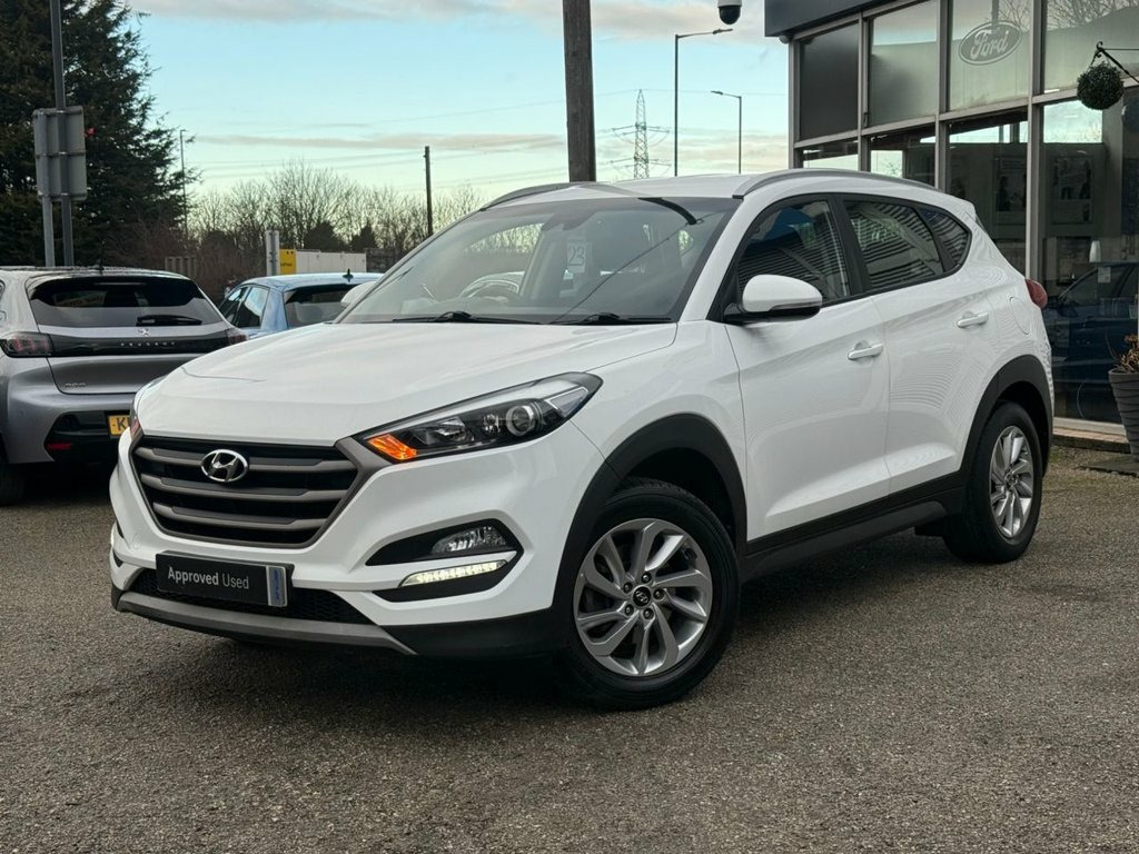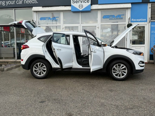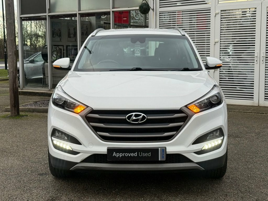 FANTASTIC LOOKING, LOW MILEAGE, HYUNDAI TUCSON 1.6 GDI BLUE DRIVE SE NAV, EURO 6. Finished in POLAR WHITE with contrasting HEATED SEATS. This Tucson ticks all of the family car boxes, with practicality and a good interior its strongest points. This SE trim brings plenty of high spec and is the best option for a well-valued Tucson. Features include Sat Nav, Heated front seats, Rear View Camera, DAB Radio, B/Tooth, LED Run Lights, Park sensors, Alloys and much more. Dealer Serviced at 4245 miles, 9189 miles, 11380 miles and on arrival at 26879 miles. EMC IS A FAMILY RUN BUSINESS, EST IN 1989. OUR AIM IS TO PROVIDE A SIMPLE, EASY AND CARING BUYING EXPERIENCE. Please call JEFF or BEN to reserve this wonderful example today. Cloth - Blue-Black, Polar White, Parking Sensors - Rear, Heated Front Seats, Daytime Running Lights - LED, Bluetooth Connectivity, 8in Touchscreen Satellite Navigation wit, Digital Clock