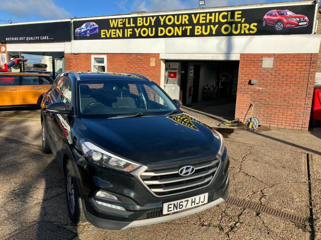 A Exceptionally good Hyundai Tucson SE Nav 1.7 CRDi Blue Drive SUV 5 Dr (6) Diesel Manual Euro 6 (s/s) (116 ps) in Black with 72,366 miles.A well-equipped and practical family crossover known for its comfort, reliability, and low running costs and well Known for its fuel efficiency (around 60+ mpg).Generous levels of equipment with Features including an 8-inch touchscreen satellite navigation system with a reversing camera, Bluetooth connectivity, DAB digital radio, and USB/AUX connections,heated front seats, dual-zone climate control with ioniser, cruise control with speed limiter, and electric folding heated door mirrors,17-inch alloy wheels, LED daytime running lights, front fog lights, silver roof rails, and rear parking sensors. This is a very handsome vehicle that anyone would be proud to own., v power outlet - front console and luggage compartment, 6 speakers - 2 tweeters - 2 front door - 2 rear door, 8in touchscreen satellite navigation with traffic messaging channel - reversing camera - mapcare and tom tom live services, bluetooth connectivity, stereo rds dab digital radio with mp3 compatibility, usb and aux connections, 17in alloy wheels, body colour bumpers, door mirrors - body coloured, door mirrors - electric adjustment and heated with power folding function, electric windows - front and rear with drivers anti-trap and one-touch up-down control, exterior door handles - body coloured, locking wheel nuts, positioning lights led, rear spoiler with integral led brake light, roof rails - silver, side body moulding - black, skid plates - front - silver, spare wheel - full size alloy, tinted glass with shade band, 6 airbags - front - front seat side and curtain, abs - anti-lock brake system with ebd - electronic brake-force distribution, active bonnet system, bas - brake assist system, childproof rear door locks, curtain airbag rollover sensor, dbc - downhill brake control, deadlocks, esp - electronic stability programme, ess - emergency stop signal, flex steering, front passenger airbag de-activation switch, hac - hill-start assist control, height adjustable front seatbelts, isofix child seat anchorage points - rear - outer rear, immobiliser, perimeter alarm, remote central locking, seatbelt anchor pre-tensioners - front, seatbelt reminder - front and rear, speed limit information system, speed sensitive automatic door locking, tsa - trailer stability assist, vsm - vehicle stability management, adjustable head restraints, adjustable intermittent front windscreen wipers with aero wiper blade, armrest - front with storage, armrest - rear centre with cup holders, automatic de-fog system for front windscreen, bottle holders - front centre console and door, climate control - dual zone with ioniser, courtesy light - front door, driver seat height adjustment, front map reading lights, glove compartment with cooling function and illumination, heated front seats, interior door handles - chrome effect, interior light - luggage compartment, interior trim - soft touch - door top and centre trim, leather wrapped steering wheel and gear knob, luggage hooks, luggage net, retractable load cover, seats - 60-40 split folding rear, seats - drivers electric lumbar support, seats - rear reclining, steering wheel audio and phone controls, sun visors with driver and passenger illuminated led vanity mirrors, sunglasses holder, automatic headlights with dusk sensor, daytime running lights - led, front fog lights, headlights - follow me home function, projection headlights with static cornering lights, rear lights - led, cruise control with speed limiter, digital clock, lane departure warning system with lane keeping assist, parking sensors - rear, power assisted steering, trip computer, tyre pressure monitoring system with individual tyre display, windscreen washer fluid sensor and warning indicator