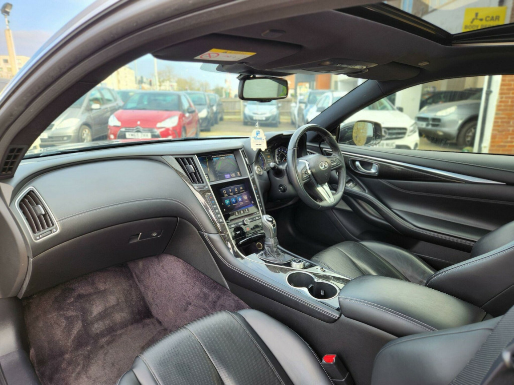IN VERY GOOD CONDITION IN AND OUTSIDE.FULL LEATHER HEATED SEATS ,FRONT AND REAR PARKING SENSORS.Parking assist.360 CAMERA .Adaptive cruise control.SUNROOF.Electric Folding Mirrors .Blind Spot Assist,Service History.Just Serviced And Mot ectric glass sunroof, 12v power outlets - 2 - in centre console, 19in alloy wheels - 9in 5 spoke - 3d - bi-tone, 4-wheel anti-lock braking system - abs - electronic brake force distribution - ebd - traction control system - tcs and vehicle dynamic control - vdc, 6 airbags, am-fm audio system with single cd player, active noise cancellation - anc - and active sound enhancement, active trace control, ambient pack, attraction light, auto dimming rear view mirror, automatic headlight activation, autonomous emergency braking, black tricot roof liner, bluetooth audio streaming, bluetooth for mobile connectivity, body colour door mirrors with led turning signal, comfort pack, dark maple wood interior trim, driver seats electric lumbar and side support - manual thigh extension, dual touch screens - lcd vga 8in and lcd vga 7in, electric assisted ingress-egress mechanism for easy access to rear seats, fine vision electroluminescent gauges with 3d - 5in tft colour display, first aid kit with warning triangle, flexible door stop smart system, folding rear seat backrest, front armrest with storage compartment and cupholders, front sport seats with 8-way electric adjustment, headlights - follow-me home system, heated front seats, hill start assist, i-key with smart access - luggage compartment release and enhanced memory, isofix and top-tether seat mounting points in the rear seats, infiniti aluminium front doors sill finishers, infiniti drive mode selector, infiniti intouch, infiniti intuition, led auto-levelling headlights and daytime running lights, led fog lights - front and rear, led taillights, leather wrapped - cross-stitched sport steering wheel with matt chrome finish, leather wrapped - stitched gear shift lever with matt chrome and black gloss finish, multifunction steering wheel, multimedia pack, one-touch power windows with auto-operation linked to i-key and pinch prevention on front windows, overhead sunglass storage and map lamp, pop-up engine bonnet for pedestrian protection, push button ignition, rear air conditioning vents, rear centre armrest with cupholder, reminder for front and rear seat belts, safety shield pack, speed limiter, speed sensitive power steering assistance, sun visors with illuminated vanity mirrors - on drivers side with extension and card holder, synchronised rev match clutch control system for automatic transmission, tpms - tyre pressure monitor system with individual tyre pressure display, traffic sign recognition, twin exhaust tailpipes with chrome finisher, usb-ipod connectivity and aux-in rca, uv-reducing tinted glass, ultrasonic alarm system, vehicle security system with engine immobiliser and alarm, visibility pack, voice recognition system