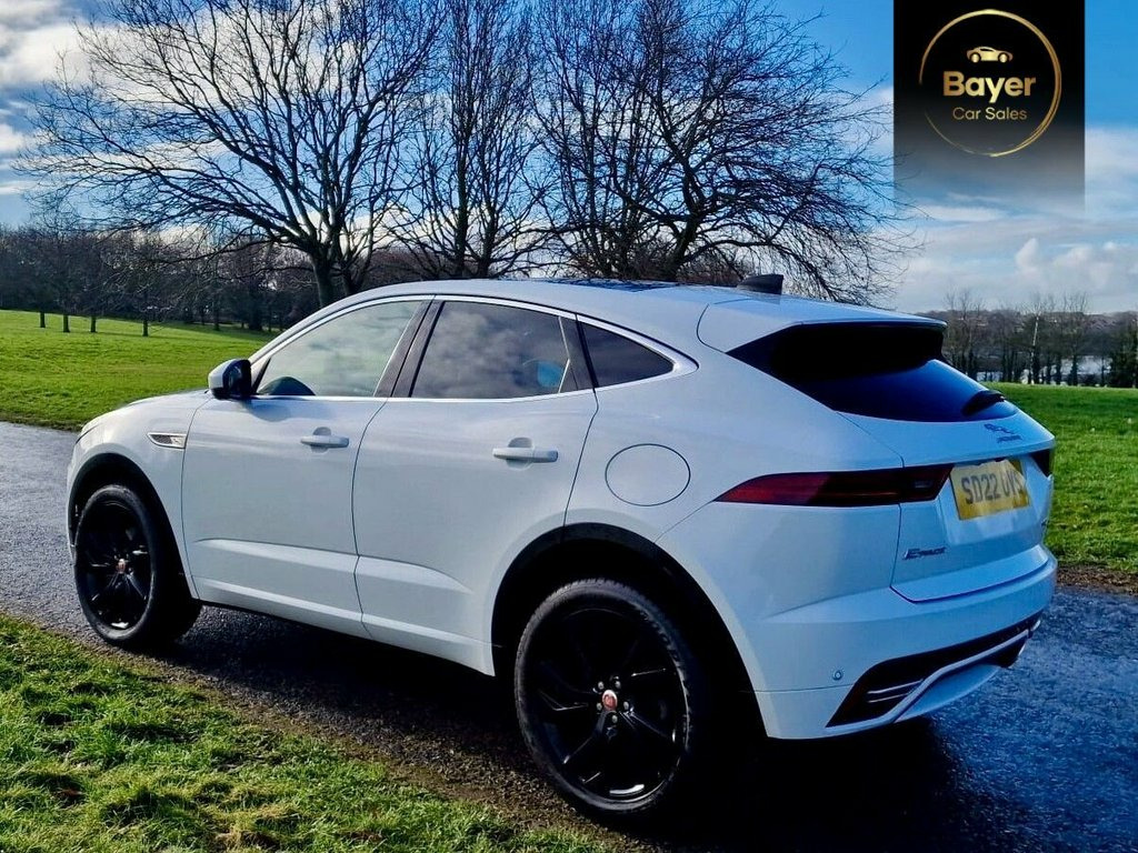 This 2022 Jaguar E-PACE P300e R-Dynamic SE offers an exceptional blend of performance and efficiency. As a Euro 6 compliant plug in hybrid, this Four Wheel Drive model boasts a 1.5 litre petrol engine, delivering an impressive 0-60mph time of just 6.1 seconds. The R-Dynamic SE trim enhances its appeal with a Fixed Panoramic Roof, providing an airy and open cabin experience. Further complementing its sophisticated design is the Black Exterior Pack, which adds a touch of assertive styling. The driving experience is further refined by Premium LED Headlights featuring Signature Daytime Running Lights, complete with animated directional indicators for both front and rear, and Auto High Beam Assist for effortless night driving. Parking is made simple with a Rear Camera and Front and Rear Parking Aid, ensuring confidence in all manoeuvres. These features collectively demonstrate the E-PACE's advanced technology and thoughtful design, setting it apart from other vehicles in its class. 11.4in Touchscreen, 12-Way Driver Memory and 10-Way Passenge, 19in Alloy Wheels - 5 Spoke Satin Dark G, 2-Zone Climate Control, 3-Flash Lane Change Indicators, 40-20-40 Split Fold Rear Seat, ABS - Anti-locking Braking System, Adaptive Cruise Control, Airbags - Front Side, Airbags - Full Length Side Window Curtai, Analogue Dials with Central TFT Display, Android Auto, Apple CarPlay, Approach Illumination, ASPC - All Surface Progress Control, Auto-Dimming Interior Rear View Mirror, Automatic Headlights, Black Exterior Pack, Blind Spot Assist, Body Coloured Roof, Bright Metal Pedals, Cabin Lighting, Carpet Mats, Centre Console with Armrest, Centre High-Mounted Stop Light, Configurable Dynamics,
