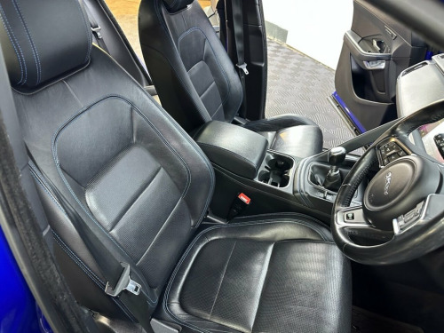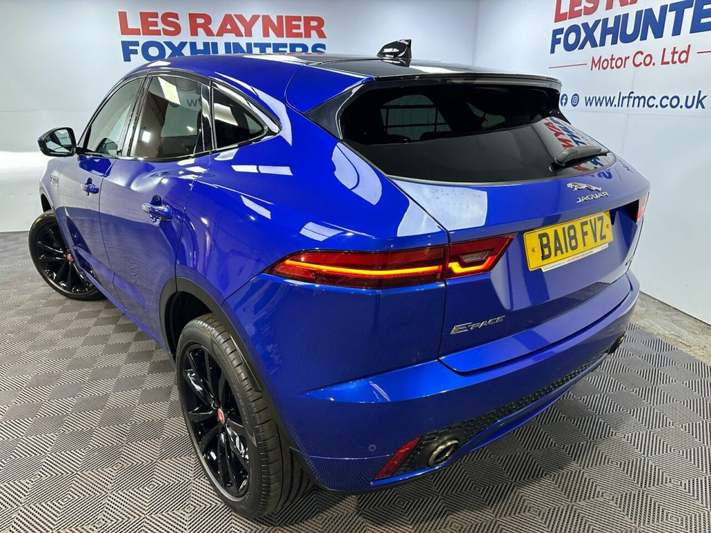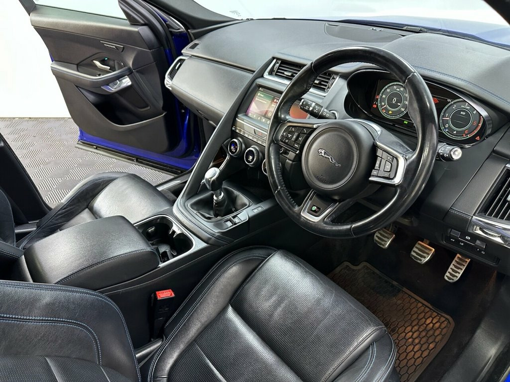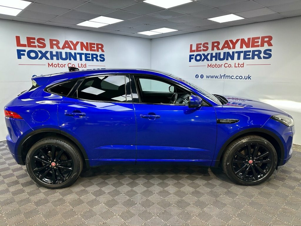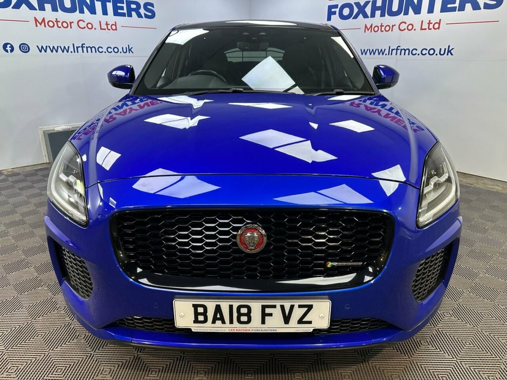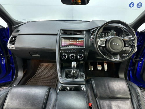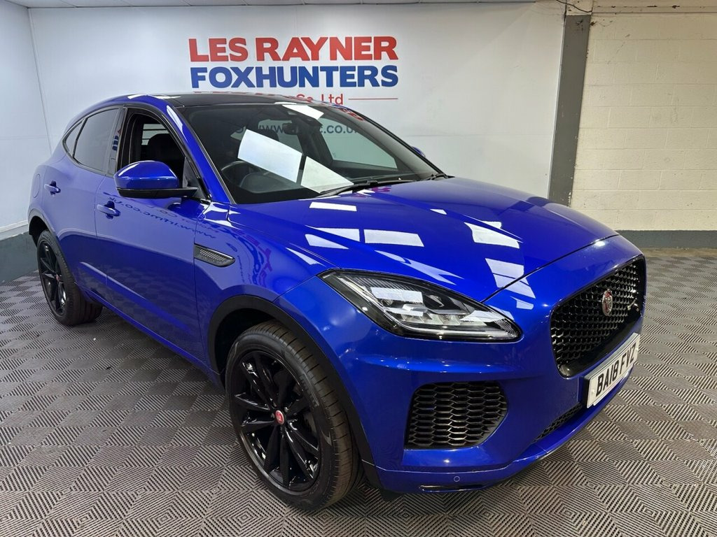 BA18FVZ JAGUAR E-PACE 2.0 D150 R-Dynamic SUV 5dr Diesel Manual Euro 6 (s/s) (150 ps)- 58K miles- 1 Former- The E-Pace looks stunning in Caesium Blue and offers a brilliant specification of 20" gloss black alloys, reversing camera, front and rear parking sensors, LED headlights, electric folding wing mirrors, full leather interior, heated front memory seats, contrast black roof, rear privacy glass, multifunction steering wheel, cruise control, autolights, front quick clear heated windscreen, drive modes, stop start, dual zone climate control, air conditioning, bluetooth, DAB/FM Radio, electric windows and remote locking. Full service and new MOT completed at sale so you can buy with confidence. Whats App Part Ex Valuation Hotline! Send photo's and details to 07591835255 18-Way Heated Electric Memory Front Seat, 20in Alloy Wheels - 5 Split-Spoke Gloss , Black Contrast Roof, Black Exterior Pack, Caesium Blue, Grained Leather - Ebony with Reims Stitc, Privacy Glass