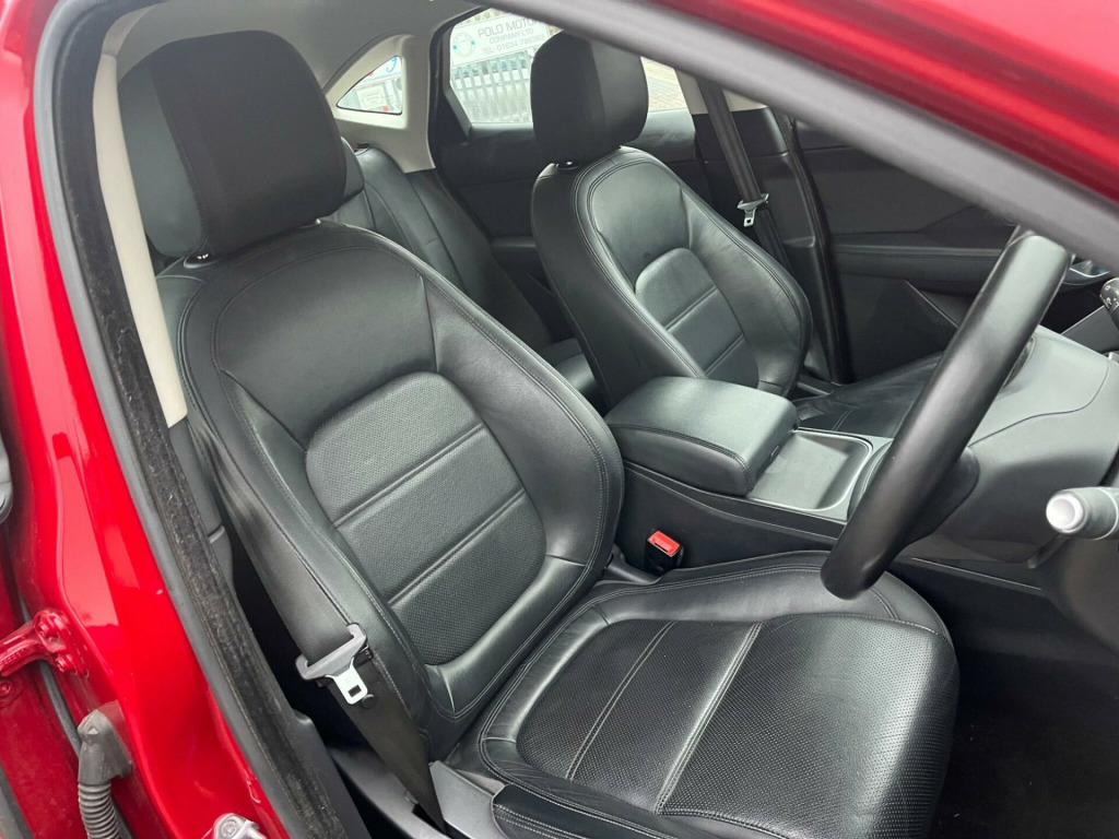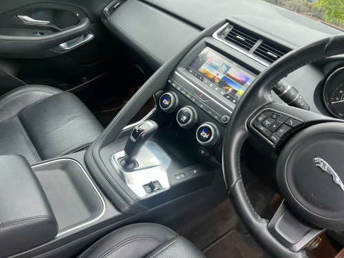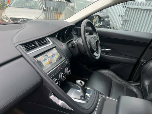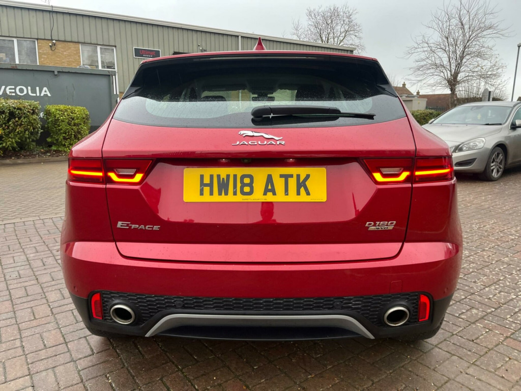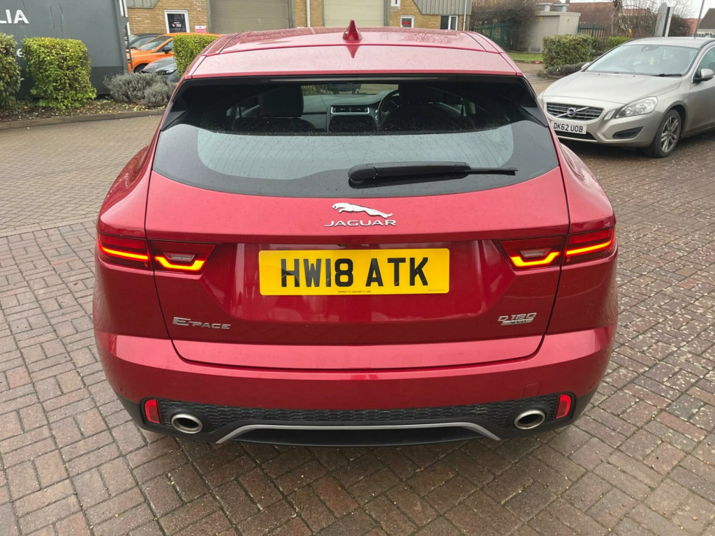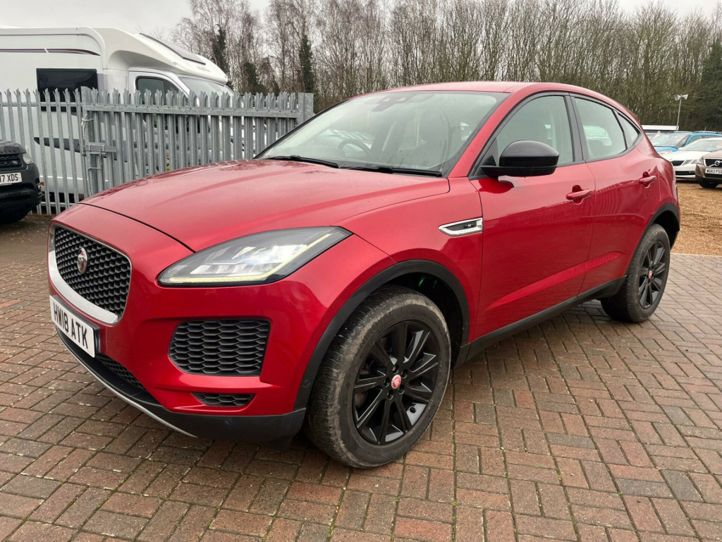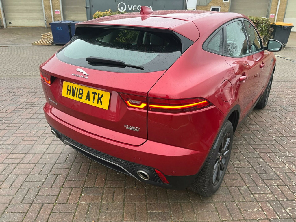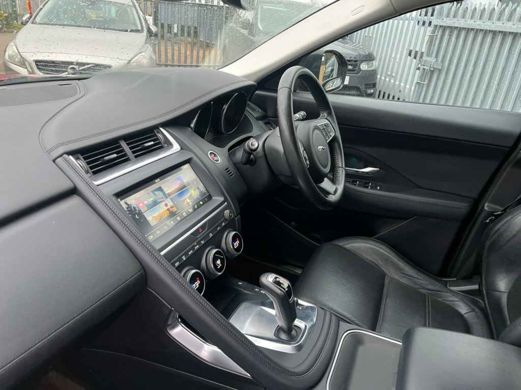 IN MET. RED WITH FULL BLACK LEATHER, 74,800 MILES WITH SERVICE HISTORY & 2 x KEYS, SAT NAV, This 2018 Jaguar E PACE D180 S is presented with a clear vehicle history check, offering peace of mind for its next owner. This stylish compact SUV features a 2.0 litre diesel engine paired with a smooth Four Wheel Drive system, meeting Euro 6 emissions standards. The S trim level includes convenient features such as 2 Zone Climate Control, Bluetooth connectivity for seamless audio and calls, and automatic headlights that adjust to lighting conditions. For easier manoeuvring, it is equipped with a rear view camera and a Park Pack which includes both front and rear parking sensors.The Jaguar E PACE D180 S offers a compelling blend of performance and practicality. Its acceleration from 0 to 60 miles per hour in just 8.6 seconds demonstrates its responsive nature, making it a capable performer on the road. Furthermore, the generous boot space ensures that this vehicle is well suited for everyday tasks and longer journeys alike, providing ample room for luggage or shopping. These attributes, combined with its sophisticated Jaguar styling and the comprehensive S trim features, position this E PACE as a distinguished choice within its class. -way electric front seats, 10in touch pro, 18in alloy wheels - 9 spoke style 9008, 2-zone climate control, 3-flash lane change indicators, 360 degree parking aid, 5in display with instrument panel, 60-40 split fold rear seat, abs - anti-locking braking system, aspc - all surface progress control, airbags - front side, airbags - full length side window curtain, approach illumination, auto-dimming - power fold - heated door mirrors with approach lights, auto-dimming interior rear view mirror, automatic headlights, bluetooth connectivity, body coloured roof, cbc - cornering brake control, centre console cubby box, centre console with armrest, chrome side vents, connect pro pack, cruise control with speed limiter, customer configurable autolock, dab radio, driver condition monitor, dynamic stability control and traction control, dynamic volume control, eba - emergency brake assist, ebd - electronic brake-force distribution, ebl - emergency brake lights, eco driving style assistant, epas - electric power assisted steering, epb - electric parking brake, electric windows - front and rear with one-touch open-close and anti-trap, emergency braking, front airbags with passenger seat occupant detector, heated front windscreen, heated rear window, heated washer jets, hill launch assist, hooks in loadspace, intrusion sensor - perimetric and volumetric protection, jaguar optimised assistance, jaguardrive control, led headlights with signature daytime running lights, led tail lights, lane keep assist, leather steering wheel, light oyster morzine headlining, loadspace cover, loadspace elasticated side-strap, loadspace lighting, loadspace storage net, locking wheel nuts, low traction launch, luggage tie downs in loadspace, manual tailgate, metal treadplates with jaguar script, navigation pro system, overhead lighting console, park assist, park pack, passive front head restraints, pedestrian airbag system, power operated child locks, power sockets, push button start, rsc - roll stability control, rain sensing windscreen wipers, rear fog lights, rear isofix, rear view camera, remote, remote control central locking, sos emergency call, satin black side window surround, seat belt reminder, second row air vents, smartphone pack, sound system - 125w, sunvisors with illuminated vanity mirrors, tailgate spoiler, torque vectoring by braking - tvbb, traffic sign recognition with adaptive speed limiter, trailer stability assist, trip computer, twin front cupholders with cover, twin tailpipes, tyre pressure monitoring system, tyre repair system, voice control