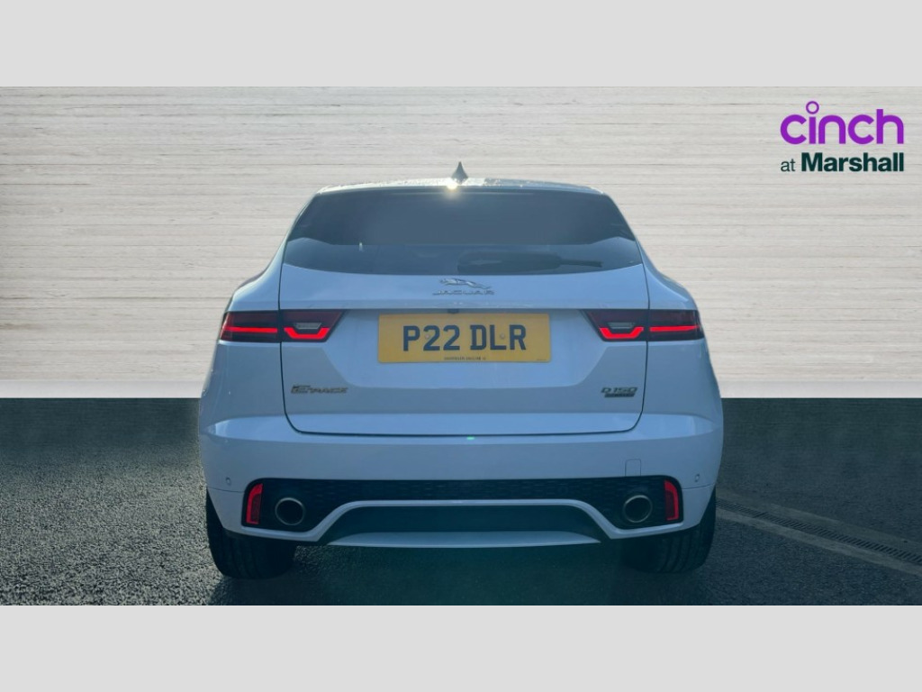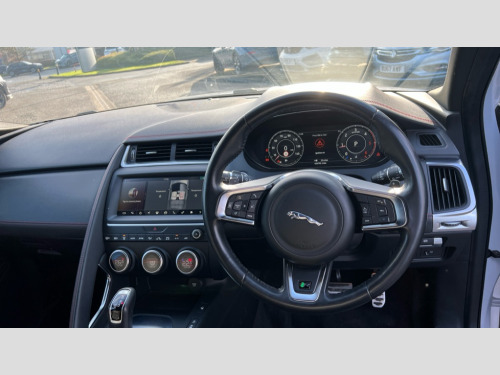 Jaguar E-Pace 2.0d Chequered Flag Edition 5dr Auto Driver condition monitor, Eco driving style assistant, Electric power assisted steering, InControl remote, InControl Touch navigation pro, Interactive Driver display instrument cluster, Lane keep assist, Misfuelling protection device, Outside temperature gauge, Push button starter, Speed proportional steering, Start up sequence with movement in dials and lighting, Traffic sign recognition with adaptive speed limiter, Trip computer, Voice control system, Diesel particulate filter, Efficient Driveline, Passive suspension, AM/FM DVD MP3 radio, Bluetooth connectivity including audio streaming, DAB Digital radio, Dynamic volume control, 3 flash lane change indicators, Approach Illumination, Auto dimming rear view mirror, Automatic headlights, Body colour side cladding, Chequered Flag badge in side vents, D150 AWD badge, E Pace badge, Electric front/rear windows with one touch/auto up/down, Fixed panoramic glass sunroof, Front fog lights, Heated front windscreen, Heated rear window with timer, Heated washer jets, Jaguar script and leaper, Metal treadplates with Chequered Flag branding, R Dynamic body colour bumpers, Rain sensor windscreen wipers, Rear fog lights, Tailgate/boot lid spoiler, Twin tailpipes with finishers, 12V power socket in rear, 2nd row 60/40 split/fold, 2nd row air vents, 3 seat bench in 2nd row, 4 Load area hooks, Black gearshift paddles, Bright metal pedals, Centre armrest console, Centre headrest in row 2, Ebony morzine headlining, Elasticated loadspace side strap, Front head restraints, Grained Leather upholstery with front sports seats, ISOFIX on outer rear seats, JaguarDrive selector, LED lighting in overhead console, Loadspace cover, Loadspace lamp, Passive front headrests, R branded leather steering wheel, Storage net in luggage compartment, Sunvisors with illuminated vanity mirrors, Tie down hooks in luggage area, Twin front cupholders, Two zone climate control, Black exterior pack - E-Pace, Connect pro pack - E-Pace, Smartphone pack - E-Pace, 3x3 point rear seatbelts, ABS, All surface progress control (ASPC), Customer configurable autolock, DSC - Dynamic Stability Control, Electronic brake force distribution, Electronic parking brake, Emergency brake assist, Front airbags with passenger seat occupant detector, Front and rear curtain airbags, Front and rear seatbelt reminder, Front side airbags, Hill start assist, Low friction launch, Power child locks, Torque vectoring brake, Tyre pressure monitoring system, Intrusion sensor and alarm, Keyless entry, Locking wheel nuts