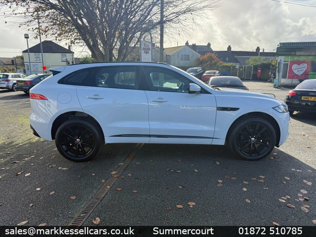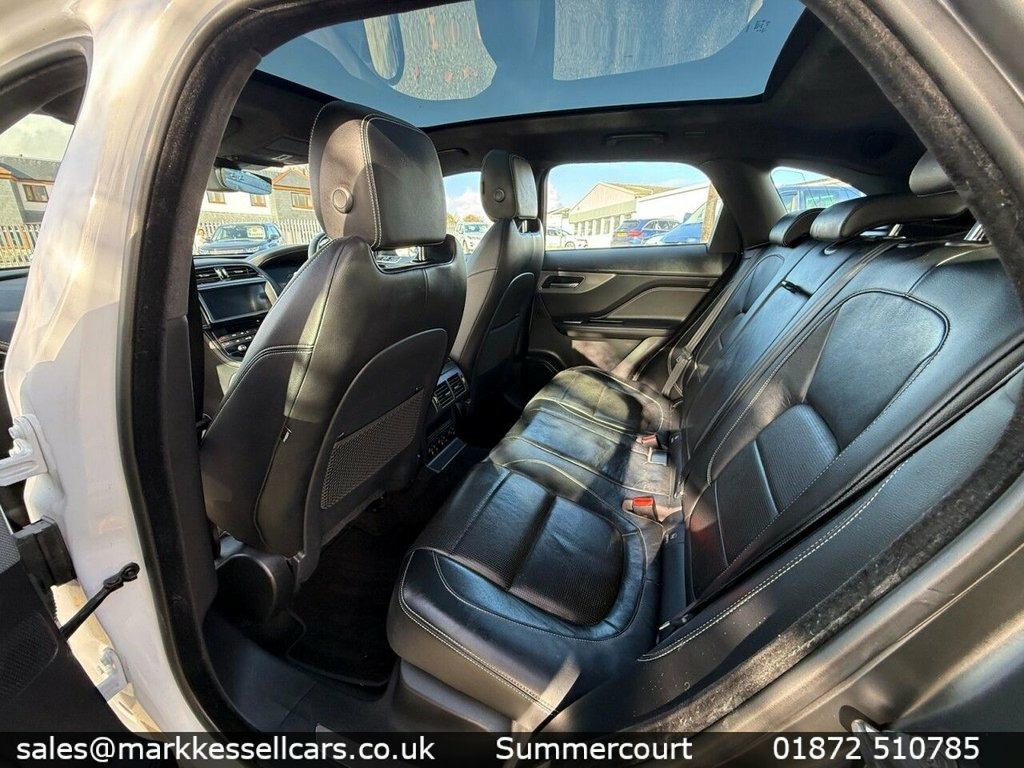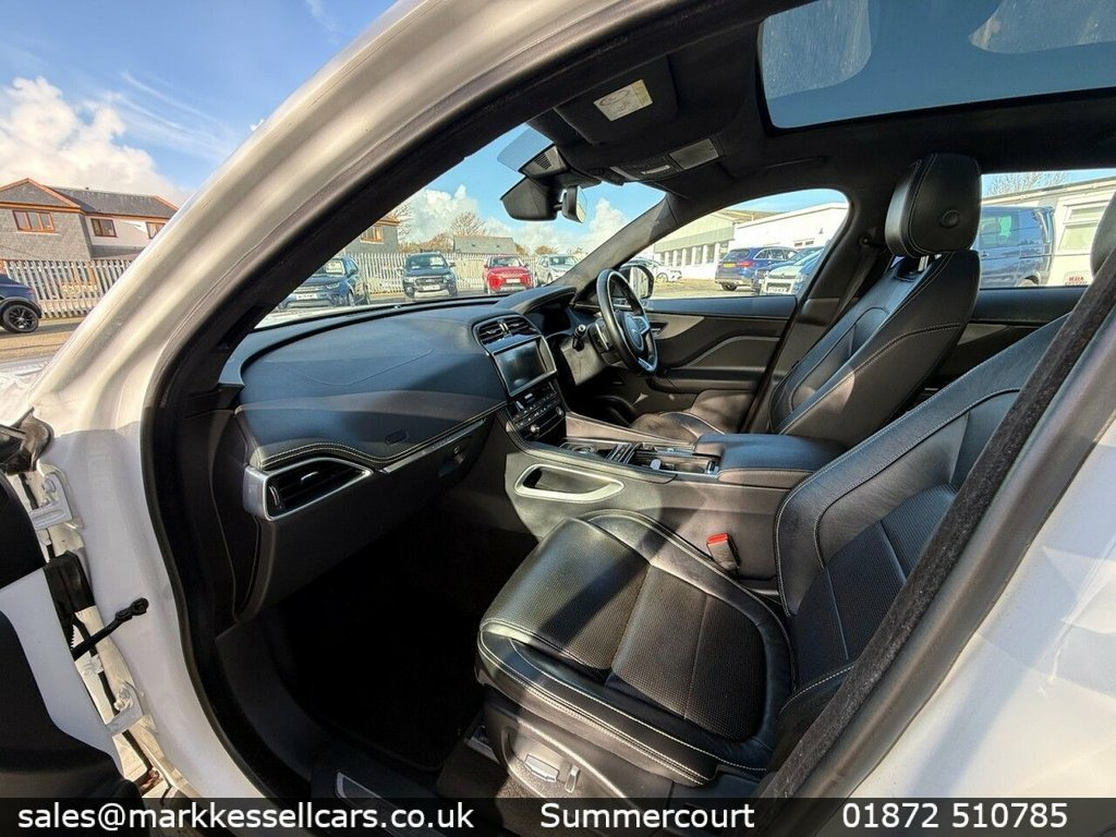 Stunning Jaguar F Pace with great spec , low miles with FDSH Yulong White, Perforated Grained Leather - Ebony-Light, Heated Front Seats, 20in Alloy Wheels - 5 Split-Spoke Style , Fixed Panoramic Roof, Rear Camera, Navigation Pro, 10in Touch Pro, 2-Zone Climate Control, Apple CarPlay, Cruise Control with Speed Limiter, Xenon Headlights with LED Signature, 40-20-40 Split Fold Rear Seat, 10-Way Electric Front Seats, Heated Steering Wheel, ABS - Anti-locking Braking System, AM-FM Radio, ASPC - All Surface Progress Control, Airbags - Front Side, Airbags - Full Length Side Window Curtai, Ambient Interior Lighting, Android Auto, Approach Illumination, Auto-Dimming Interior Rear View Mirror, Bluetooth Connectivity, Bluetooth Streaming, Body Coloured Door Mirr