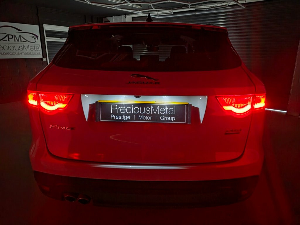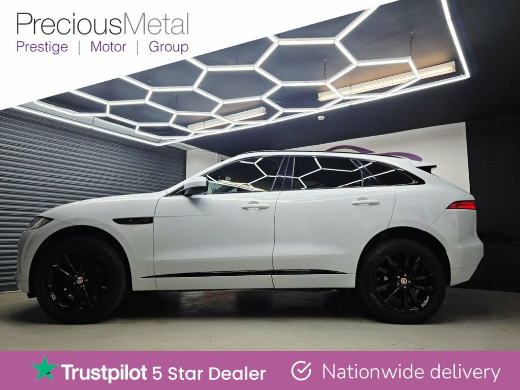 This 2019 Jaguar F-PACE D180 Chequered Flag boasts a full service history and an MOT valid until August 2026, offering peace of mind for its next owner. This stylish SUV features a powerful 2.0L diesel engine paired with a four wheel drive system, ensuring confident performance in all conditions. As a Euro 6 compliant vehicle, it meets stringent emission standards. The Chequered Flag trim level adds distinctive touches, and with a clear vehicle history check, you can be assured of its excellent provenance. Experience the impressive acceleration of this F-PACE, reaching 0-60mph in just 8.4 seconds, a testament to its dynamic capabilities. This performance, combined with its substantial 2400 kg towing weight, makes it a versatile choice for both daily driving and more demanding tasks. The comprehensive service history and long MOT validity further highlight its well maintained condition, setting it apart from other vehicles in its class. Privacy Glass, Yulong White, Perforated Grained Leather - Ebony-Light, Meridian Surround Sound System, 20in Alloy Wheels - 5 Spoke Style 5035 w, 10-Way Electric Front Seats, 10in Touch Pro, 2-Zone Climate Control, 20d AWD Badge, 20in Alloy Wheels - 5 Split-Spoke Style , 3-Flash Lane Change Indicators, 325mm Front Brakes, 40-20-40 Split Fold Rear Seat, ABS - Anti-locking Braking System, AM-FM Radio, ASPC - All Surface Progress Control, Airbags - Front Side, Airbags - Full Length Side Window Curtai, Ambient Interior Lighting, Android Auto, Apple CarPlay, Approach Illumination, Auto-Dimming Interior Rear View Mirror, Bluetooth Connectivity, Bluetooth Streaming, Body Coloured Door Mirror Caps, B