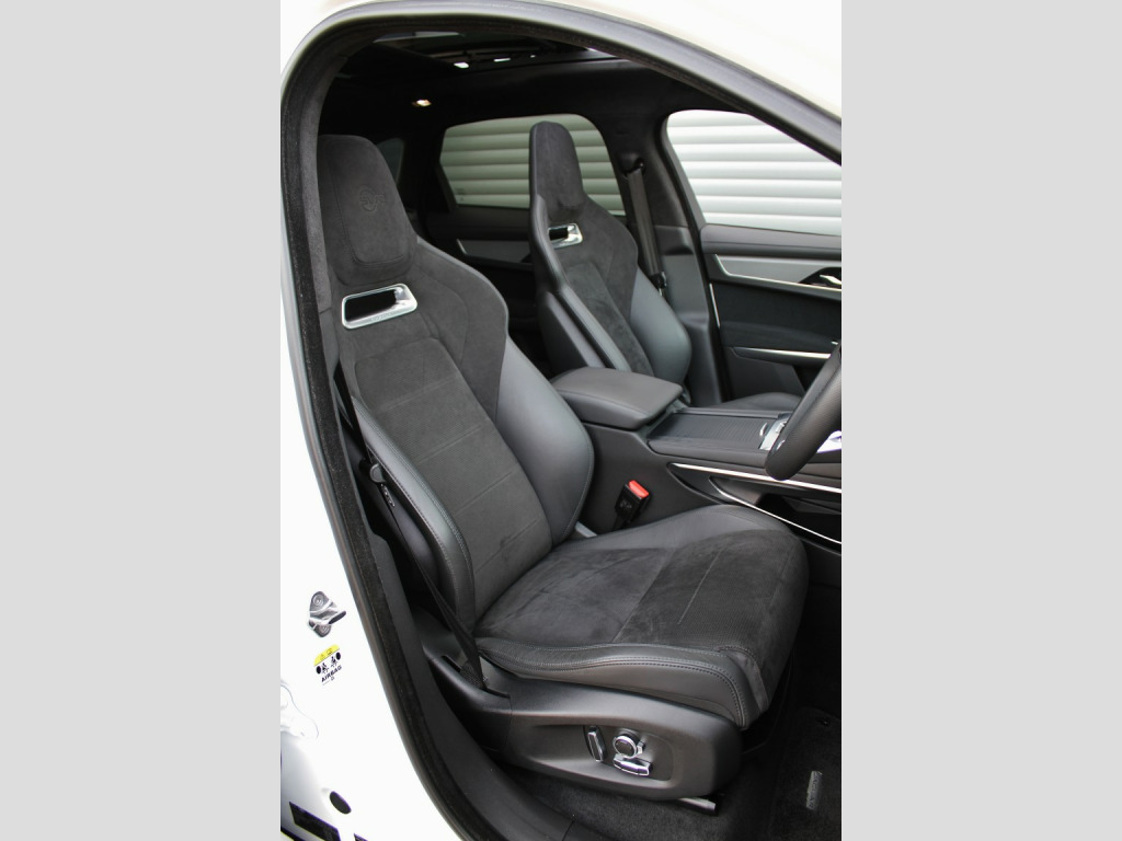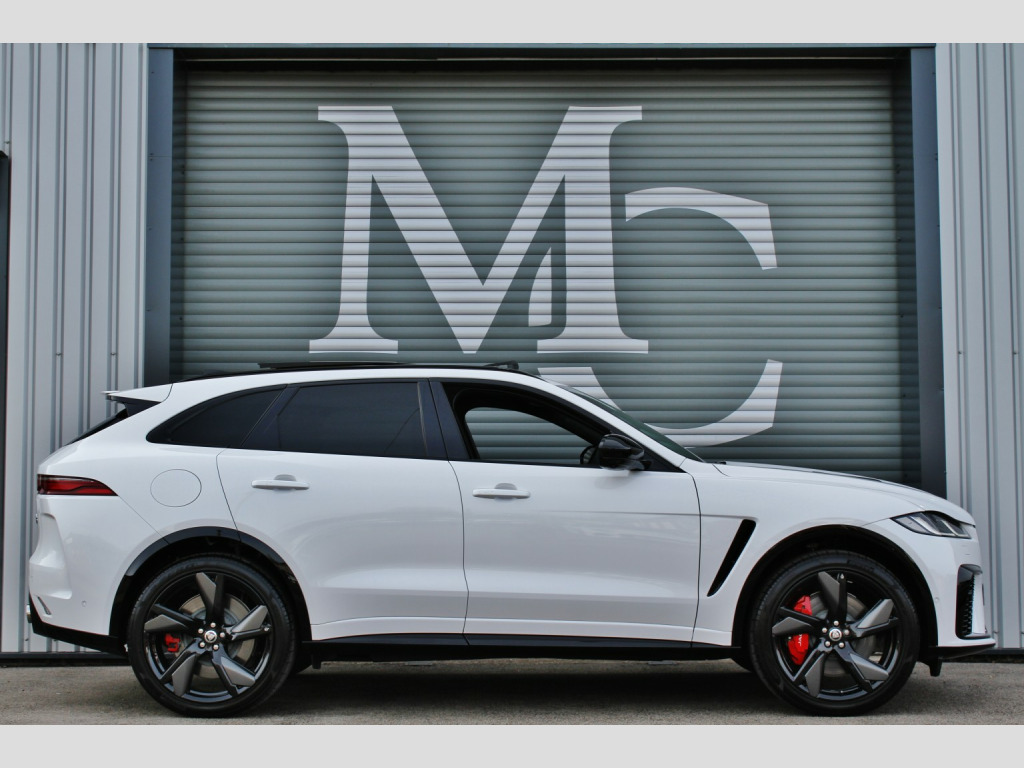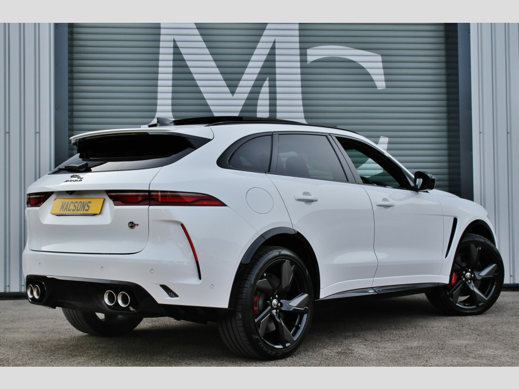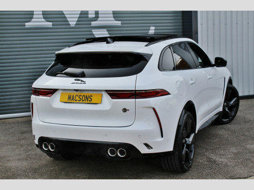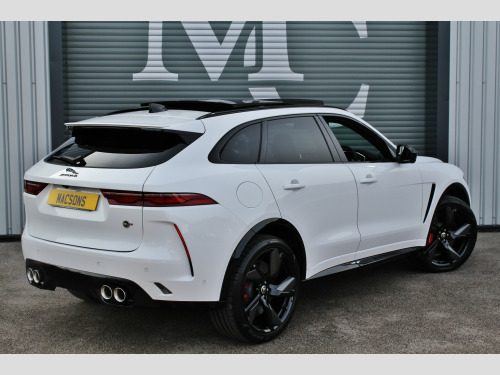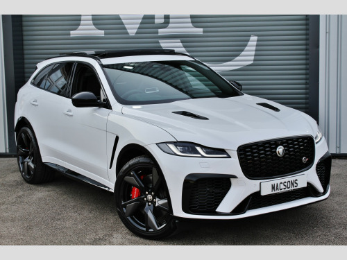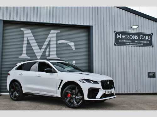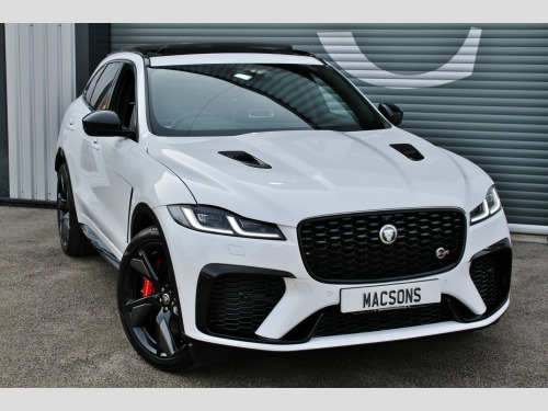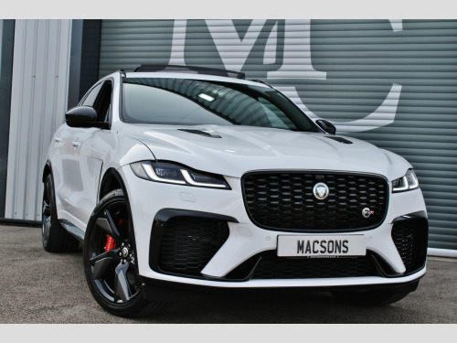 We are very proud to be presenting this F-Pace SVR 550 in Ostuni White Metallic with a staggering low mileage of only 1,900 Miles. Immaculately presented with One Private owner from new, Jaguar Warranty till 27-09-2027 and supported by a Full Jaguar Service history, last completed on the 09/10/2025 at 1,715 Miles. Comes specified with a huge selection of optional extras, some of these are including Panoramic Sliding Sun Roof, Heads-Up Display, 360 Camera System, Heated front and rear Seats and much more... , Upgrades: , - Head-Up Display, - Gloss Black Roof Rails, - Sliding Panoramic Roof, - Leather and Suedecloth - Ebony Suedecloth-Ebony Windsor Leather - Performance Seats with Ebony-Ebony Interior, - 14-Way Heated Electric Memory Performance Front Seats, - 2-Zone Climate Control, - 22in Alloy Wheels - Forged - 5 Split-Spoke Style 5117 - Gloss Black with Satin Technical Grey Insets, - 3 Rear Headrests, - 3D Surround Camera, - 40-20-40 SVR Folding Heated Rear Seats with Centre Armrest, - Adaptive Cruise Control with Steering Assist, - Adaptive Dynamics, - Android Auto, - Apple Car Play , - Animated Directional Indicators, - Auto High Beam Assist, - Auto-Dimming Interior Rear View Mirror, - Automatic Headlights, - Black Exterior Pack, - Blind Spot Assist, - Bright Metal Pedals, - Configurable Dynamics, - Digital Audio Broadcast - DAB - Radio, - Ebony Suedecloth Headlining, - Front and Rear Parking Aid, - Headlight Power Wash, - Heated - Electric - Power Fold Memory Door Mirrors with Approach Lights and Auto-Dimming Driver Side, - Heated Front Windscreen, - Heated Steering Wheel, - ISOFIX Rear, - Illuminated Metal Treadplates with Brand-Name Script, - Interactive Driver Display, - Keyless Entry, - Lane Keep Assist, - Meridian Sound System,, - Powered Tailgate - Boot Lid, - Premium Cabin Lighting, - Premium LED Headlights with Signature DRL, - Privacy Glass, - Red Brake Calipers, - SV Exterior Pack, - SVR Badge, - SVR Front Bumper with Lower Meshes, - SVR Front Fender with Functional Vents, - SVR Leather Steering Wheel, - SVR Lower Valance - Splitter, - SVR Luxury Carpet Mats, - SVR Vented Bonnet, - Secure Tracker , - Steering Column - Electrically Adjustable, - Switchable Active Sports Exhaust, - Traffic Sign Recognition with Adaptive Speed Limiter, - Trailer Stability Assist, - Tyre Pressure Monitoring System, - Wireless Device Charging. , Comes Complete with Both Keys and is HPI Clear. All specification is supplied by third party data and can be incorrect. Macsons Cars will not accept responsibility if any of the specification is incorrect, Please ask for confirmation on options. Opening Times, 9-6pm Monday to Friday , 10-1pm Saturday , Closed Sundays. Our prices are NOT Subject to any ADMIN FEEs.