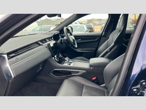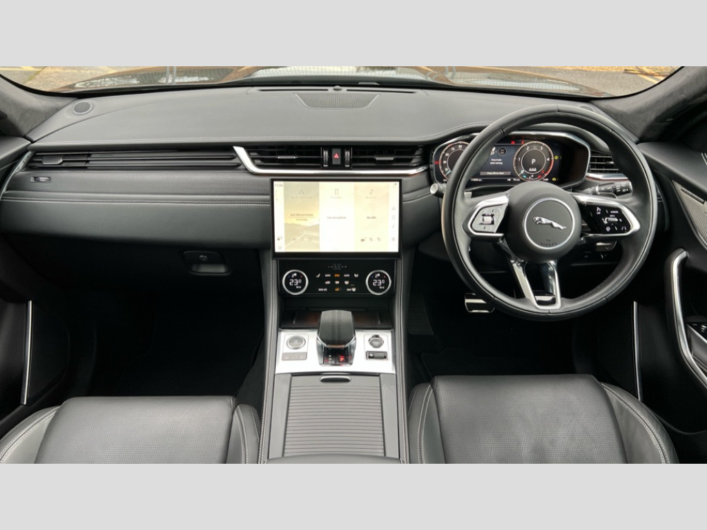 Jaguar F-PACE 2.0 D200 R-Dynamic HSE Black 5dr Auto AWD 11.4" touchscreen, Adaptive cruise control with steering assist, Android Auto, Apple car play, Blind spot assist, Bluetooth connectivity, Clear exit monitor, Driver alert system, Driver condition monitor, eCall emergency call system, Eco driving style assistant, Electric power assisted steering, InControl remote, Interactive driver display digital with 12" TFT display, Jaguar Toggle shift selector, Lane departure warning system, Lane keep assist, Outside temperature gauge, Personalisation profile management, Pivi pro connected navigation system with app interface and media storage, Pro services and wifi hotspot, Push button starter, Rear collision monitor, Rear traffic monitor, Service interval indicator, Speed proportional steering, Start up sequence with movement in dials and lighting, Traffic sign recognition with adaptive speed limiter, Trip computer, Voice control system, Wireless device charging, 8 speed automatic transmission, Adaptive dynamics, All terrain progress control, All Wheel Drive (AWD), Configurable dynamics, Open differential with torque vectoring by braking, AM/FM radio, Bluetooth streaming, DAB Radio (Digital Audio Broadcasting), Dynamic volume control, InControl apps, InControl protect, iPod integration, 3 flash lane change indicators, Animated directional indicators, Approach Illumination, Auto dimming rear view mirror, Auto high beam assist, Automatic headlights, Electric heated/power fold memory door mirrors with approach lights and auto dimming driver side, Electric windows with one touch open/close and anti trap, F-Pace and R Dynamic badge, Green tinted glass, Heated front windscreen + heated washer jets, Heated rear window with timer, Illuminated metal tread plates with Jaguar script, Jaguar script and leaper, LED High level third brake light, LED tail lights, Metal load space scuff plates, Non acoustic front windscreen, Privacy glass, R Dynamic badge on side door, Rain sensor windscreen wipers, Rear fog lights, Rear metal tread plates, Rear side wing doors, Rear wiper, Trailer stability assist, Variable front intermittent wipers, 12V power point front, 3 rear headrests, 3 seat bench in 2nd row, Additional power sockets - Two additional USB sockets in rear centre console and one 12V socket in trunk, Air distribution speed, Bright metal foot pedals, Centre armrest console, Centre console with side storage, Configurable cabin lighting, Deletion loadspace storage rails, Door sill tread plates, Ebony suede cloth headlining, Electrically adjustable steering column, Fold flat front seats, Front centre armrest with storage compartment, Front door storage space, Glovebox finisher with jaguar script, Heated steering wheel, Hooks in loadspace, Illuminated glovebox, Interior front door handles with separate locking switches, ISOFIX on outer rear seats, Jaguar sense, Leather steering wheel, Luggage tie downs in loadspace, Mist sensing, Multifunction steering wheel, Overhead lighting console, Overhead stowage for sunglasses, Passive front head restraints, Premium carpet mats, Rear air vents, Rear armrest with twin cupholders, Rear centre headrest, Rear door storage space, Reversible boot floor, Satin chrome gearshift paddles, Shopping bag hook, Single front passenger seat, Sunvisors with illuminated vanity mirrors, Twin front cupholders with cover, Online Pack with data plan - F-Pace, 355mm front brakes and 325mm rear brakes, 3x3 point rear seatbelts, ABS, All surface progress control (ASPC), Brake pad warning light, DSC - Dynamic Stability Control, Electric parking brake (EPB), Emergency brake assist, Front airbags with passenger seat occupant detector, Front and rear seatbelt reminder, Front side airbags, Full length side window curtain airbag, Hill launch assist, Power operated child locks, Traction control, Tyre pressure monitoring system, Immobiliser, Keyless entry, Keyless Start, Locking wheel nuts, Perimeter alarm, Remote central locking, Valet mode